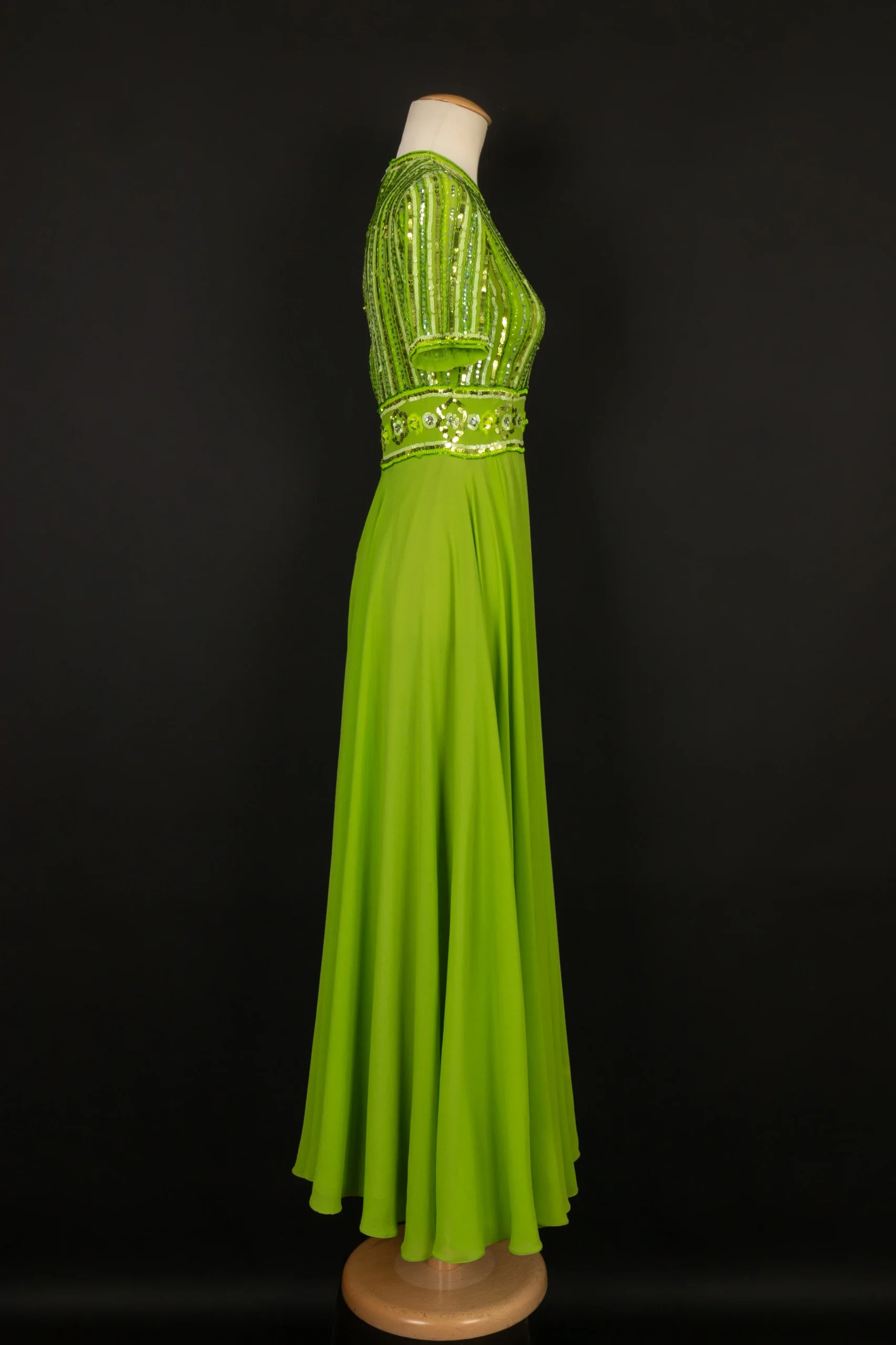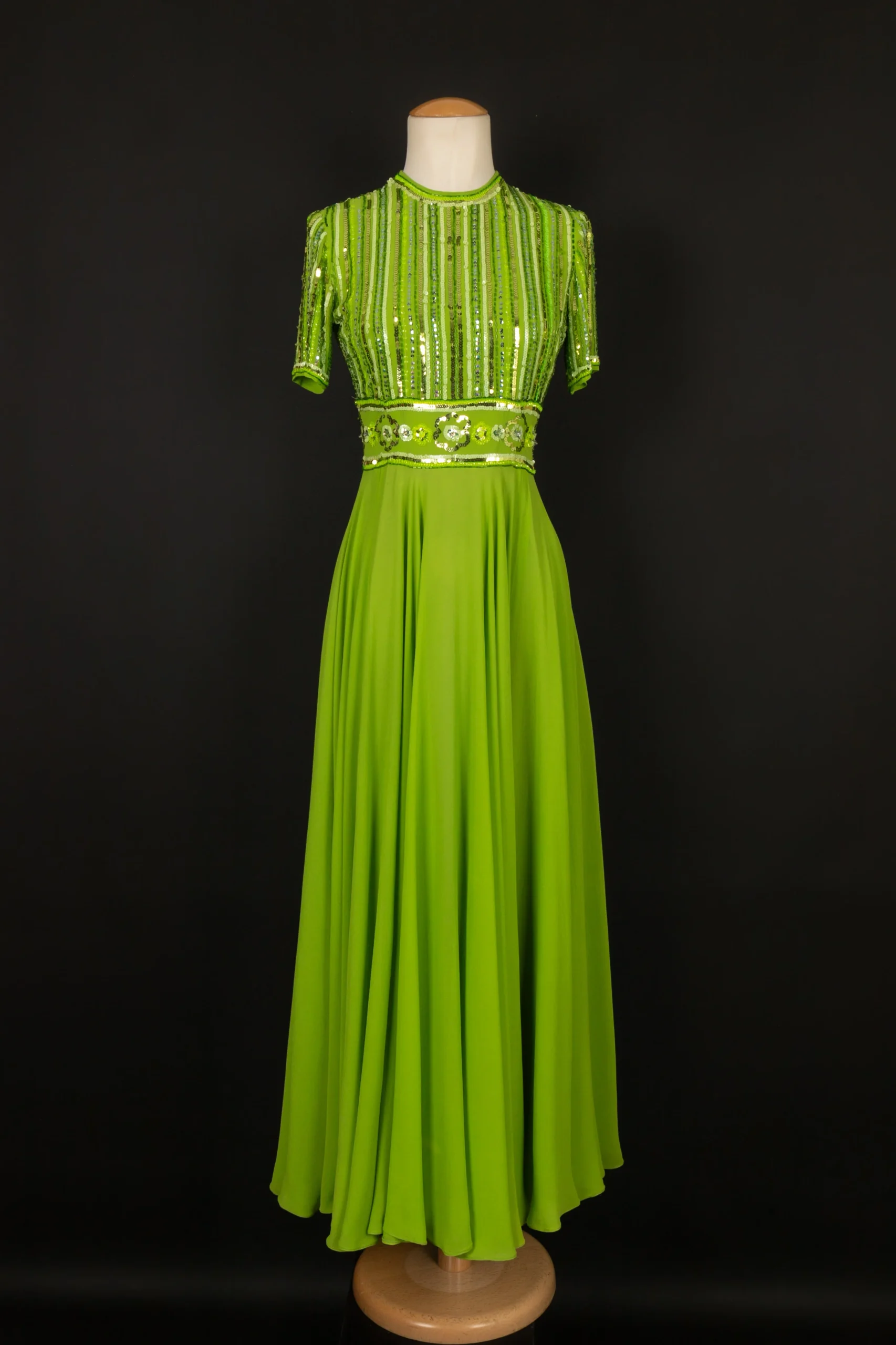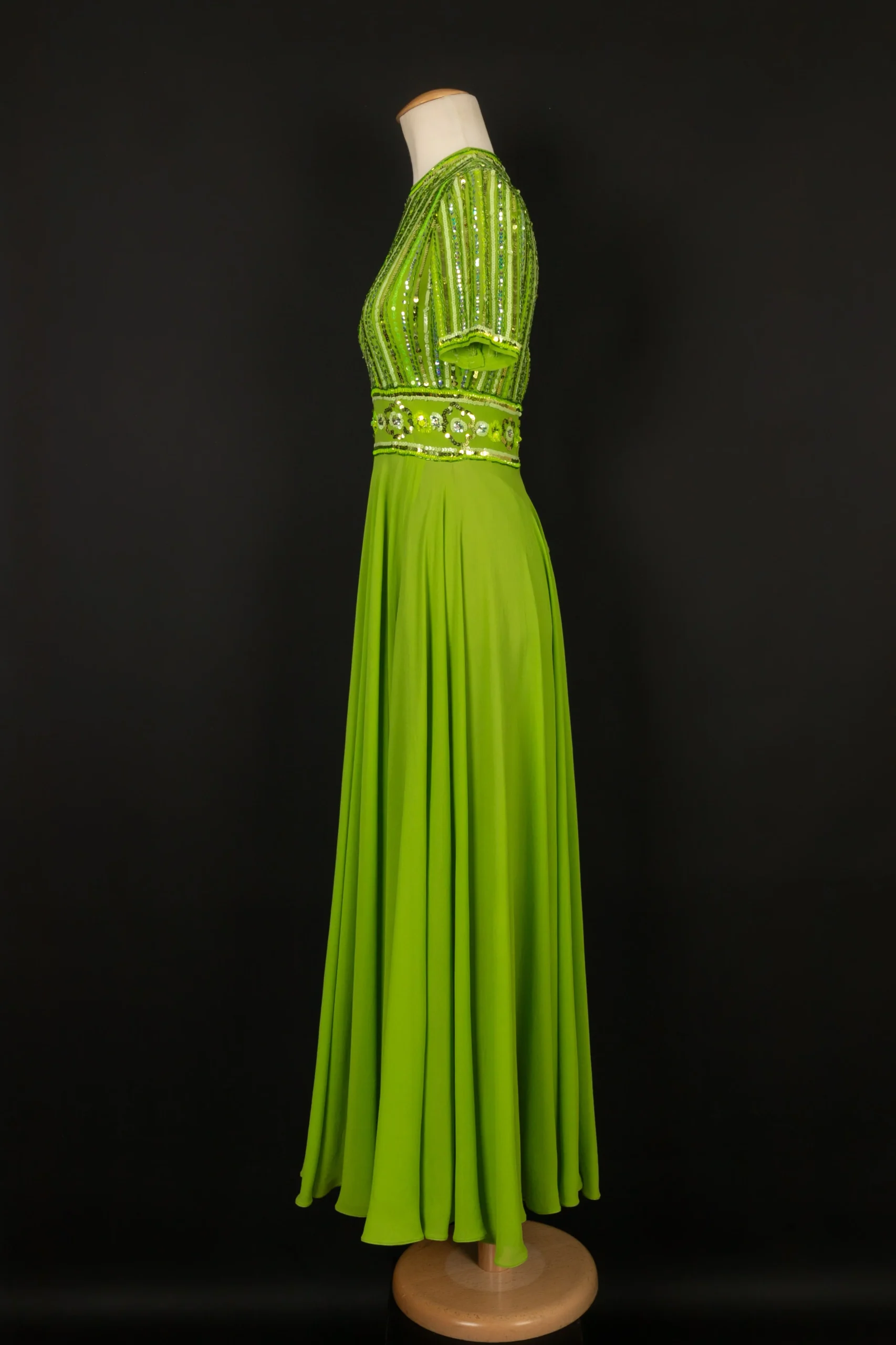 CARVEN -(Made in France) Robe en crêpe de soie verte, brodée de perles et paillettes. Pas de taille indiquée, elle correspond à un 36FR. Condition : Très bon état Dimensions : Épaules : 33 cm – Poitrine : 41 cm – Taille : 32 cm – Longueur : 132 cm