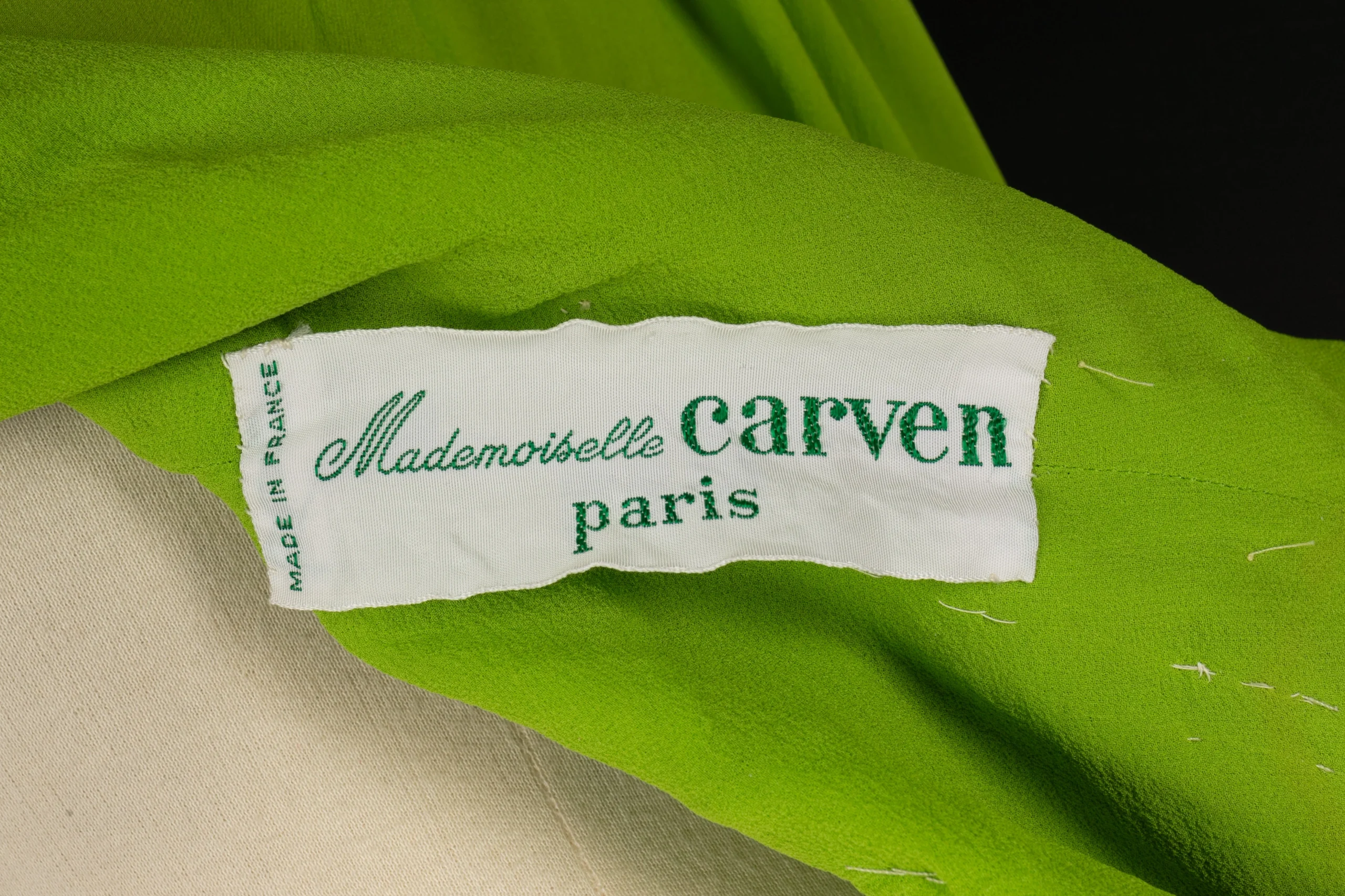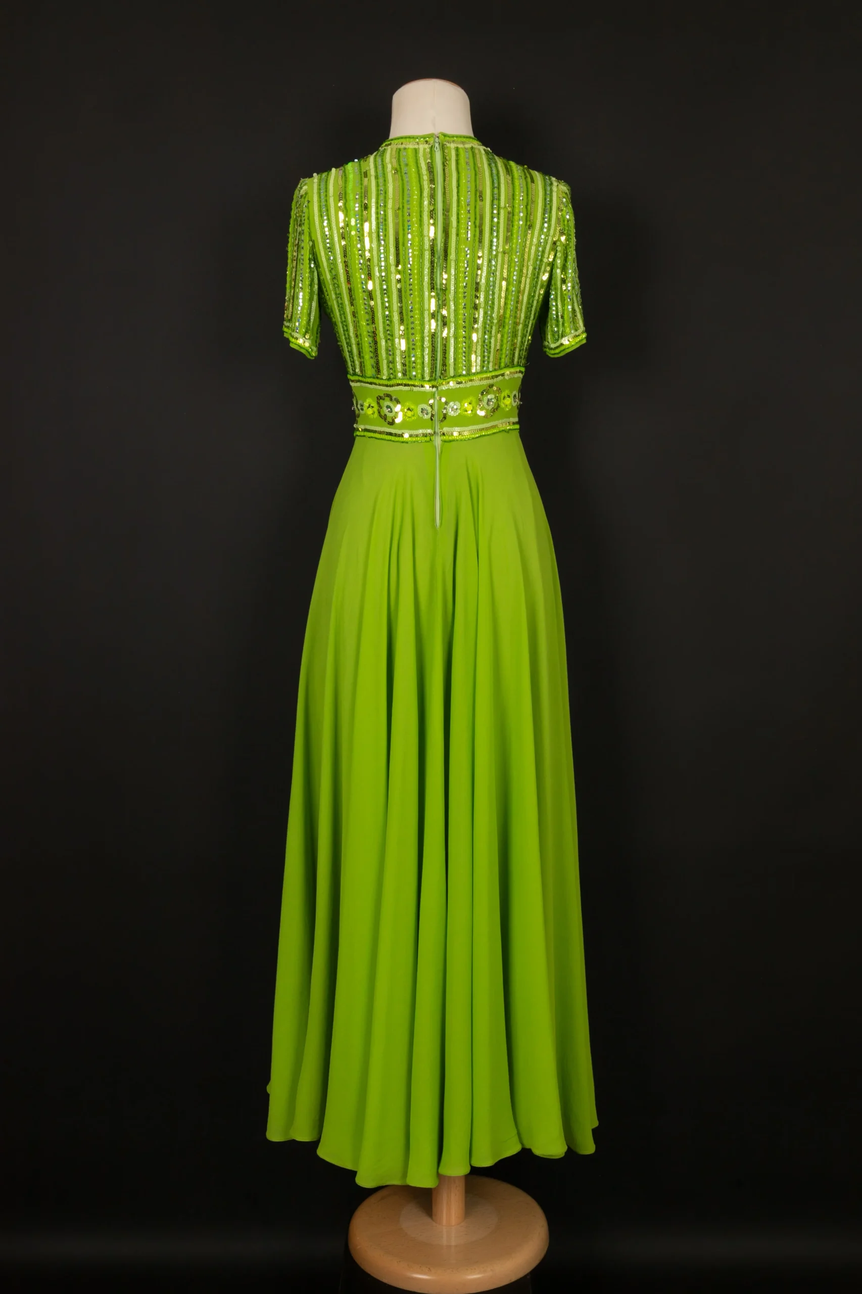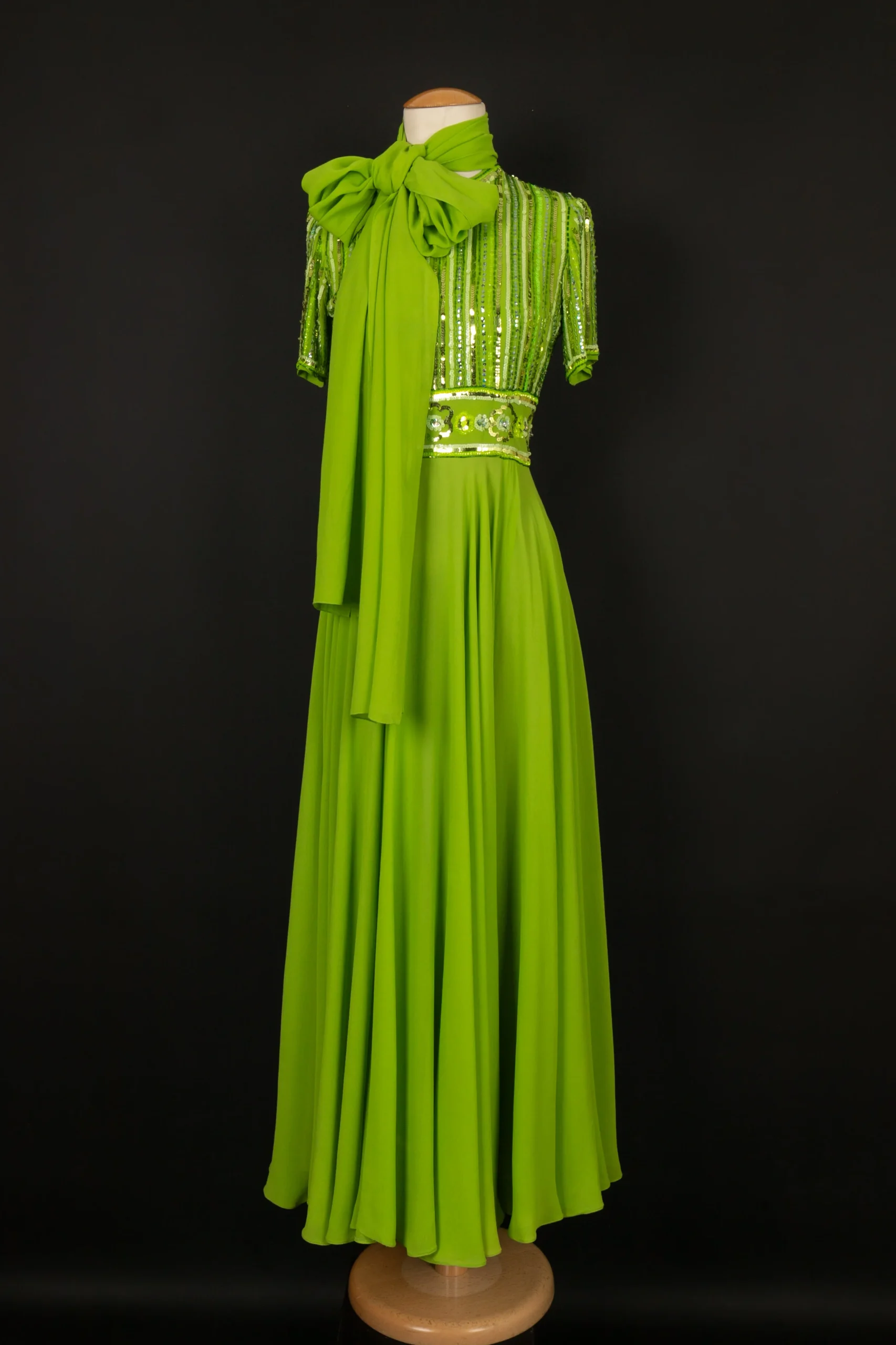 CARVEN -(Made in France) Robe en crêpe de soie verte, brodée de perles et paillettes. Pas de taille indiquée, elle correspond à un 36FR. Condition : Très bon état Dimensions : Épaules : 33 cm – Poitrine : 41 cm – Taille : 32 cm – Longueur : 132 cm