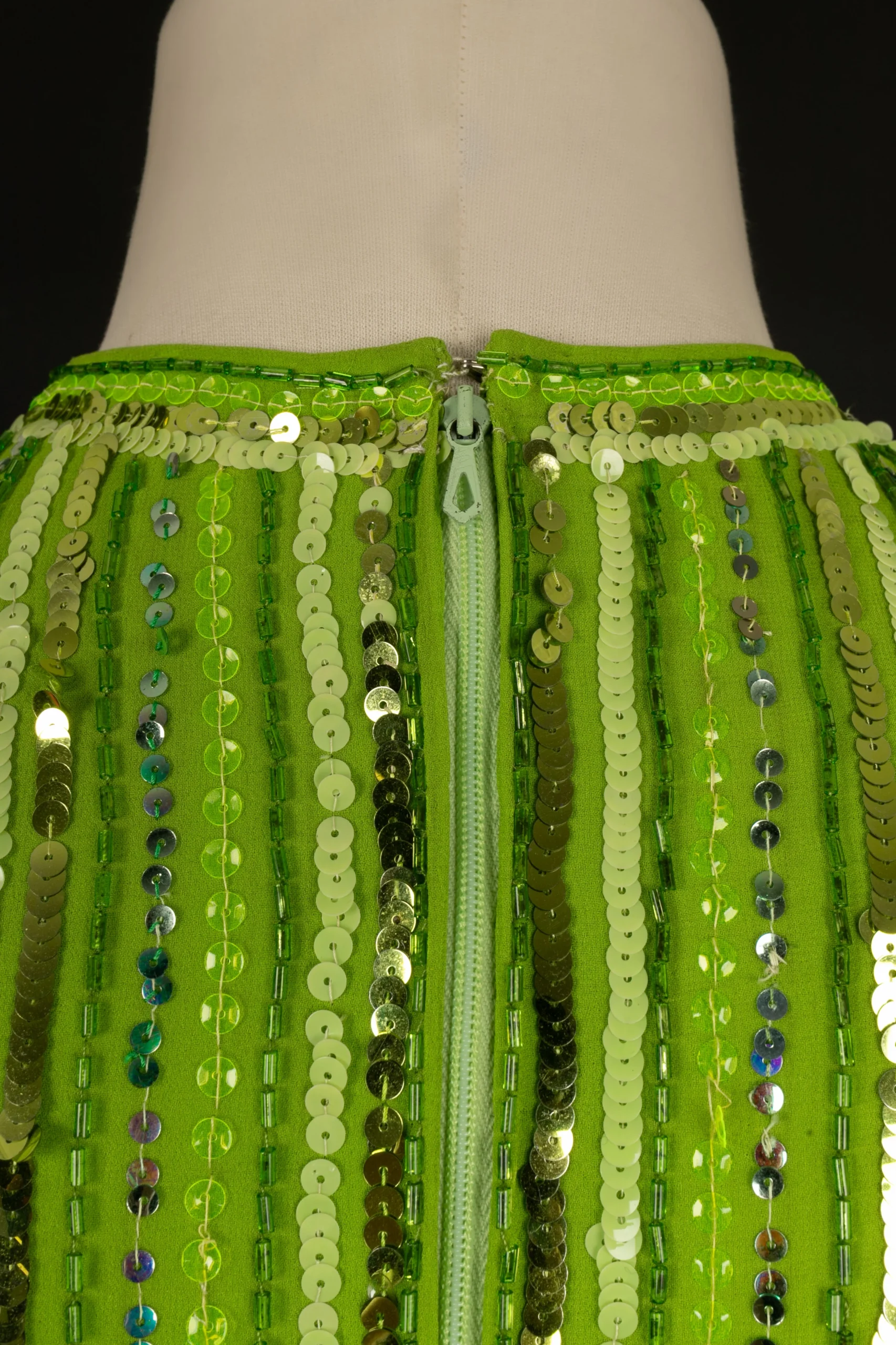 CARVEN -(Made in France) Robe en crêpe de soie verte, brodée de perles et paillettes. Pas de taille indiquée, elle correspond à un 36FR.