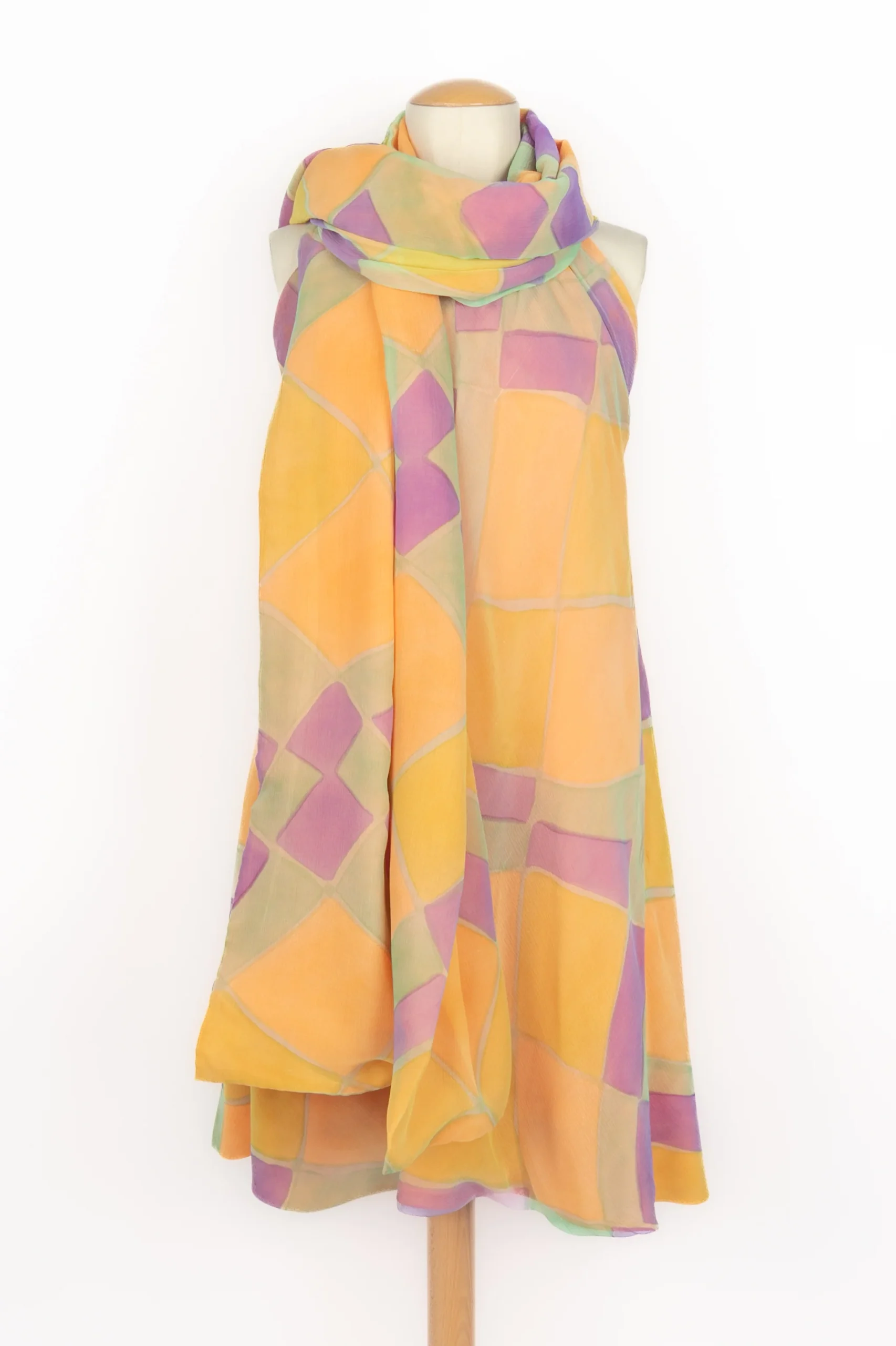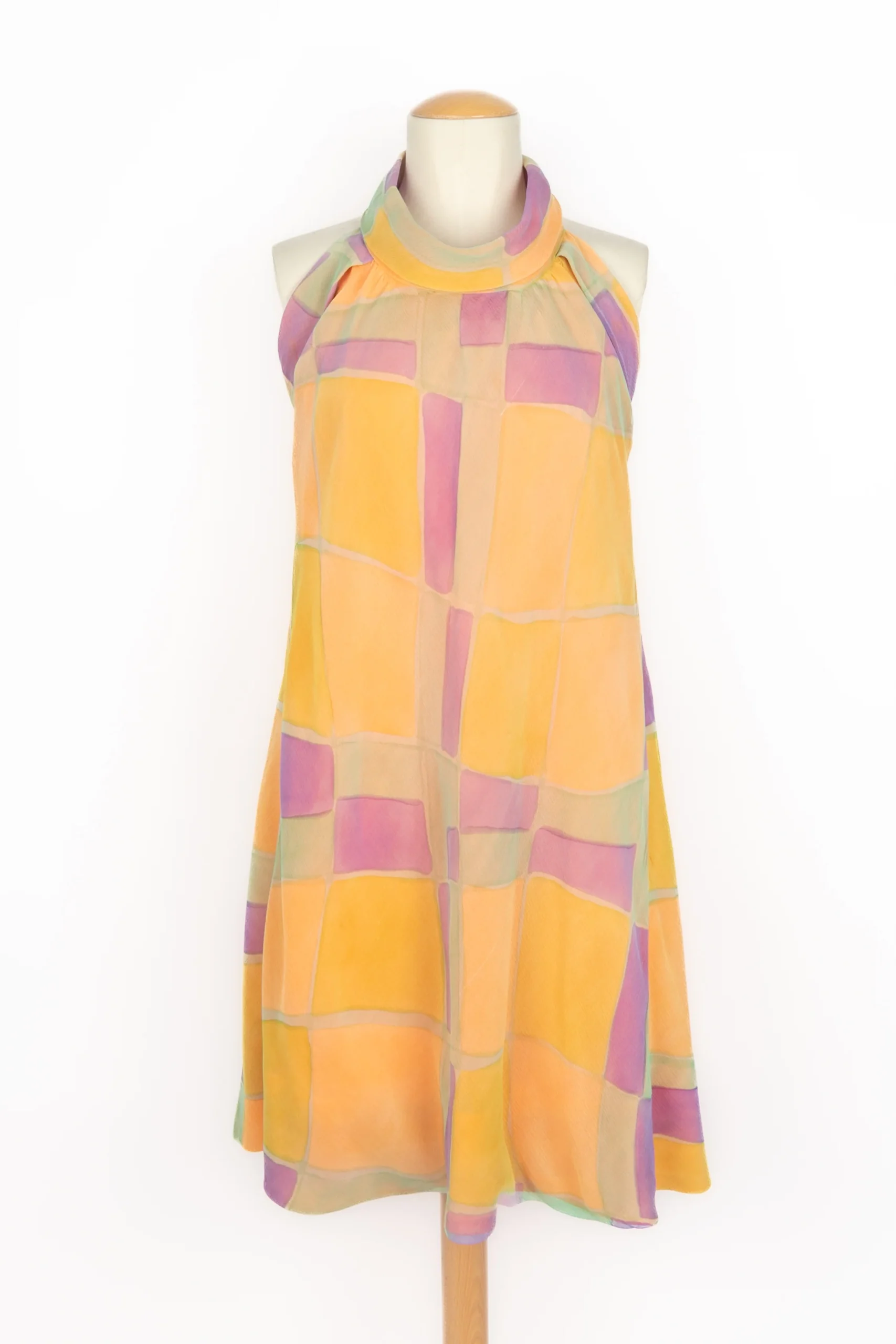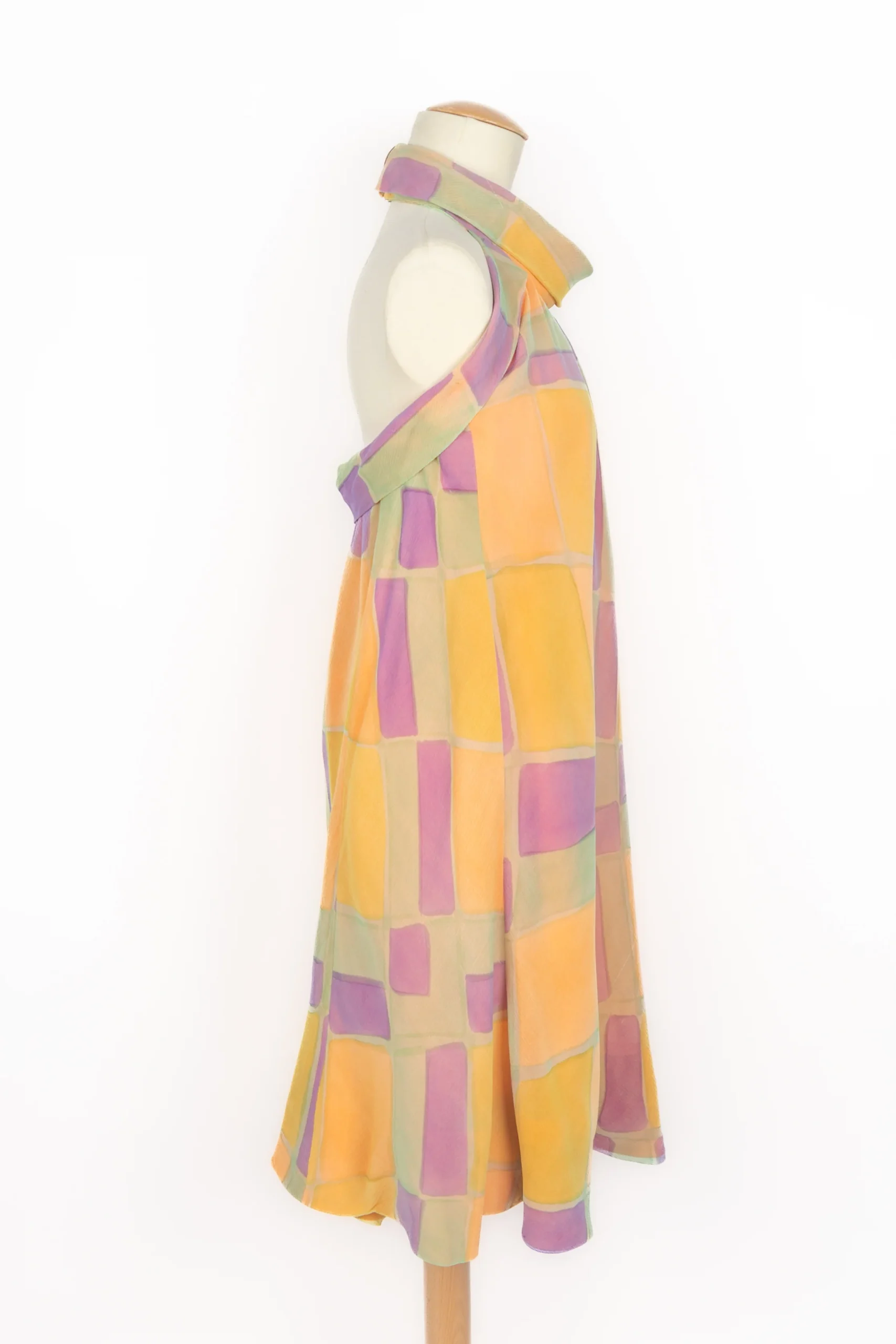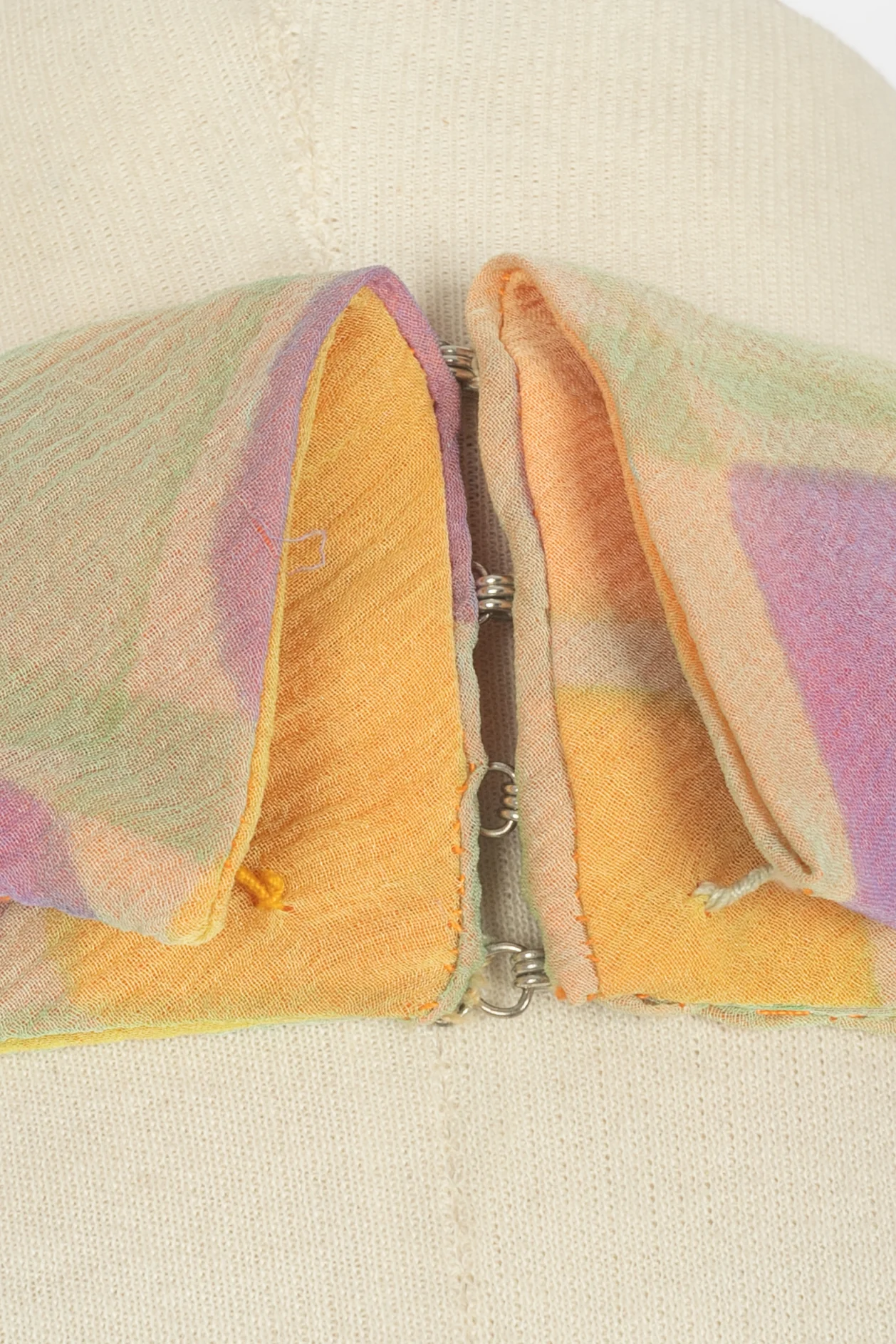 ANONYME – Robe courte en mousseline à motif dans les tons de jaune, de vert, de orange et de violet. Elle est accompagnée de son étole. Pas de taille indiquée, elle convient à un 34FR/36FR.