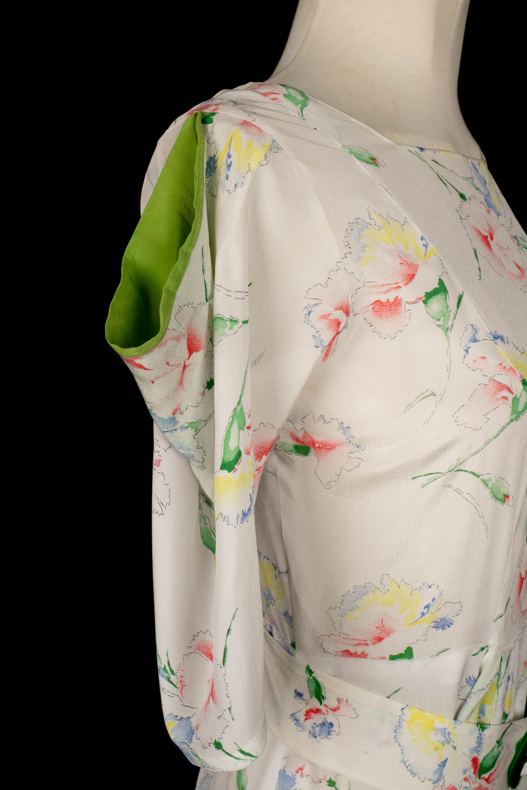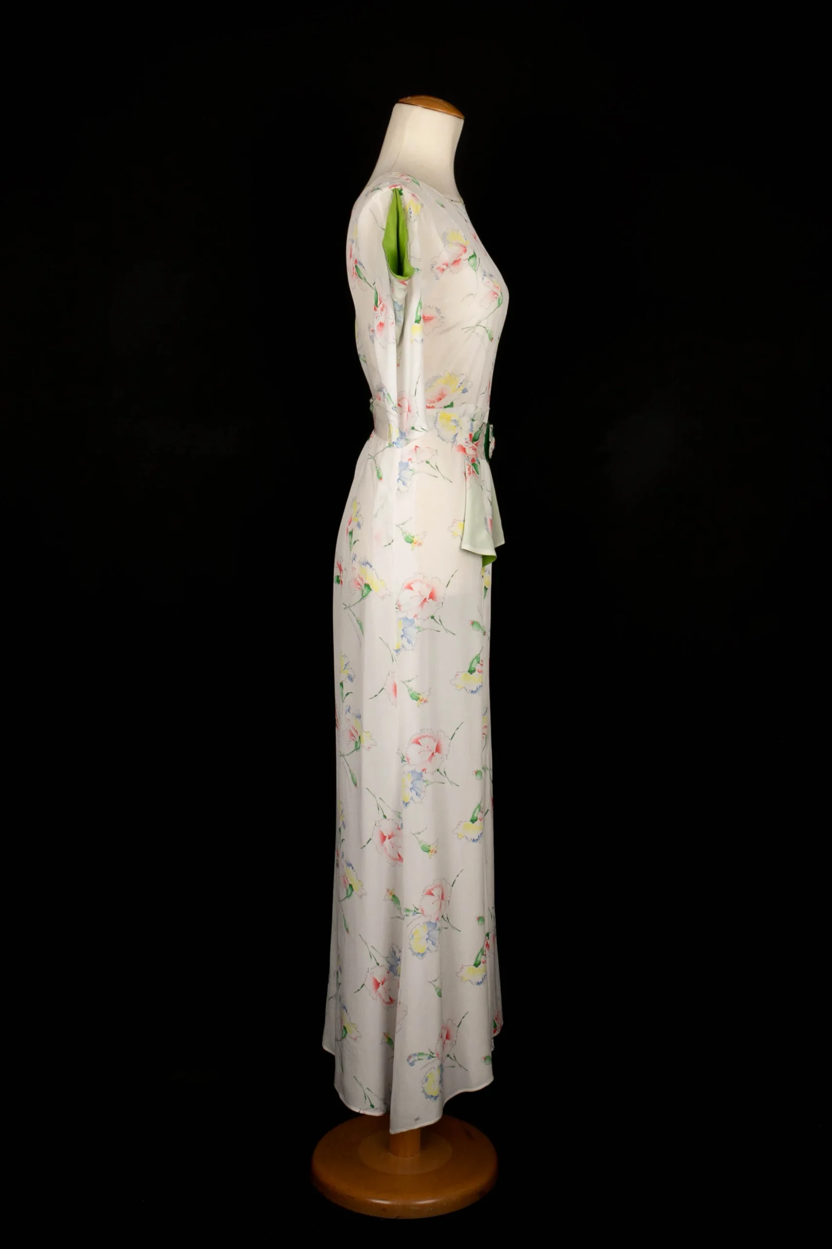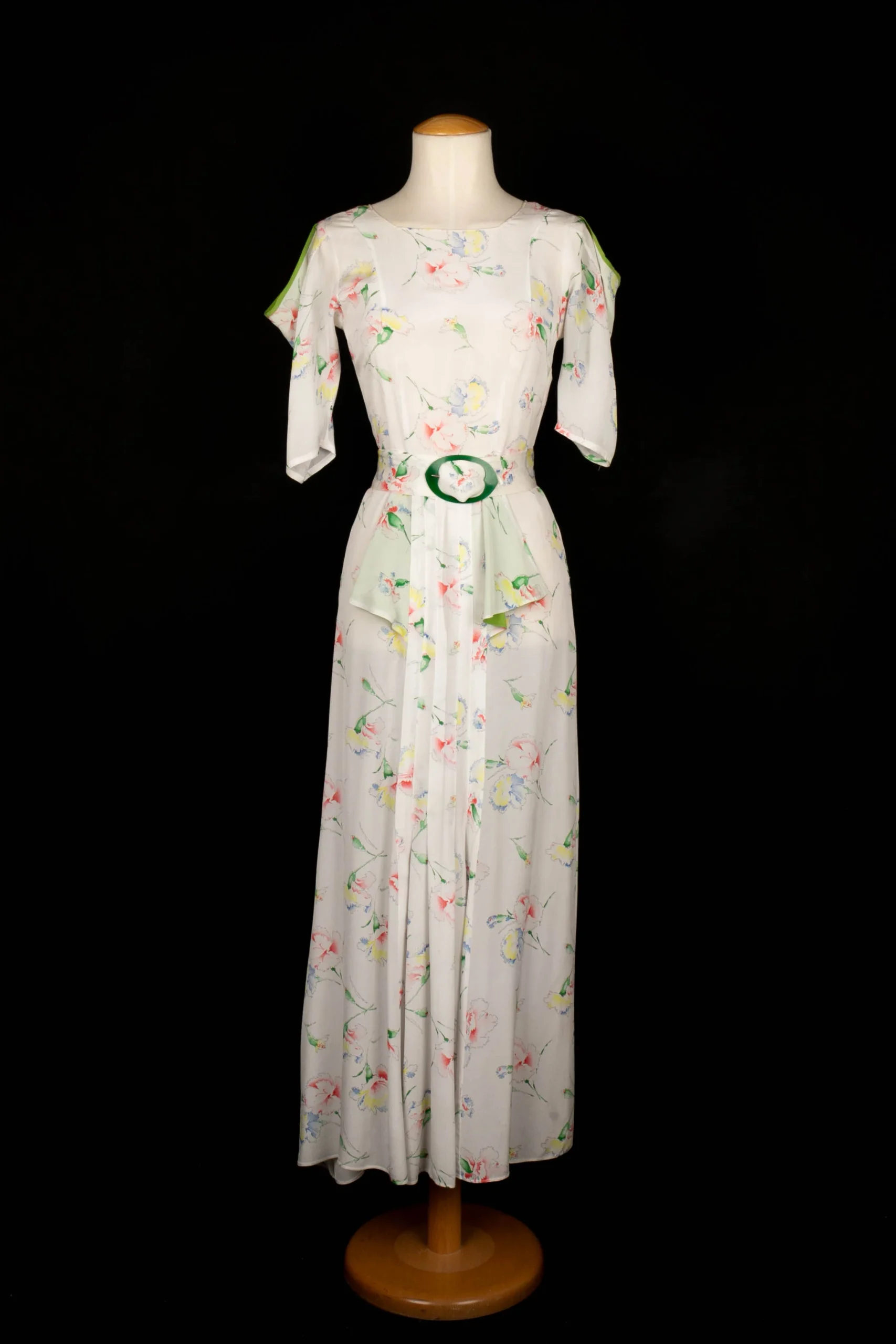 ANONYME -Robe longue vintage à motif floral sur fond blanc et ceinture. Pas de taille indiquée, elle convient à un 34FR/36FR. Robe vintage années 1930/1940.