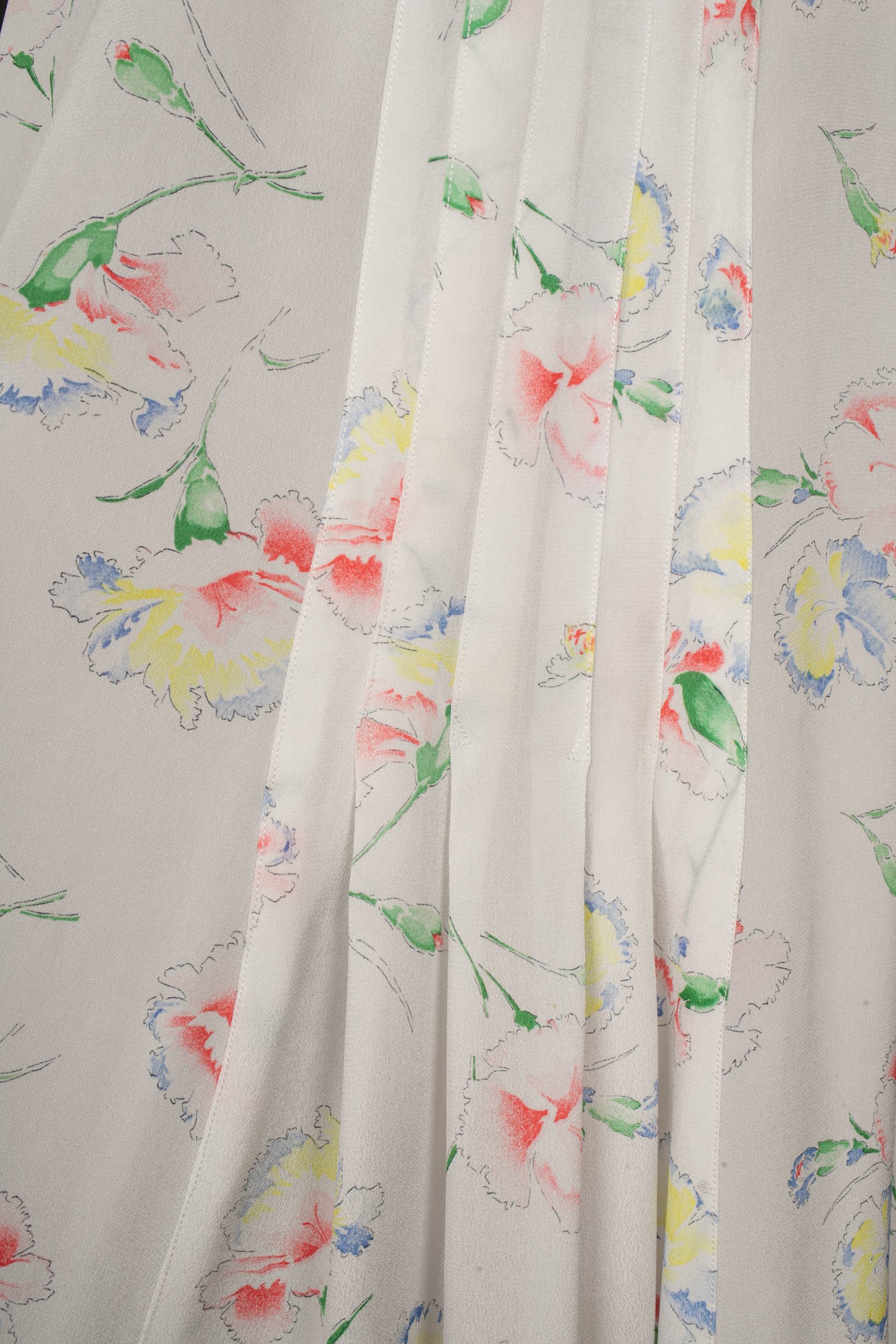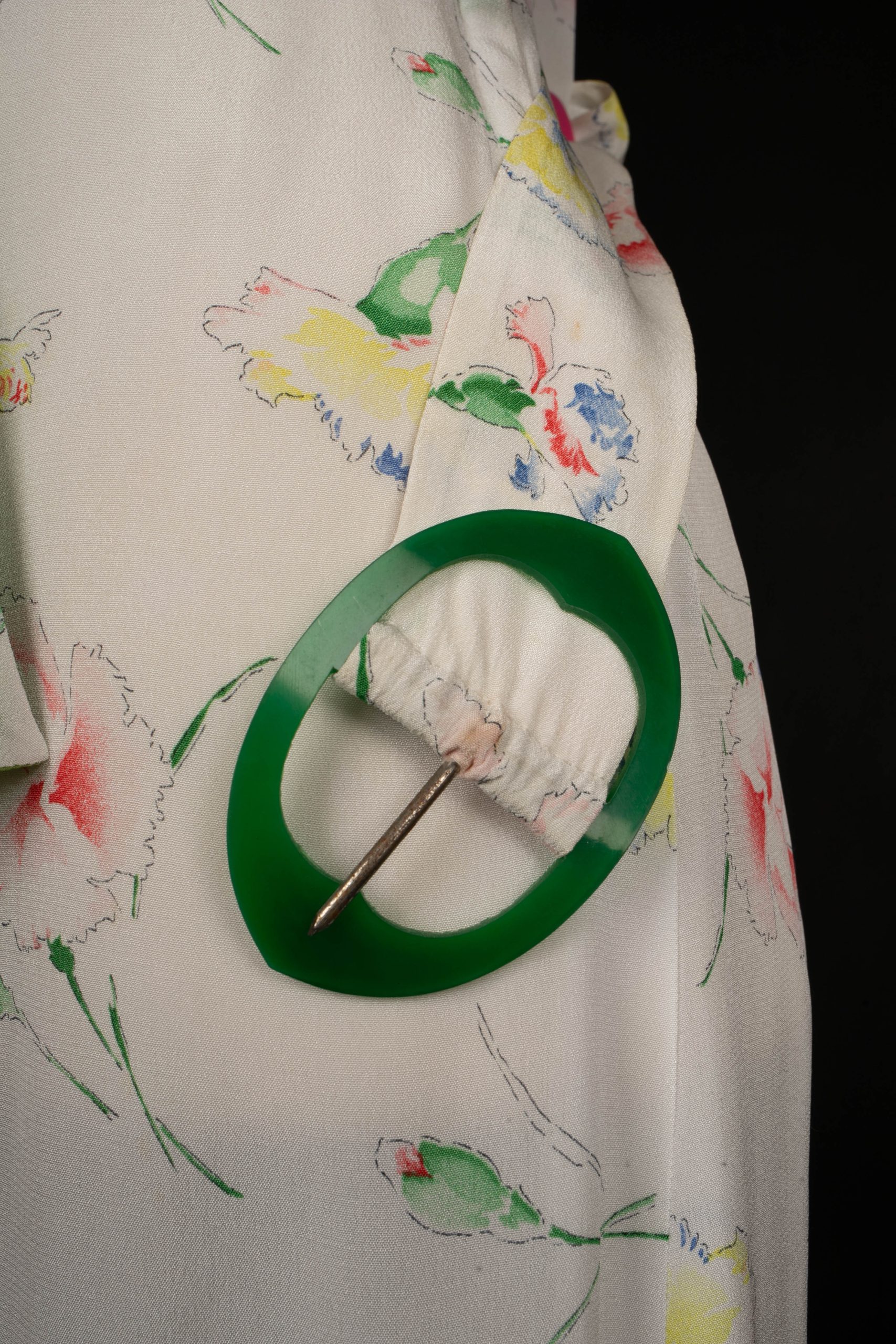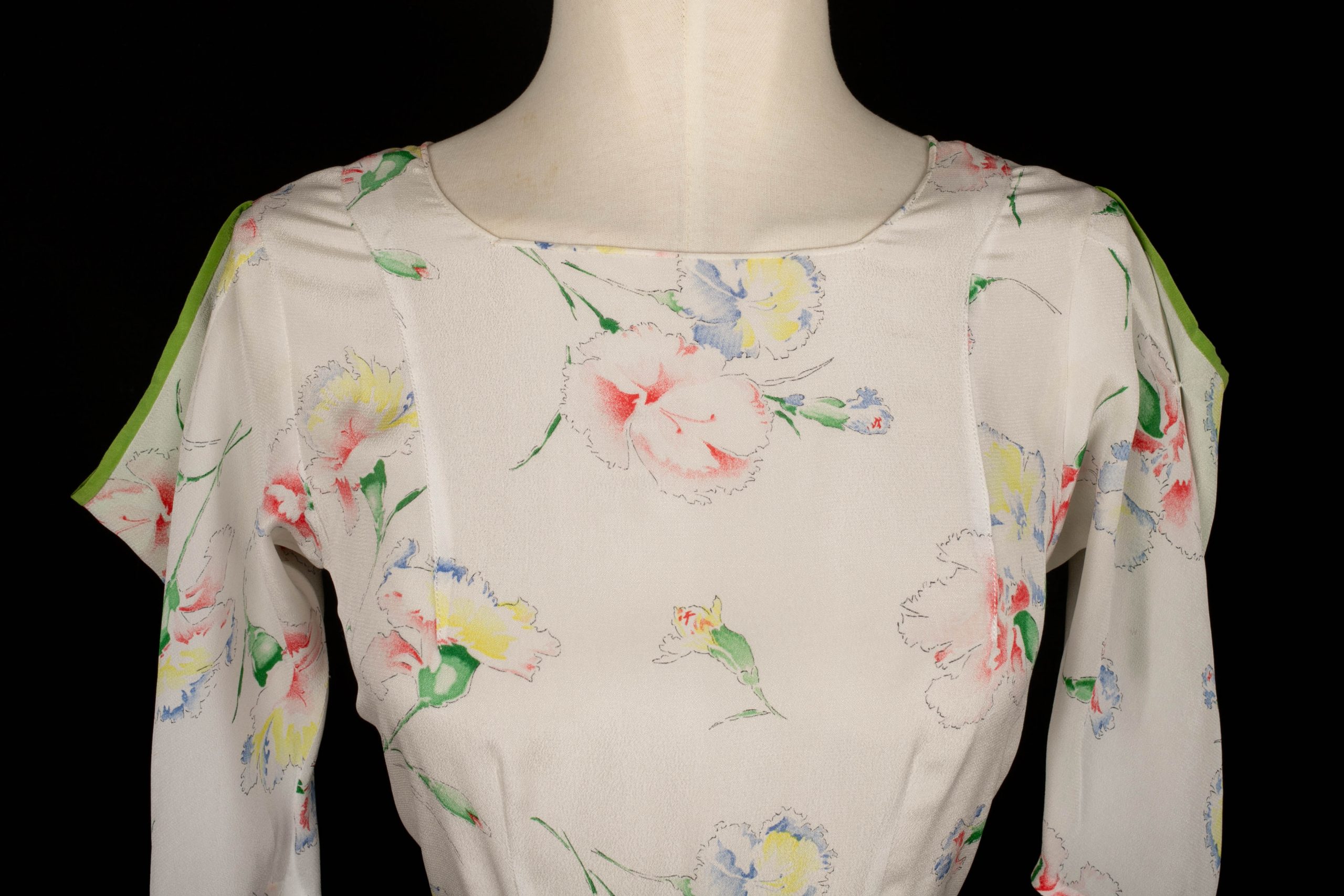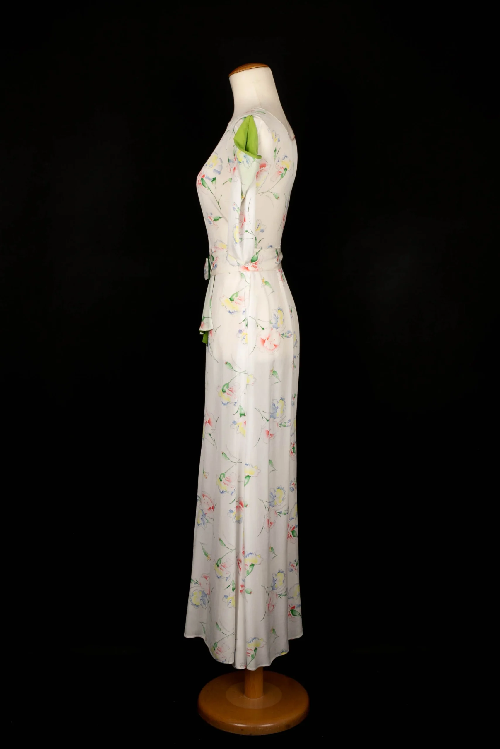 ANONYME -Robe longue vintage à motif floral sur fond blanc et ceinture. Pas de taille indiquée, elle convient à un 34FR/36FR. Robe vintage années 1930/1940.