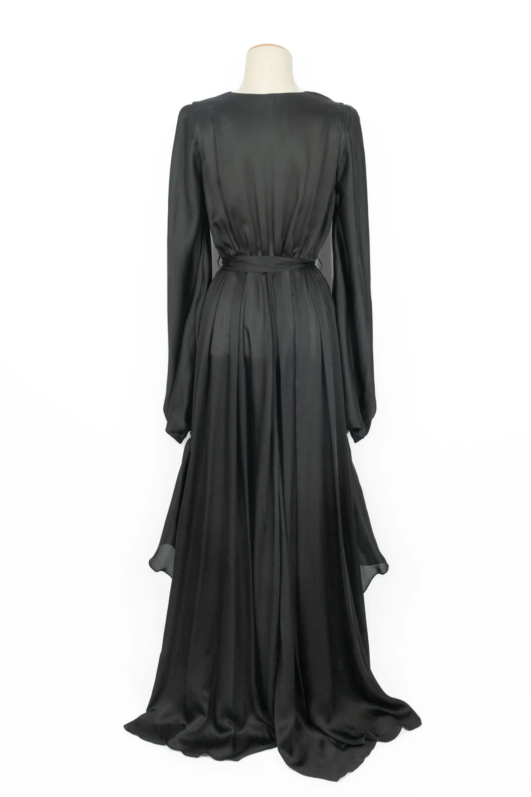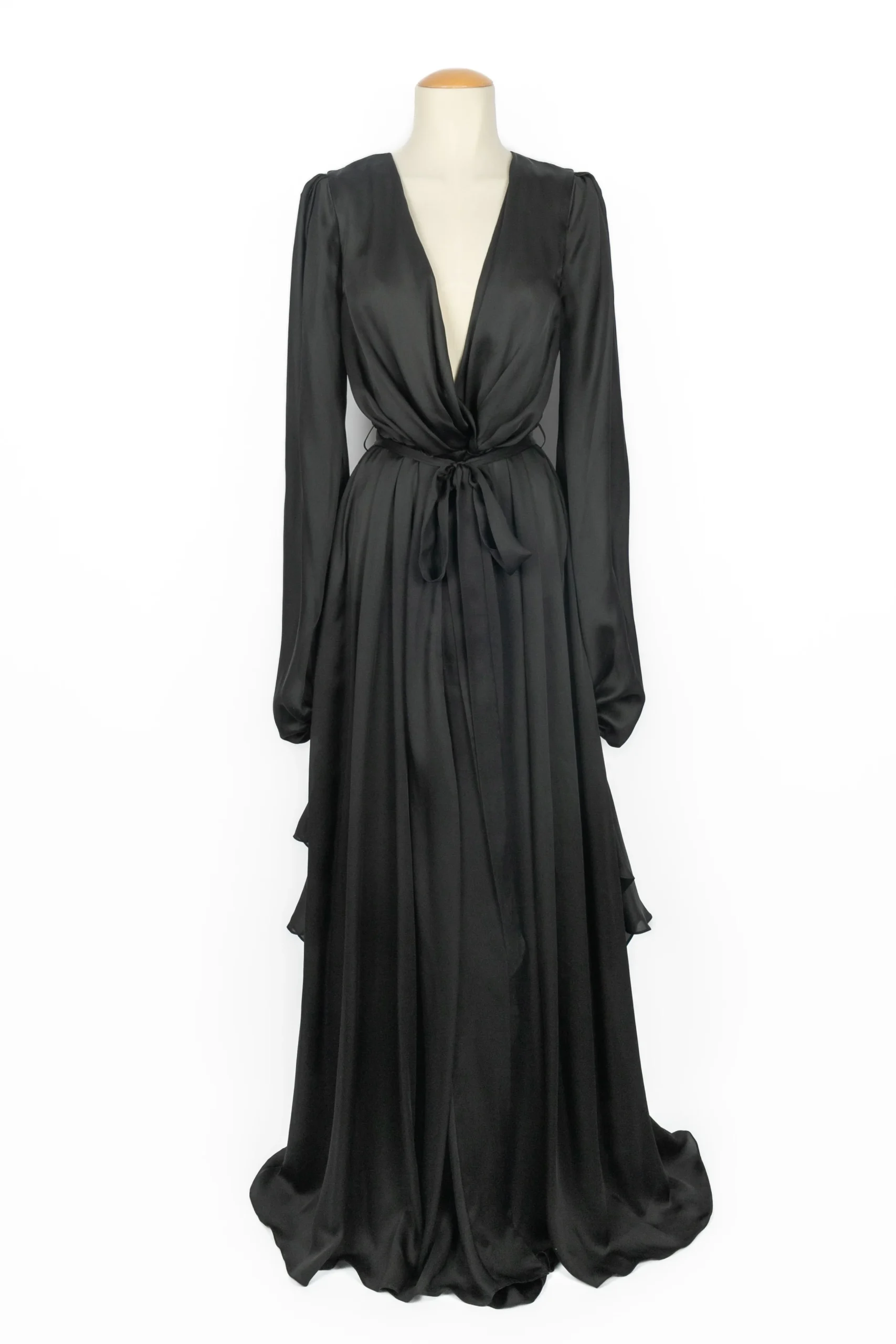 ANONYME – Robe longue en soie noire, manches longues bouffantes, ouverte sur le devant retenue par un petit bouton au niveau de la taille. Pas de taille indiquée, elle convient à un 38FR/40FR.