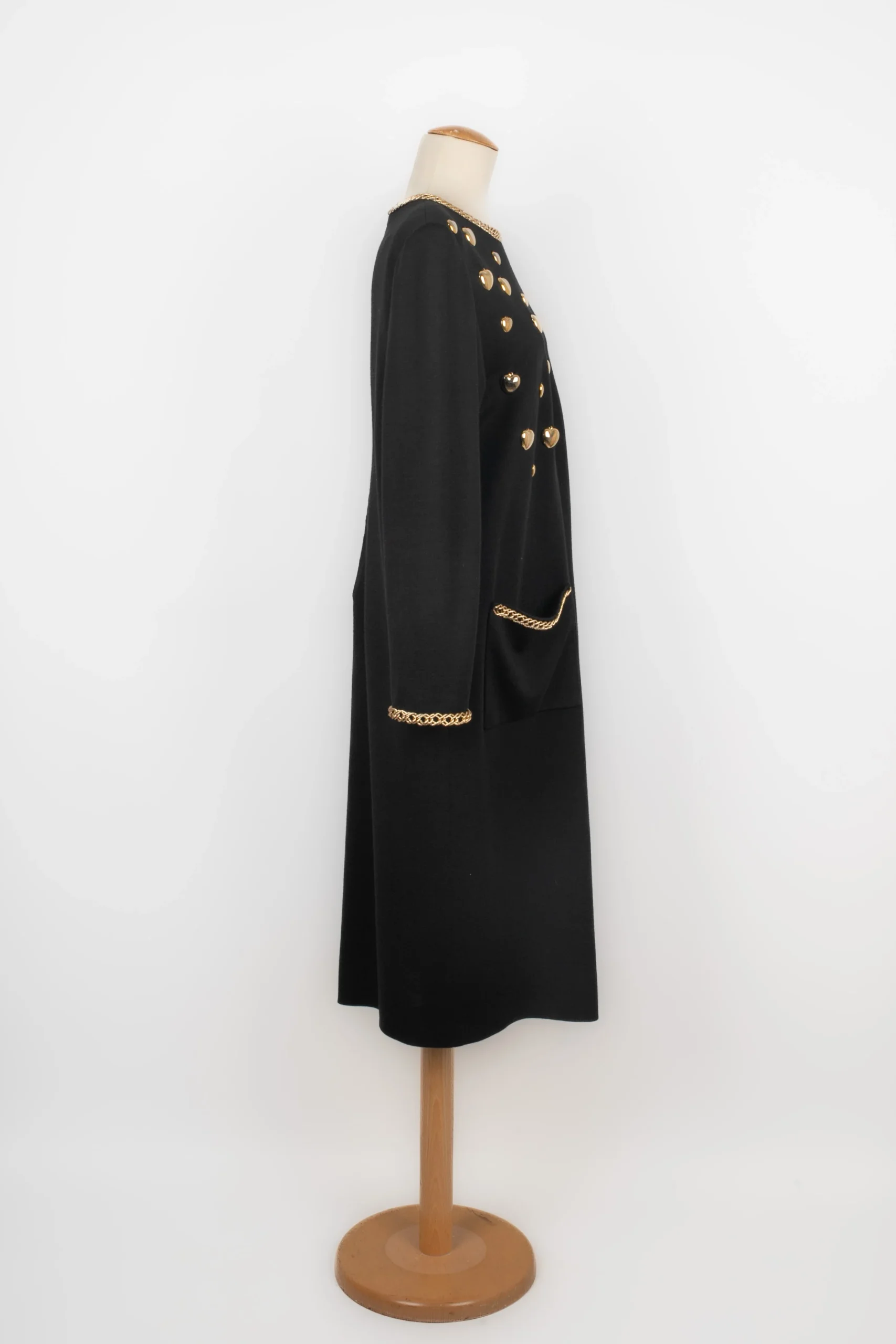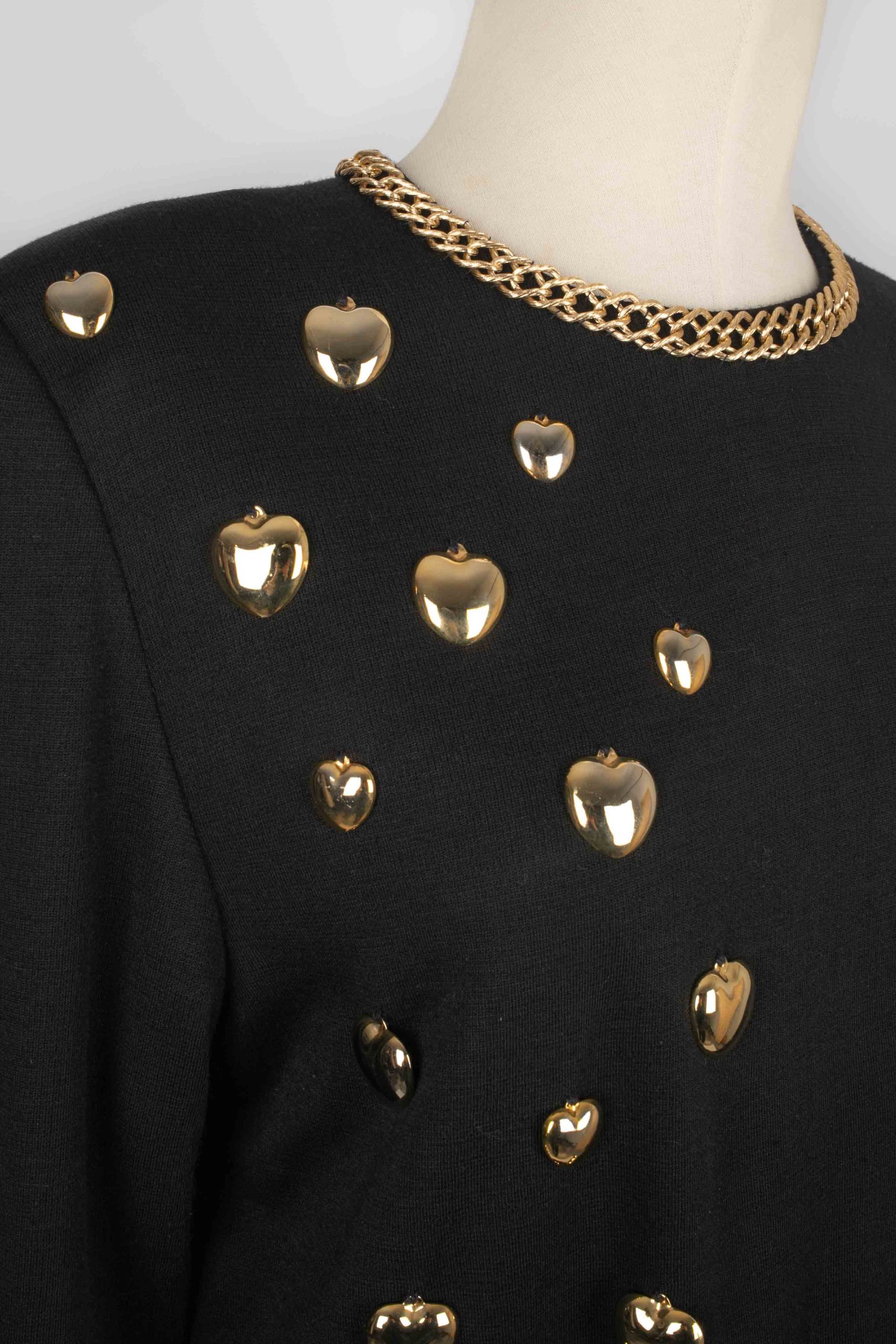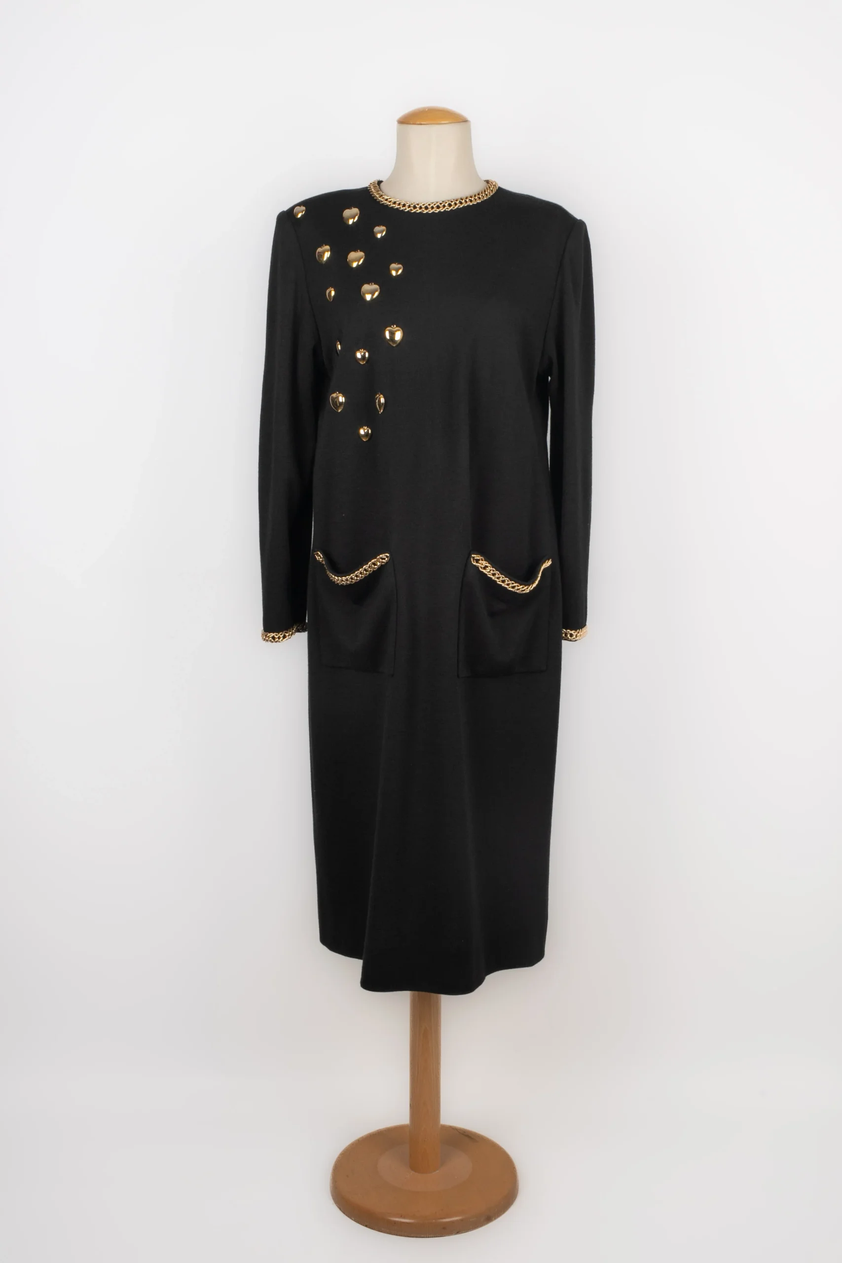 ANONYME -Robe en jersey noir cousu de chaînes et coeur en métal doré. Pas de taille indiquée, elle convient à un 38FR. Condition : Très bon état Dimensions : Largeur d’épaules : 46 cm – Poitrine : 50 cm – Longueur des manches : 60 cm – Longueur : 113 cm