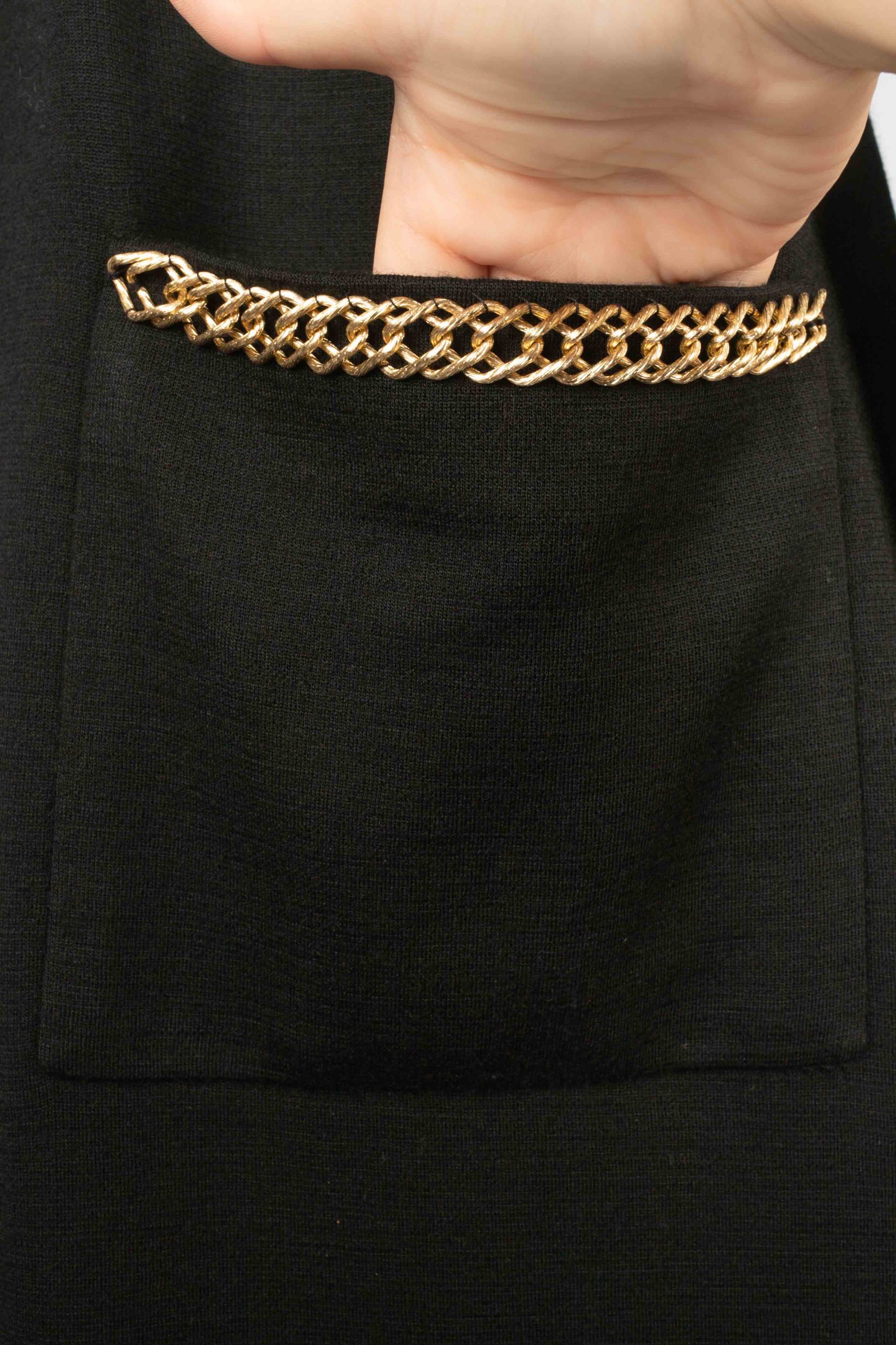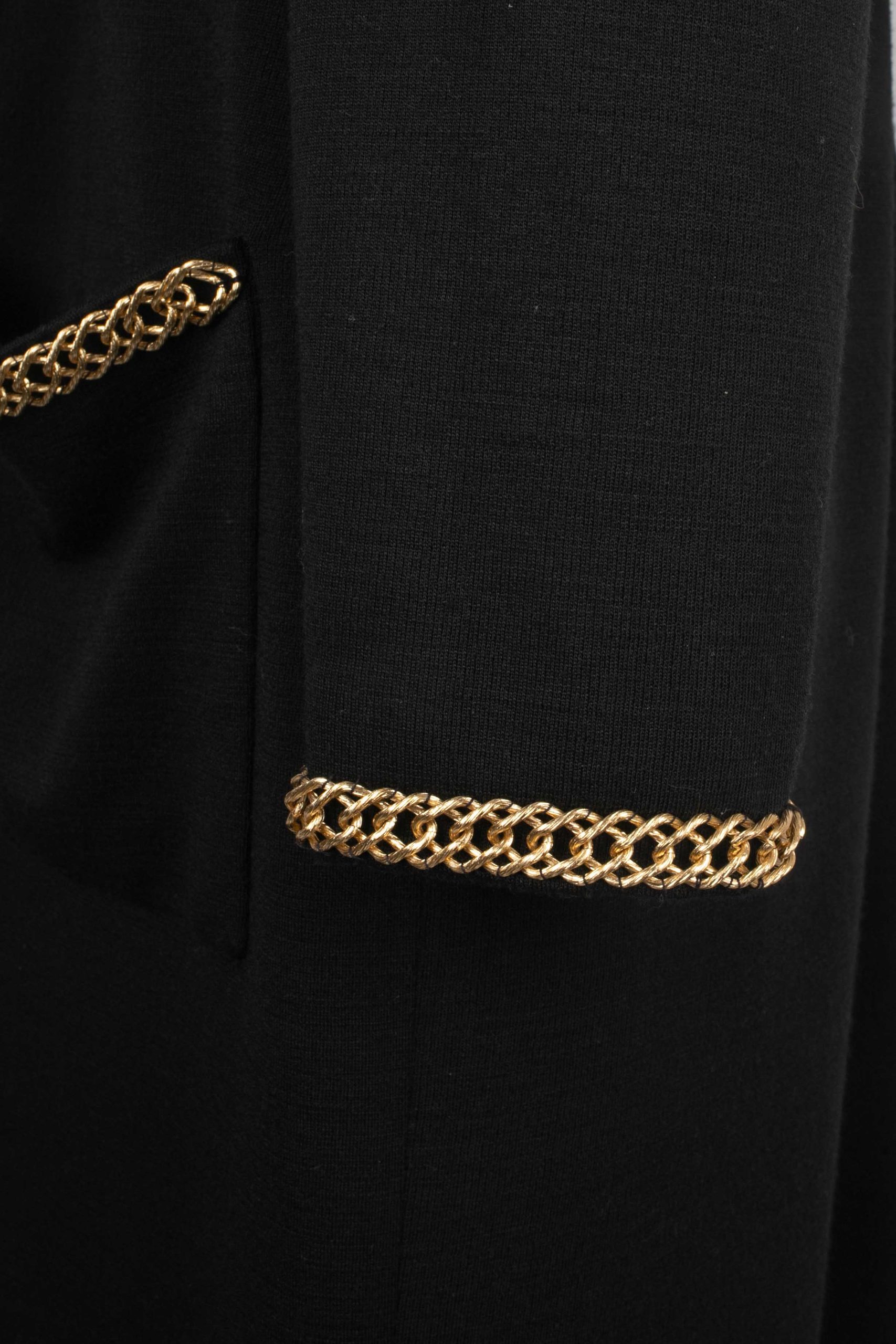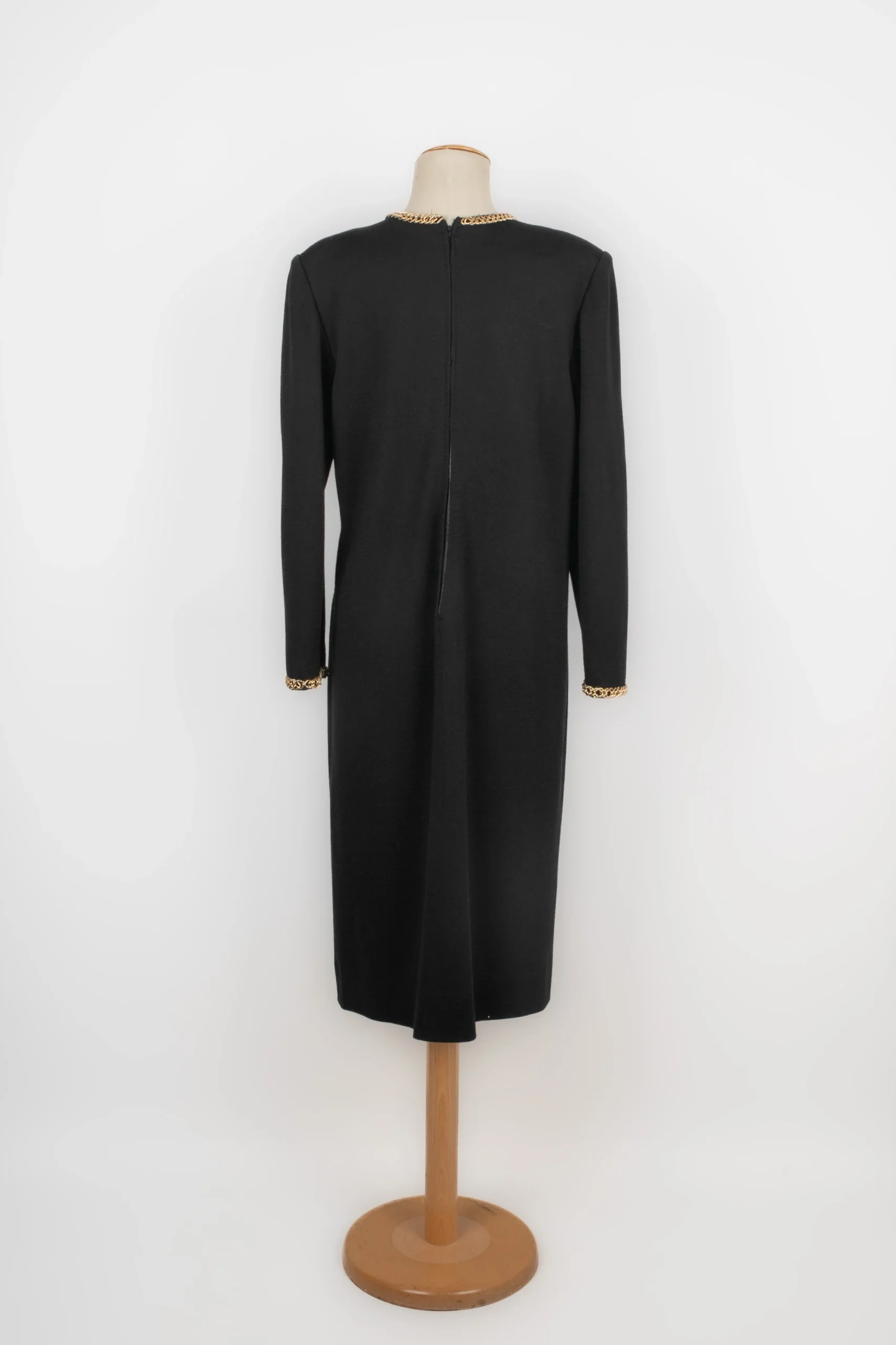 ANONYME -Robe en jersey noir cousu de chaînes et coeur en métal doré. Pas de taille indiquée, elle convient à un 38FR. Condition : Très bon état Dimensions : Largeur d’épaules : 46 cm – Poitrine : 50 cm – Longueur des manches : 60 cm – Longueur : 113 cm