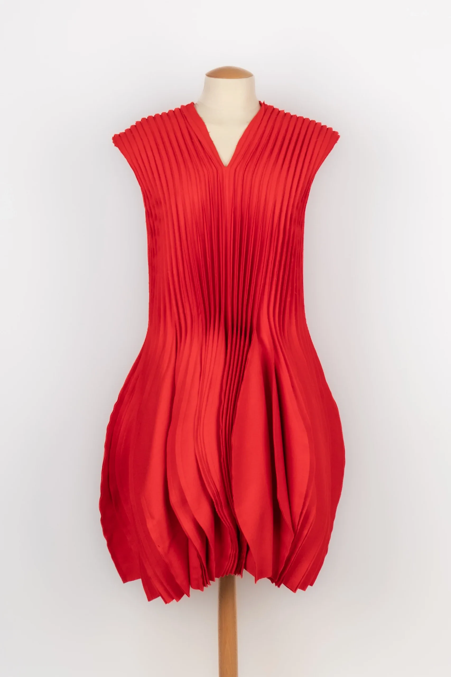 YAMAMOTO – (Made in Japan) Robe sans manches en lainage rouge plissé. Taille indiquée 2, elle convient à un 40FR/42FR. Collection Automne-Hiver 2012. Condition : Très bon état Dimensions : Poitrine : 50 cm – Taille : 40 cm – Longueur : 103 cm