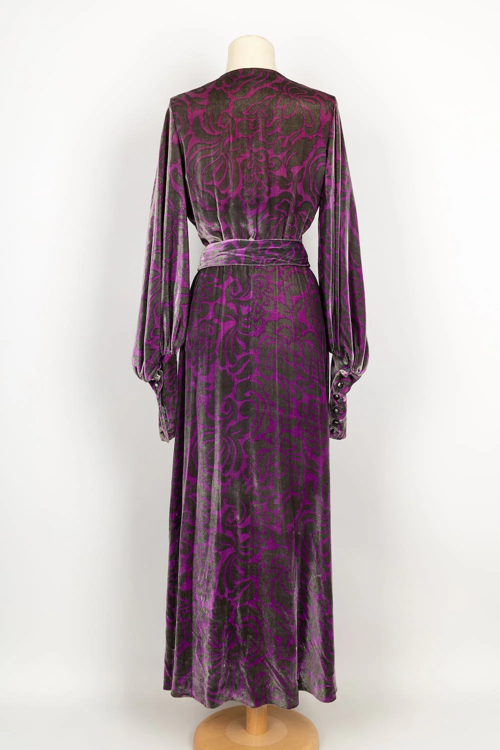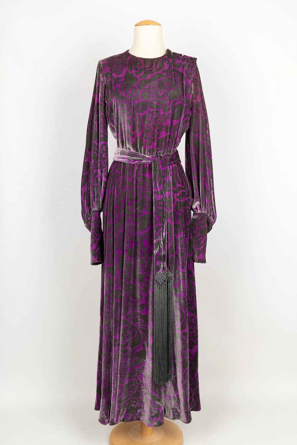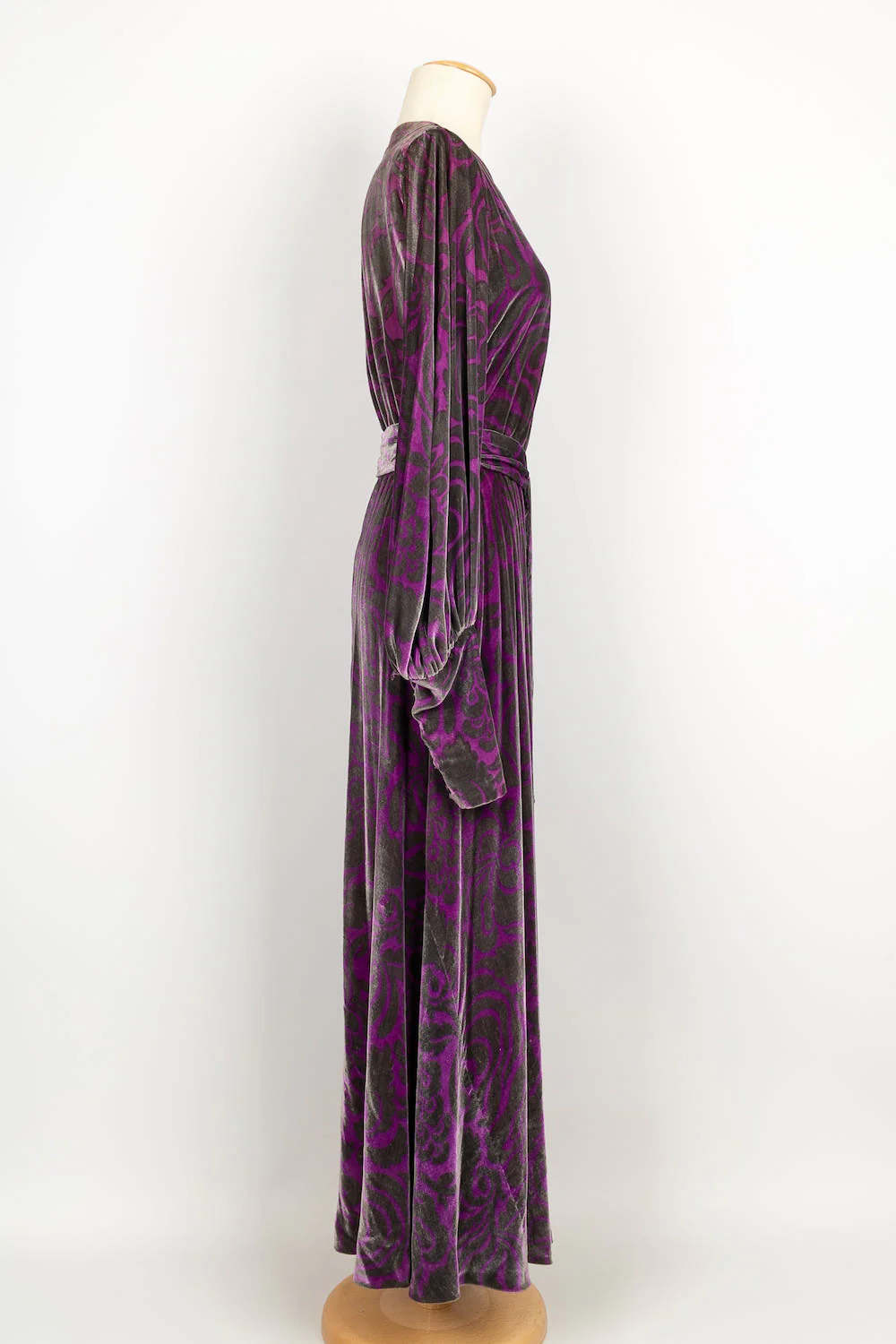 YVES SAINT LAURENT -(Made in France) Longue robe Haute Couture en velours de soie violette et grise, accompagnée de sa ceinture. Pas de taille indiquée, elle convient à un 36FR.