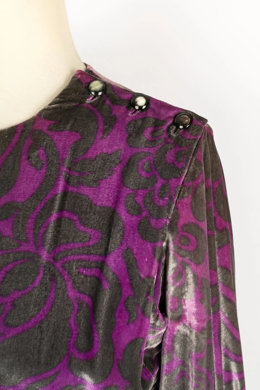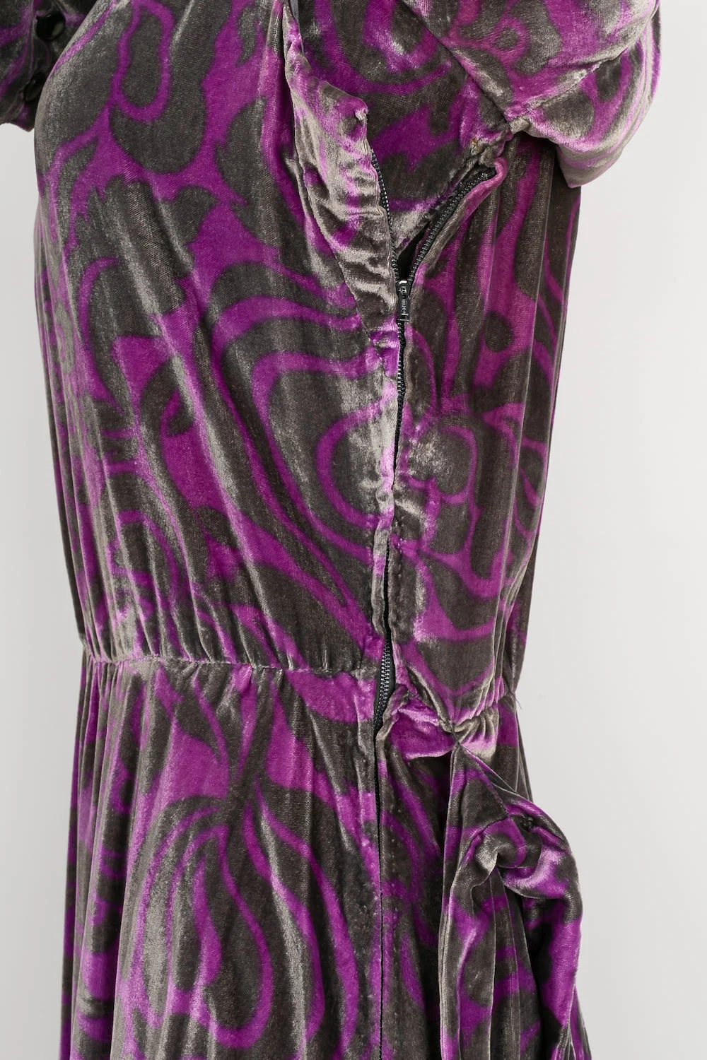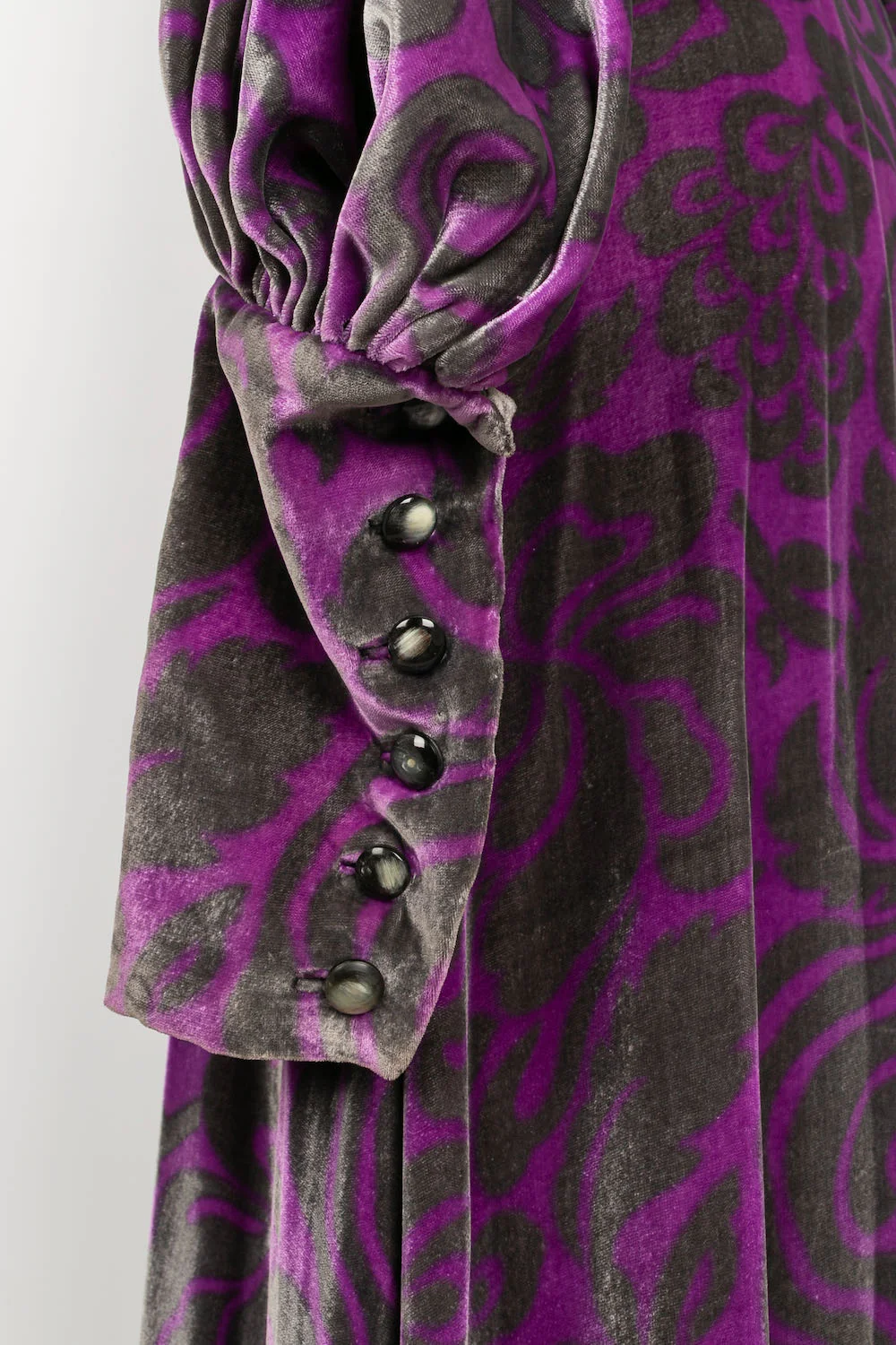 YVES SAINT LAURENT -(Made in France) Longue robe Haute Couture en velours de soie violette et grise, accompagnée de sa ceinture. Pas de taille indiquée, elle convient à un 36FR.
