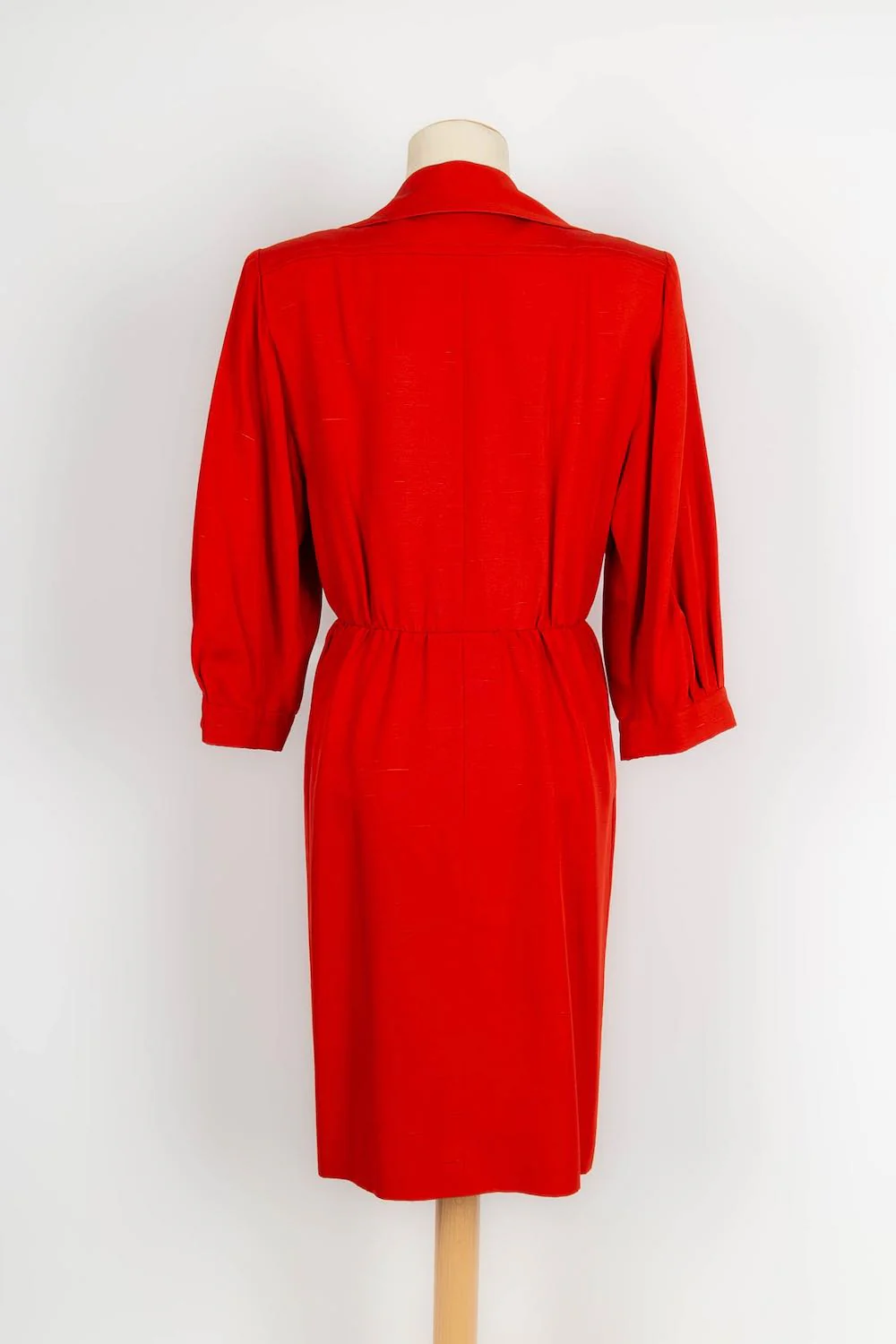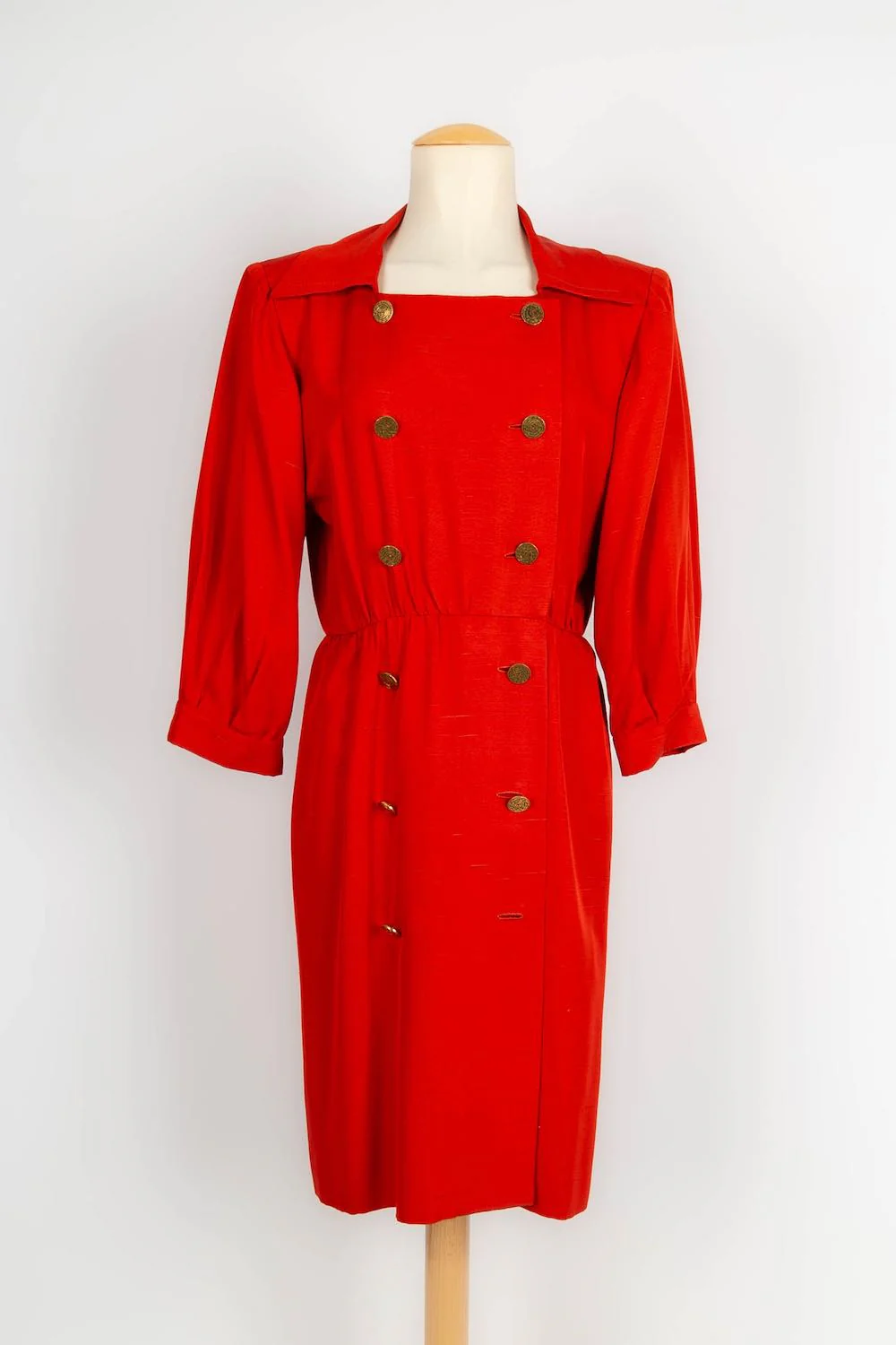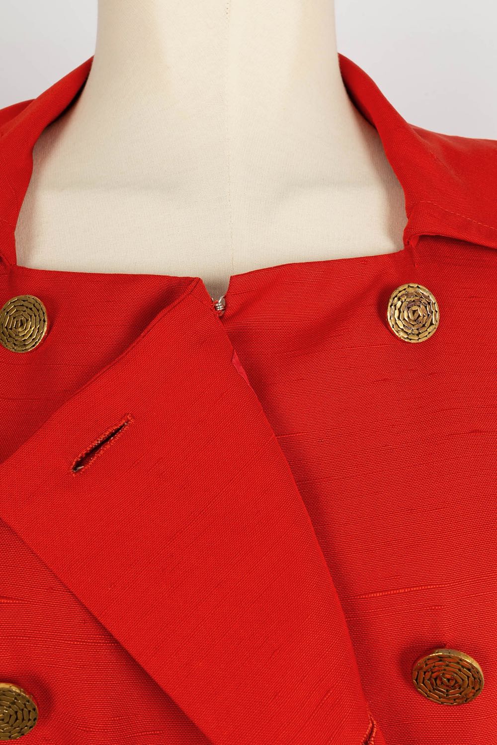 YVES SAINT LAURENT -(Made in France) Robe en soie sauvage rouge et boutons en métal doré. Pas de taille indiquée, elle correspond à un 36FR. Collection Haute Couture 1984.