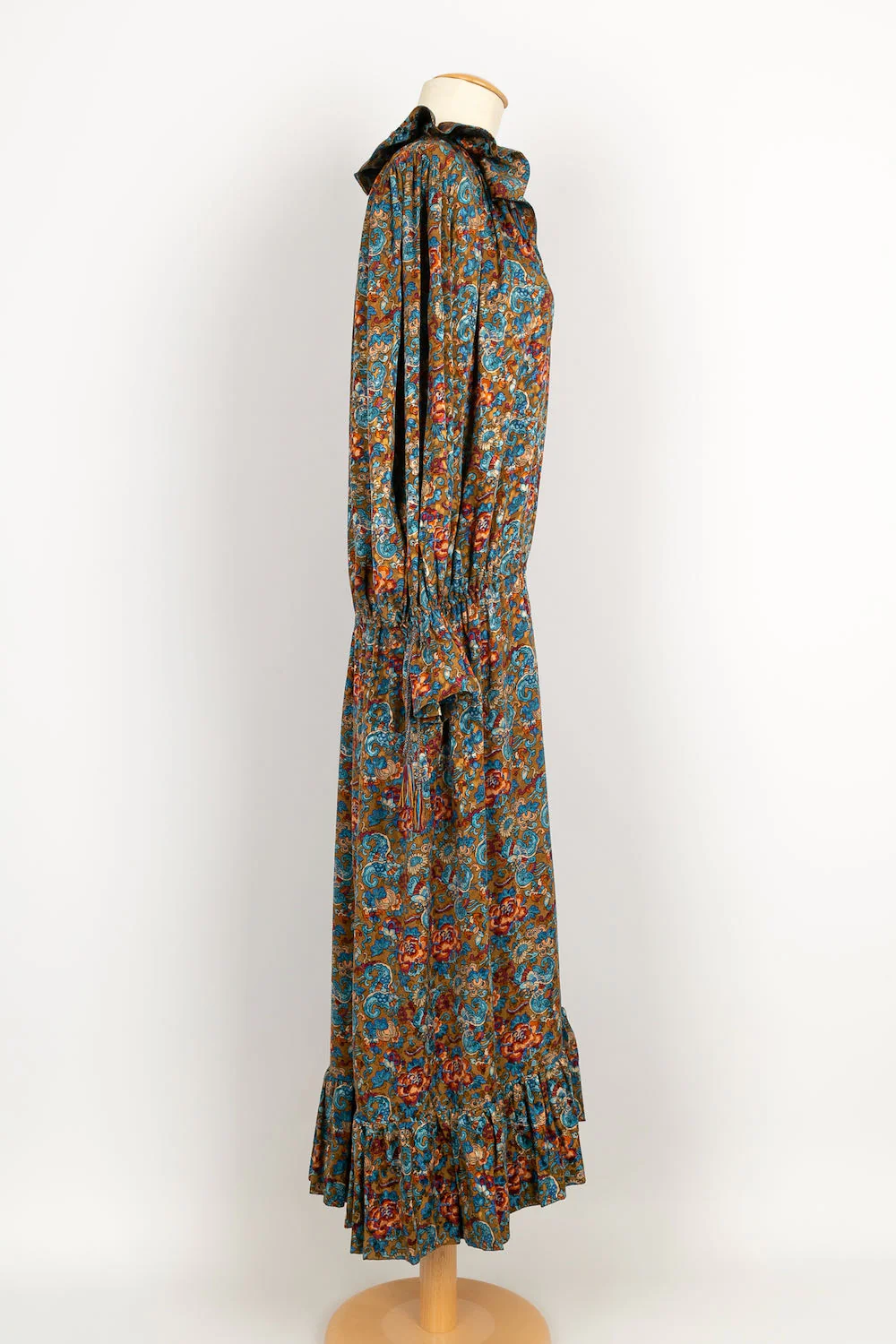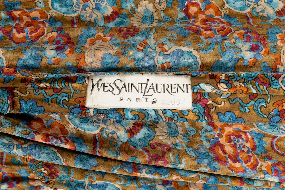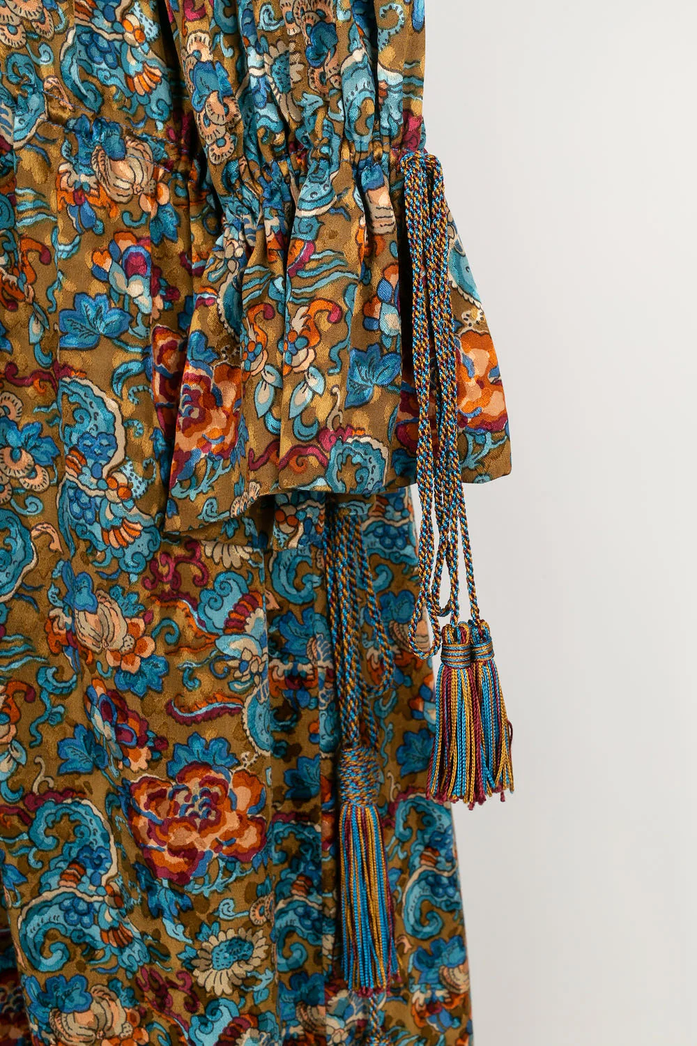 YVES SAINT LAURENT -(Made in France) Longue robe Haute Couture en soie. Aucune étiquette de taille, elle convient à un 38FR. Condition : Très bon état Dimensions : Largeur d’épaules : 42 cm – Poitrine : 52 cm – Longueur des manches : 64 cm – Longueur : 130 cm
