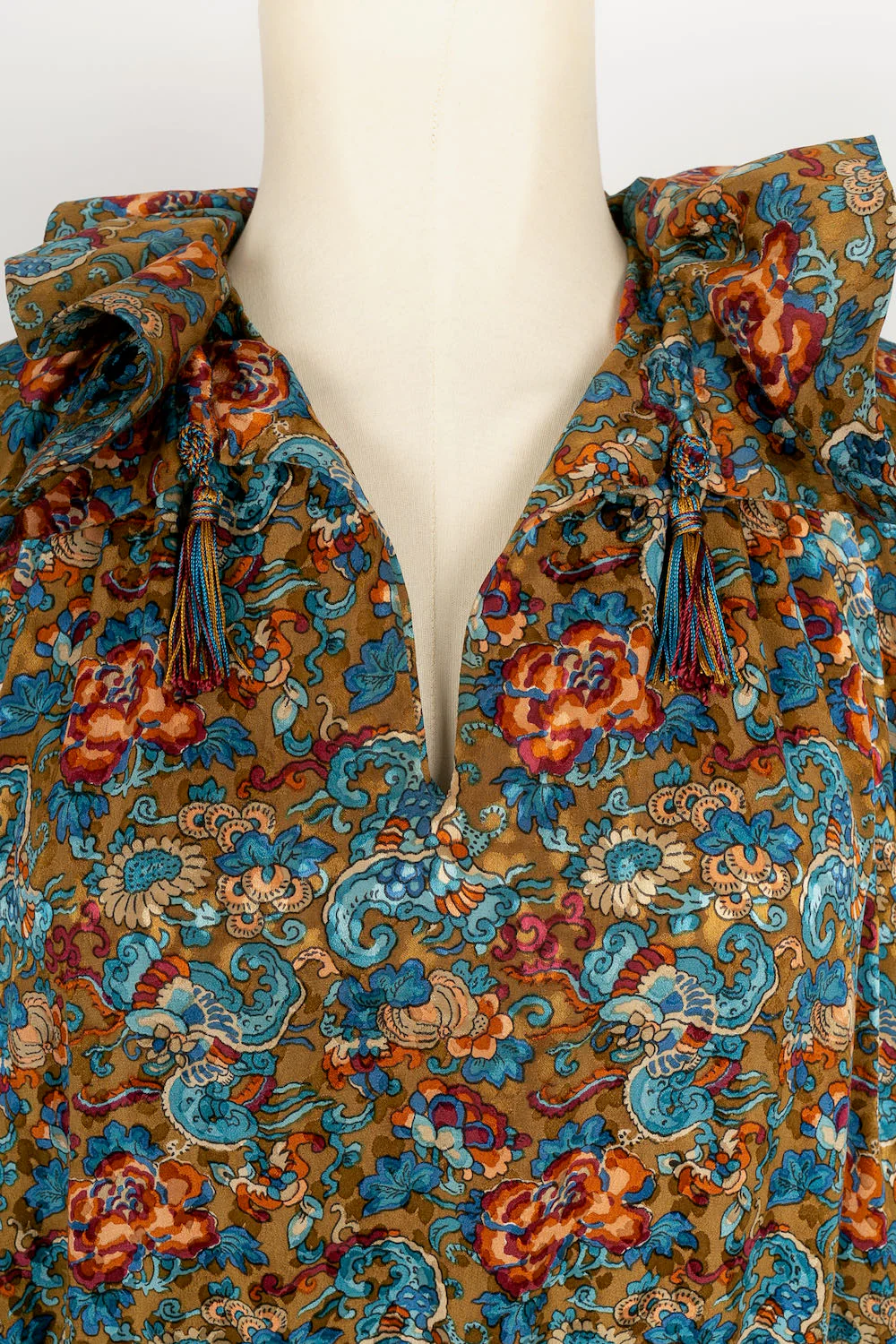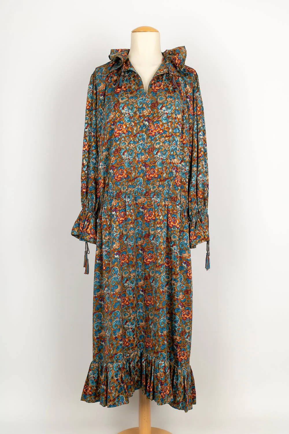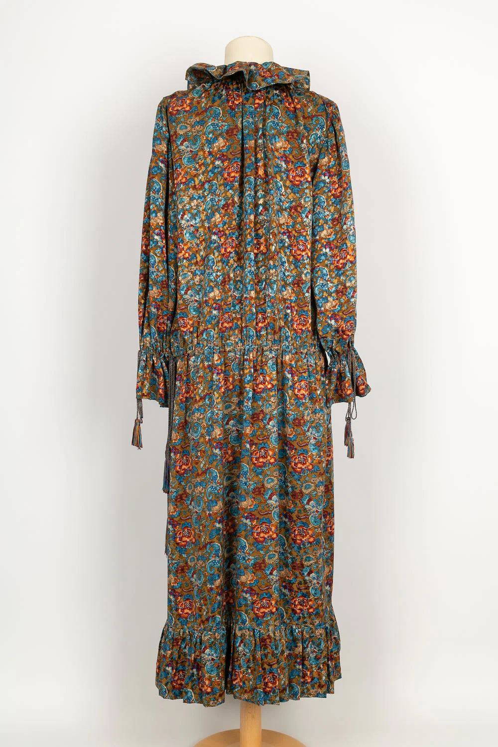 YVES SAINT LAURENT -(Made in France) Longue robe Haute Couture en soie. Aucune étiquette de taille, elle convient à un 38FR. Condition : Très bon état Dimensions : Largeur d’épaules : 42 cm – Poitrine : 52 cm – Longueur des manches : 64 cm – Longueur : 130 cm