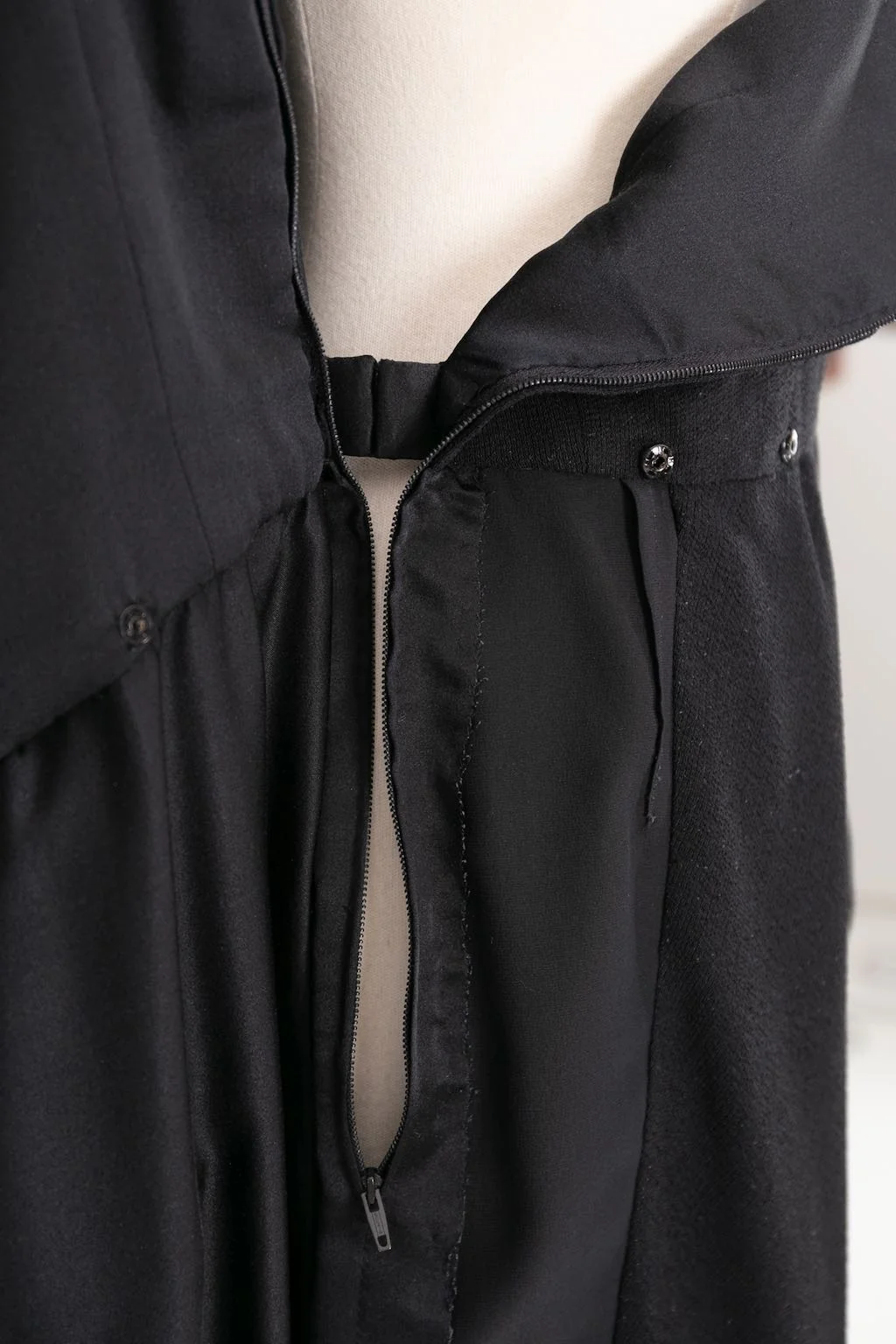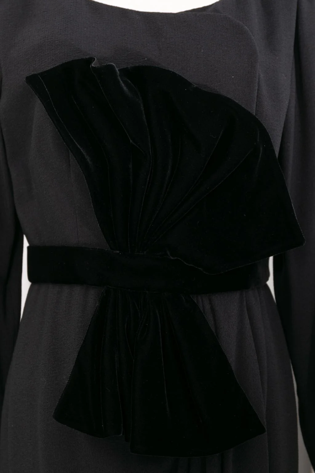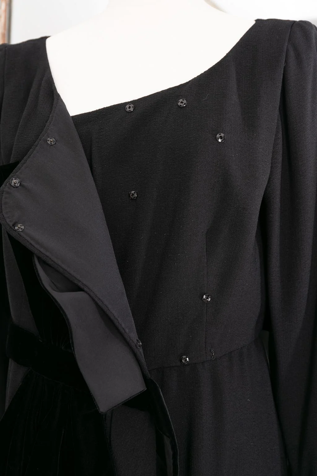 YVES SAINT LAURENT -Robe Haute Couture en crêpe de laine noir à boutonnage pression oblique se continuant sur le portefeuille de la jupe. La taille est soulignée par un noeud de velours. Circa 1999. Bolduc n°67470. Etiquettes de taille ou de composition absentes, elle correspond à une taille 36FR.
