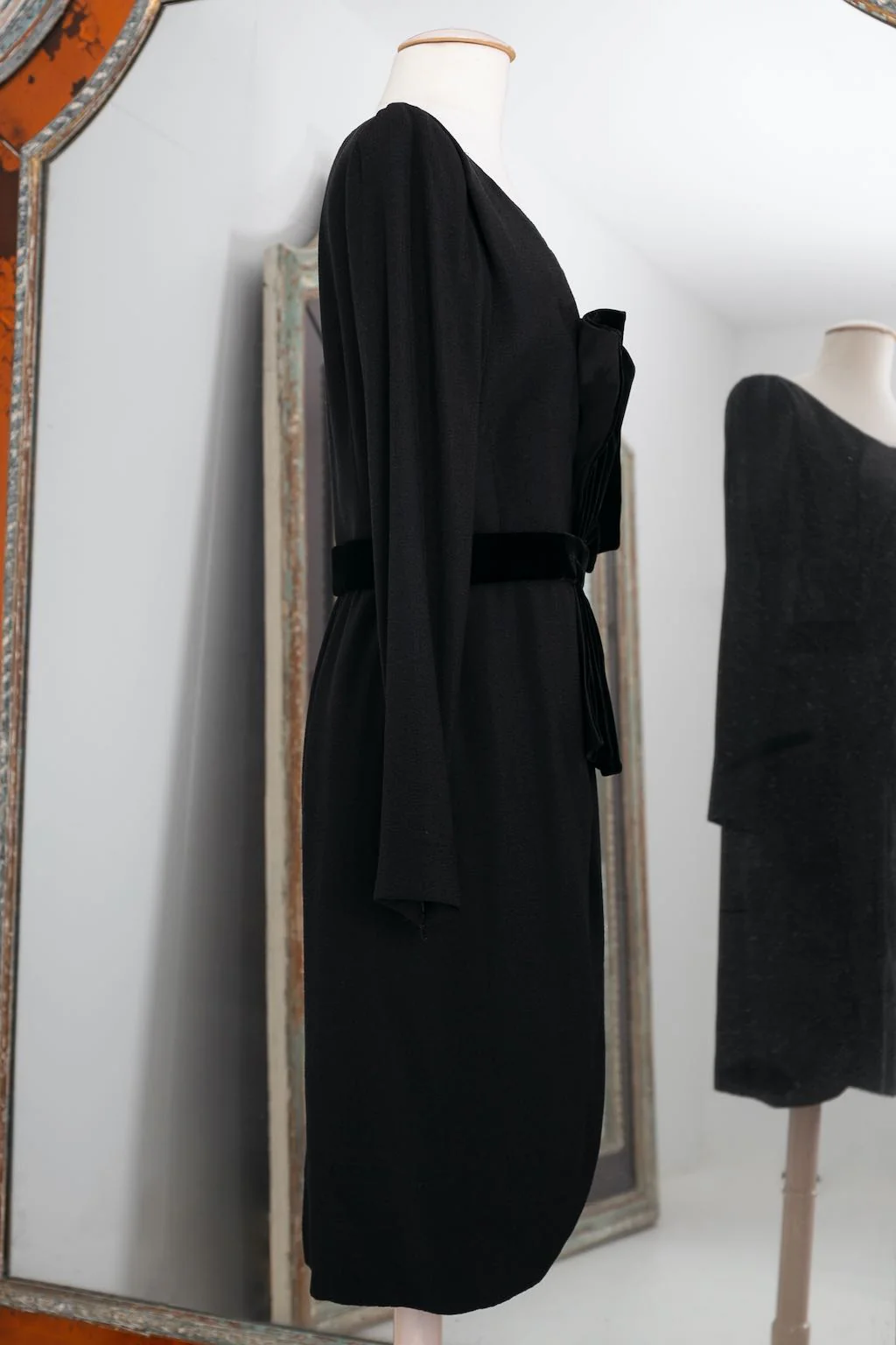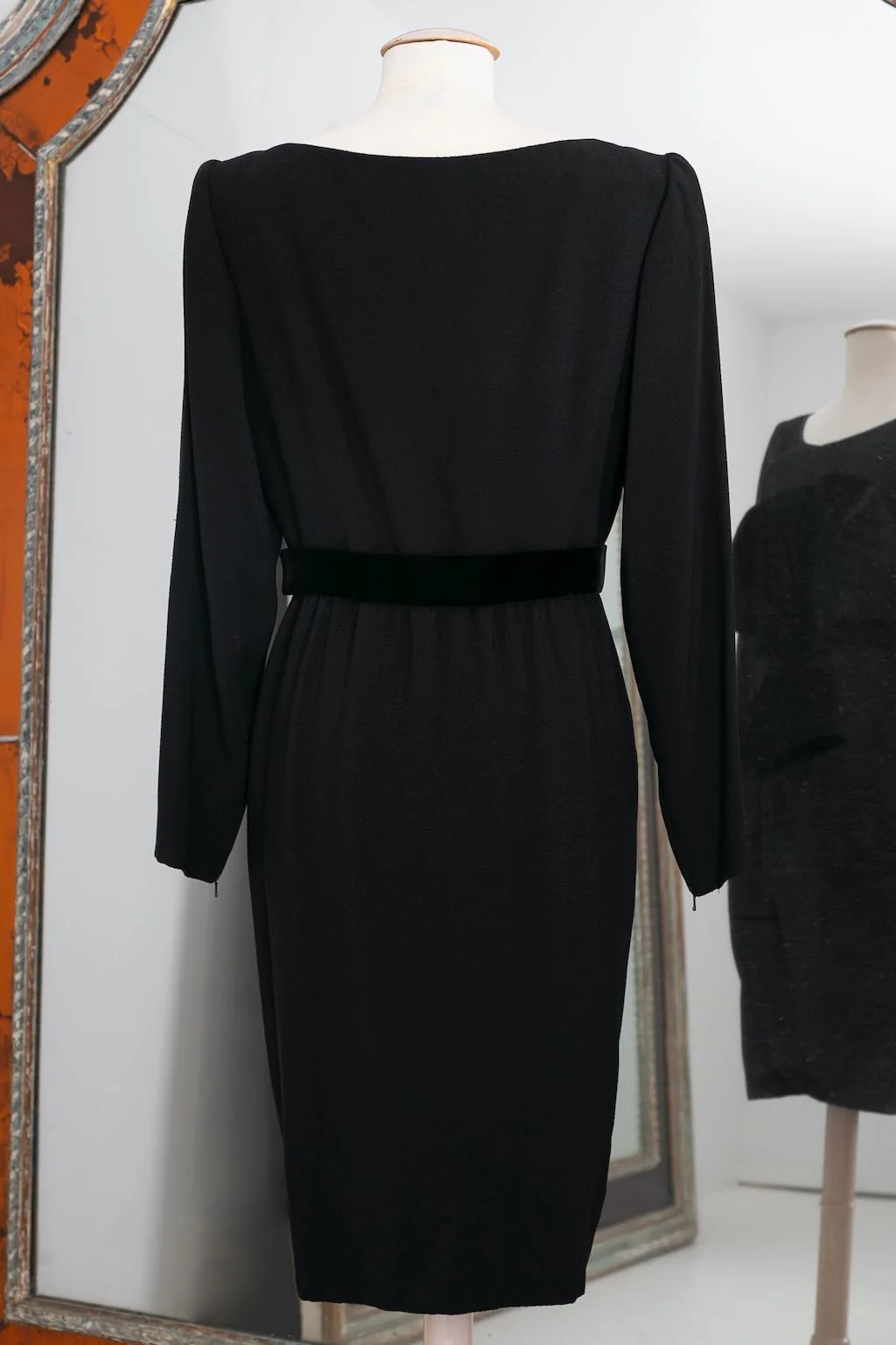 YVES SAINT LAURENT -Robe Haute Couture en crêpe de laine noir à boutonnage pression oblique se continuant sur le portefeuille de la jupe. La taille est soulignée par un noeud de velours. Circa 1999. Bolduc n°67470. Etiquettes de taille ou de composition absentes, elle correspond à une taille 36FR. Condition : Très bon état Dimensions […]