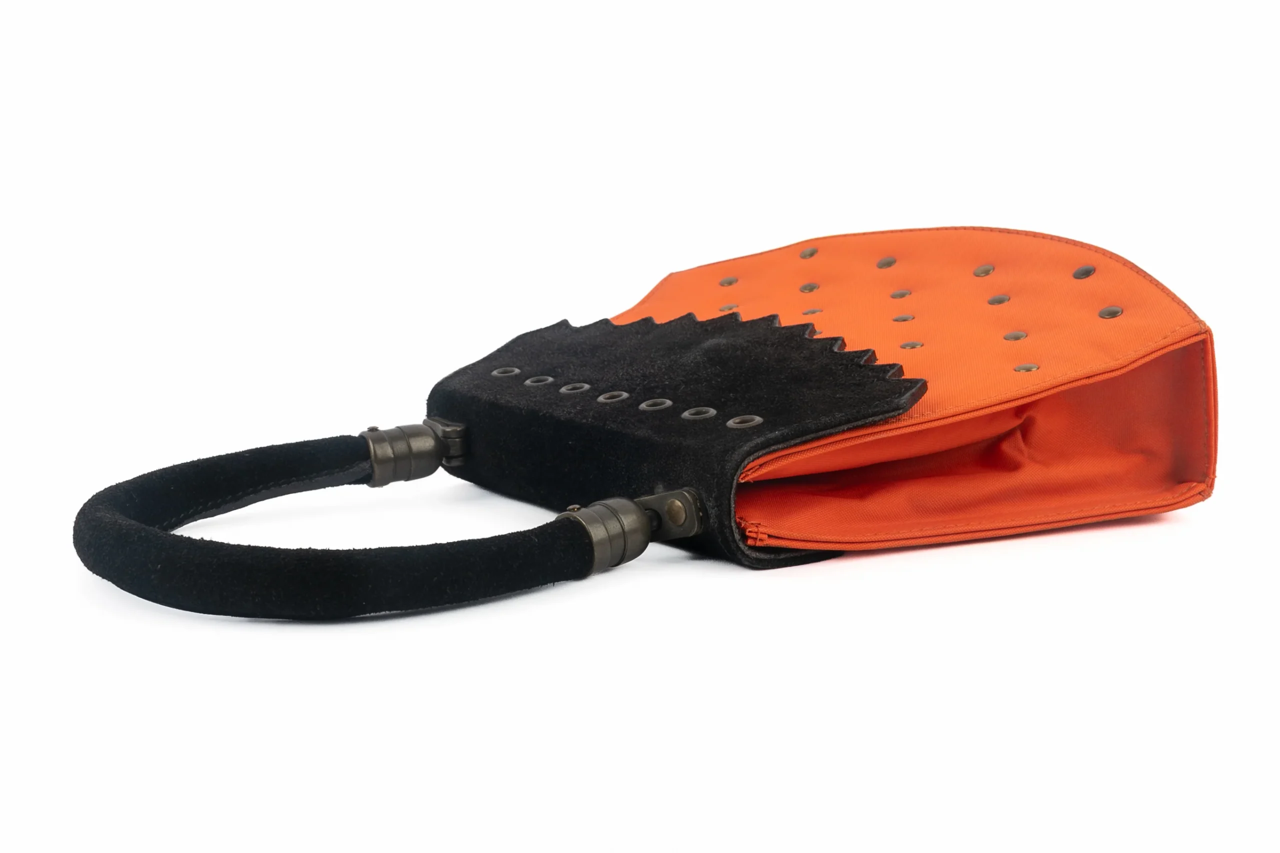CHRISTIAN LACROIX – (Made in France) Sac clouté en toile orange et cuir retourné noir évoquant une citrouille.