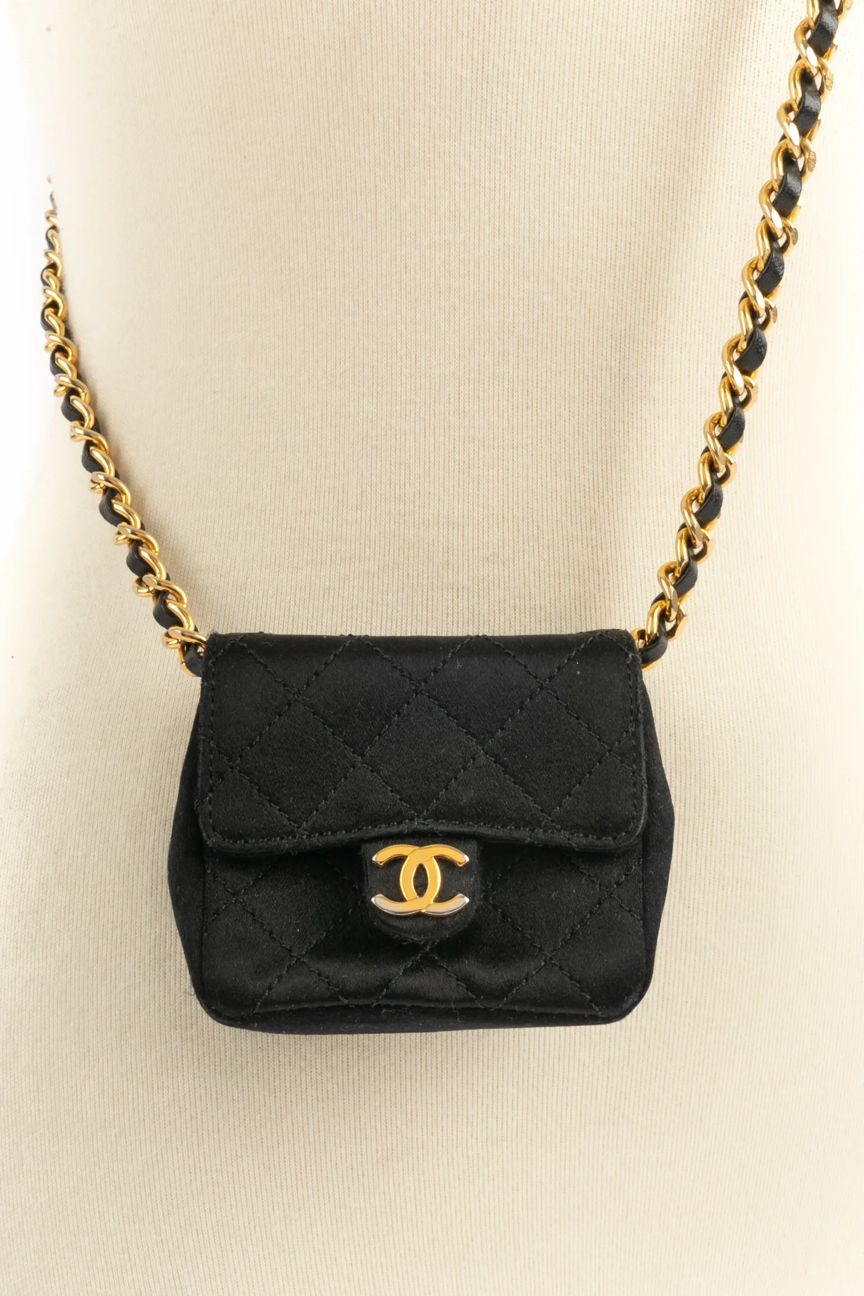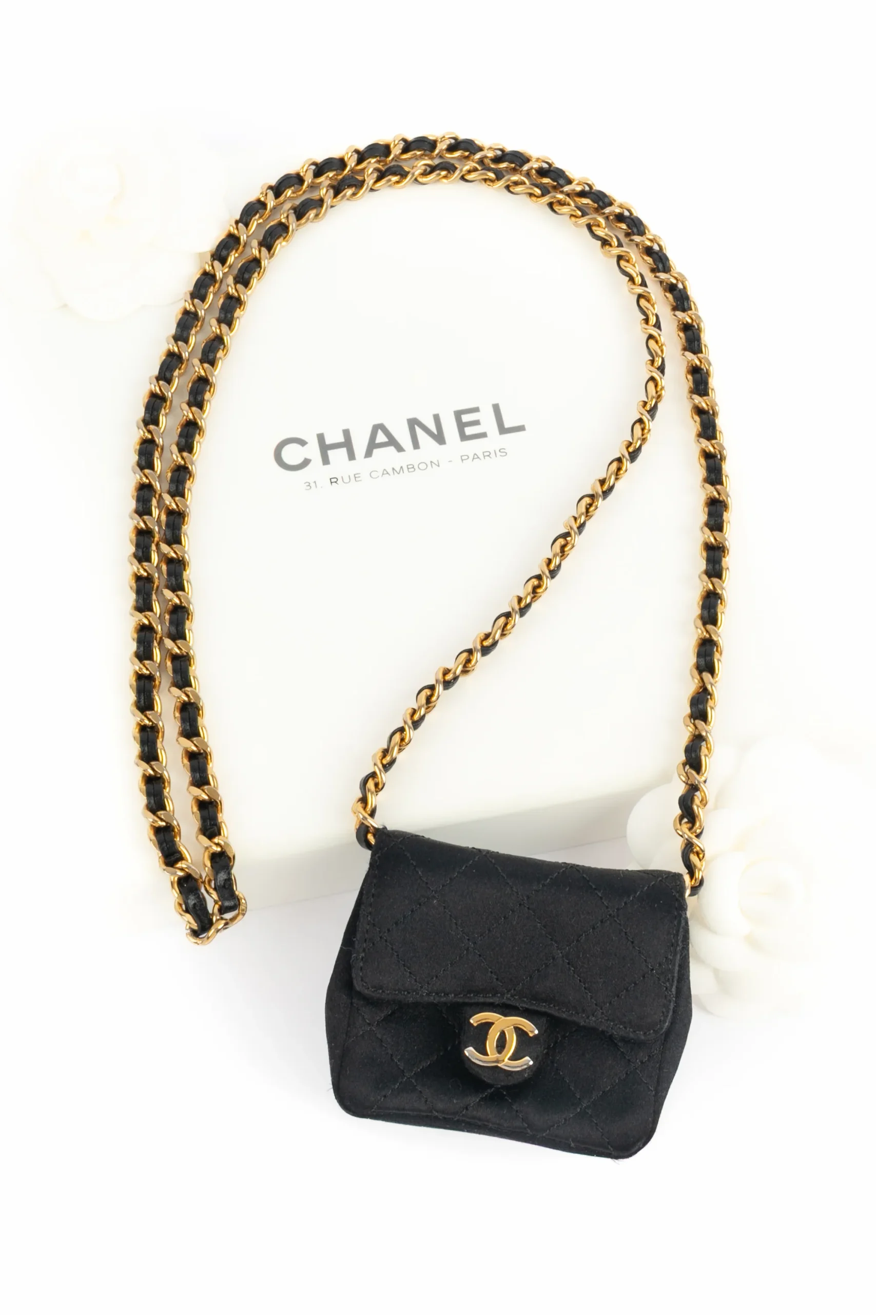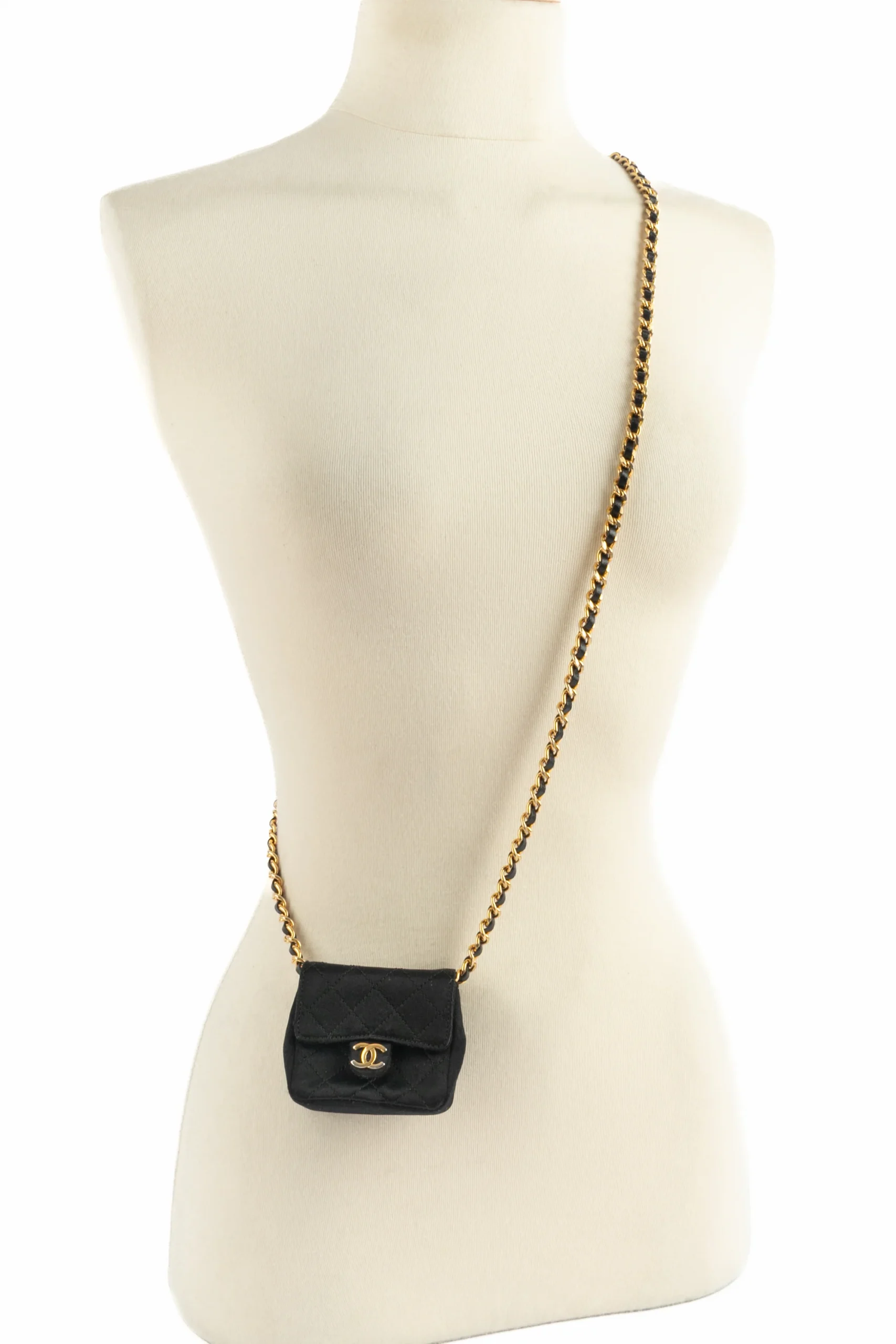 CHANEL – (Made in France) Sac classique Micro en satin matelassé noir. Fermeture pression sur rabat surmonté du sigle de la maison. Anse bandoulière chaîne entrelacée de cuir d’agneau noir. Numéro de série présent. Collection 1989-1991 sous la direction artistique de Karl Lagerfeld.