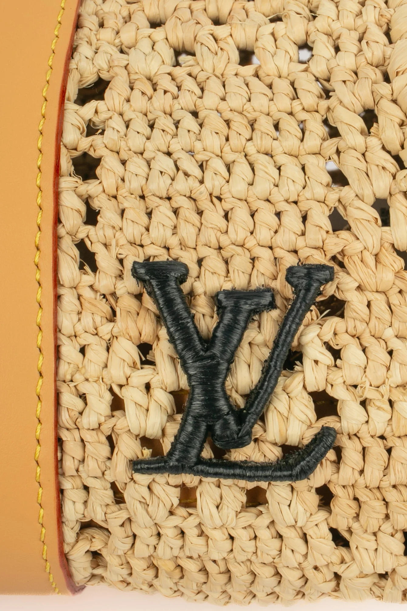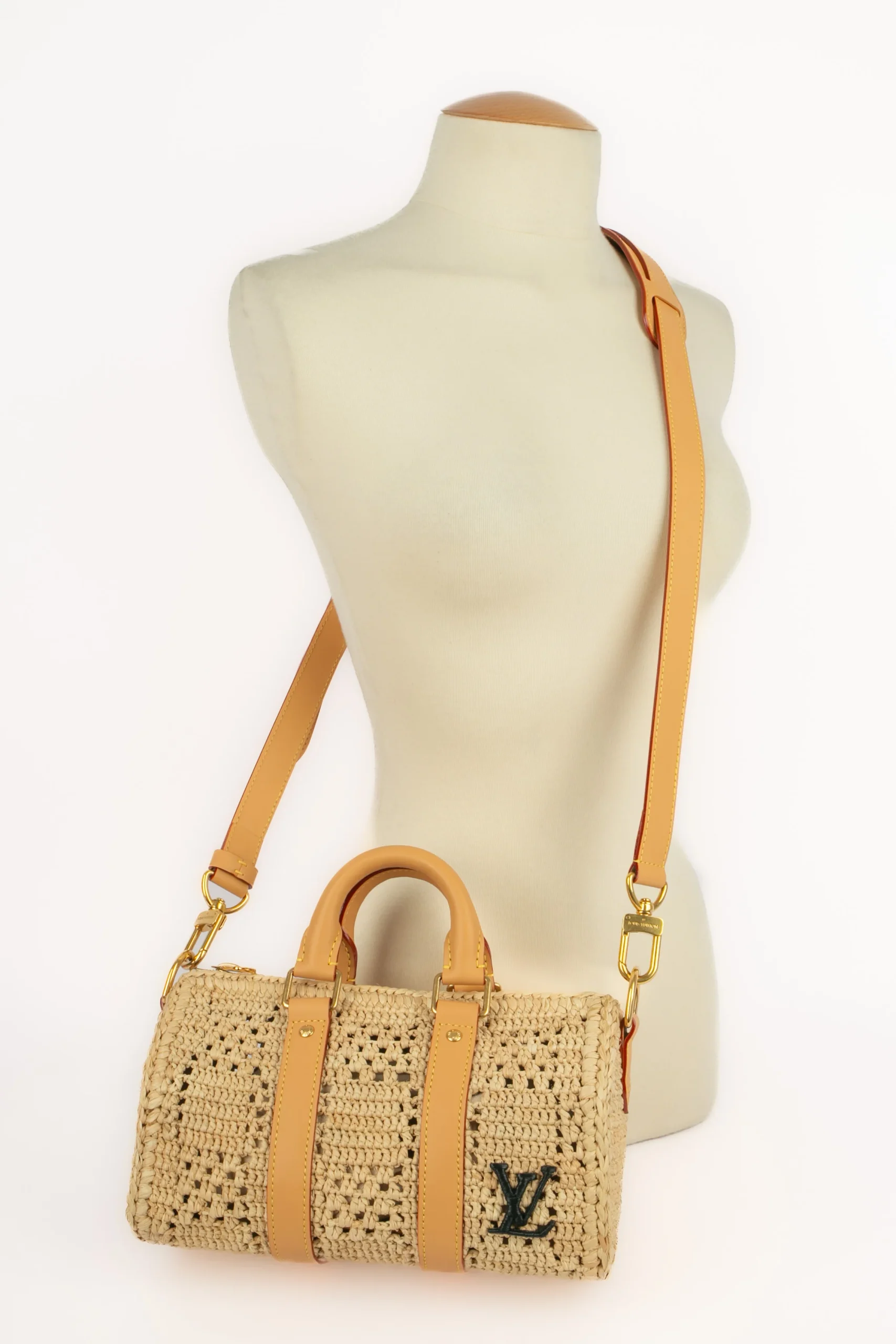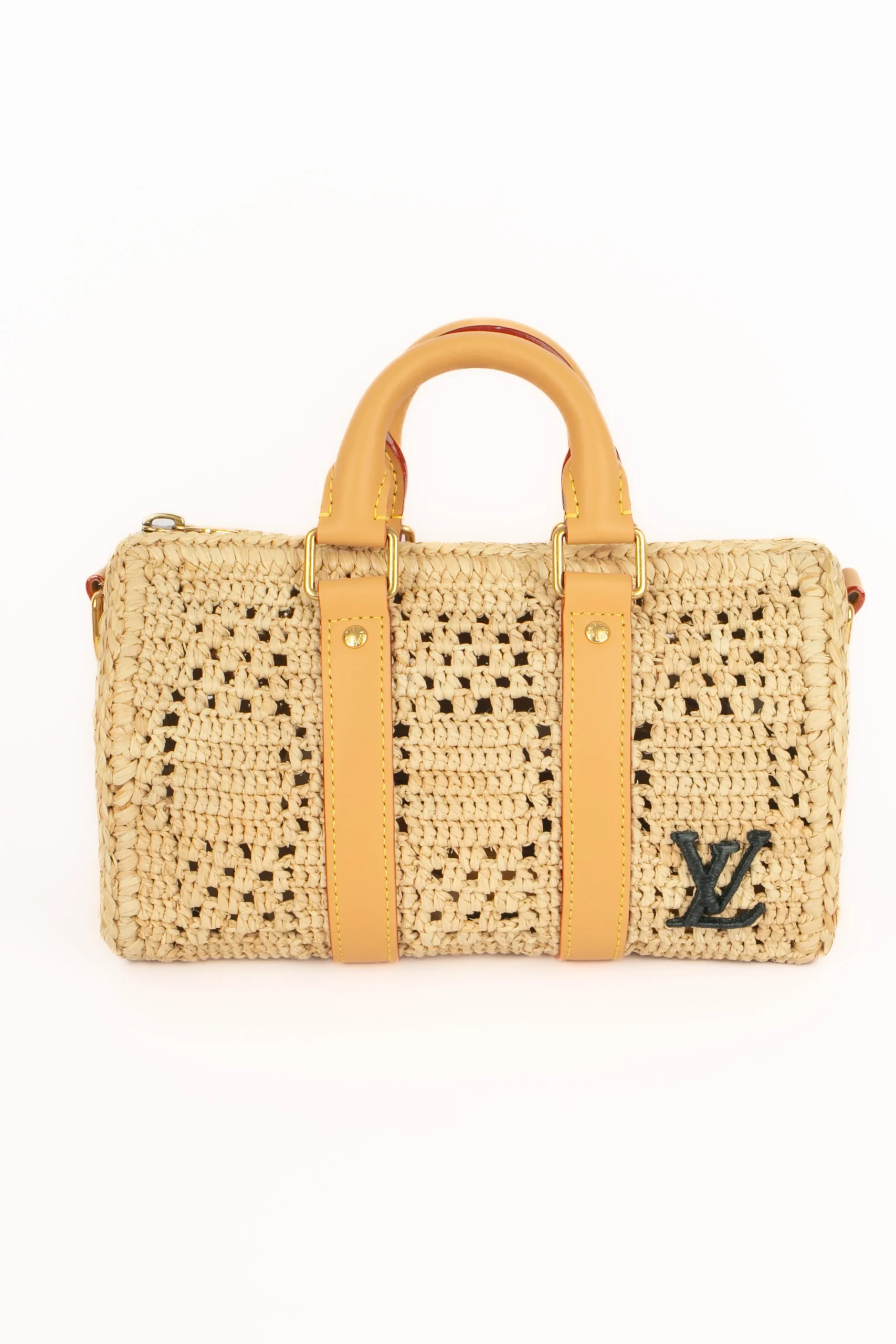 LOUIS VUITTON – (Made in Madagascar) Sac « Keepall » Bandoulière 25 cm, fabriqué à la main à partir de fibres de palmier naturelles, confection de sa coque nécessite environ 40 heures, motif Damier tissé et finition en cuir naturel, initiales en raphia noir réalisées à la main, anse bandoulière amovible, attributs en métal doré . Collection homme Pre-fall 2024, sous la direction artistique de Pharrell Williams.