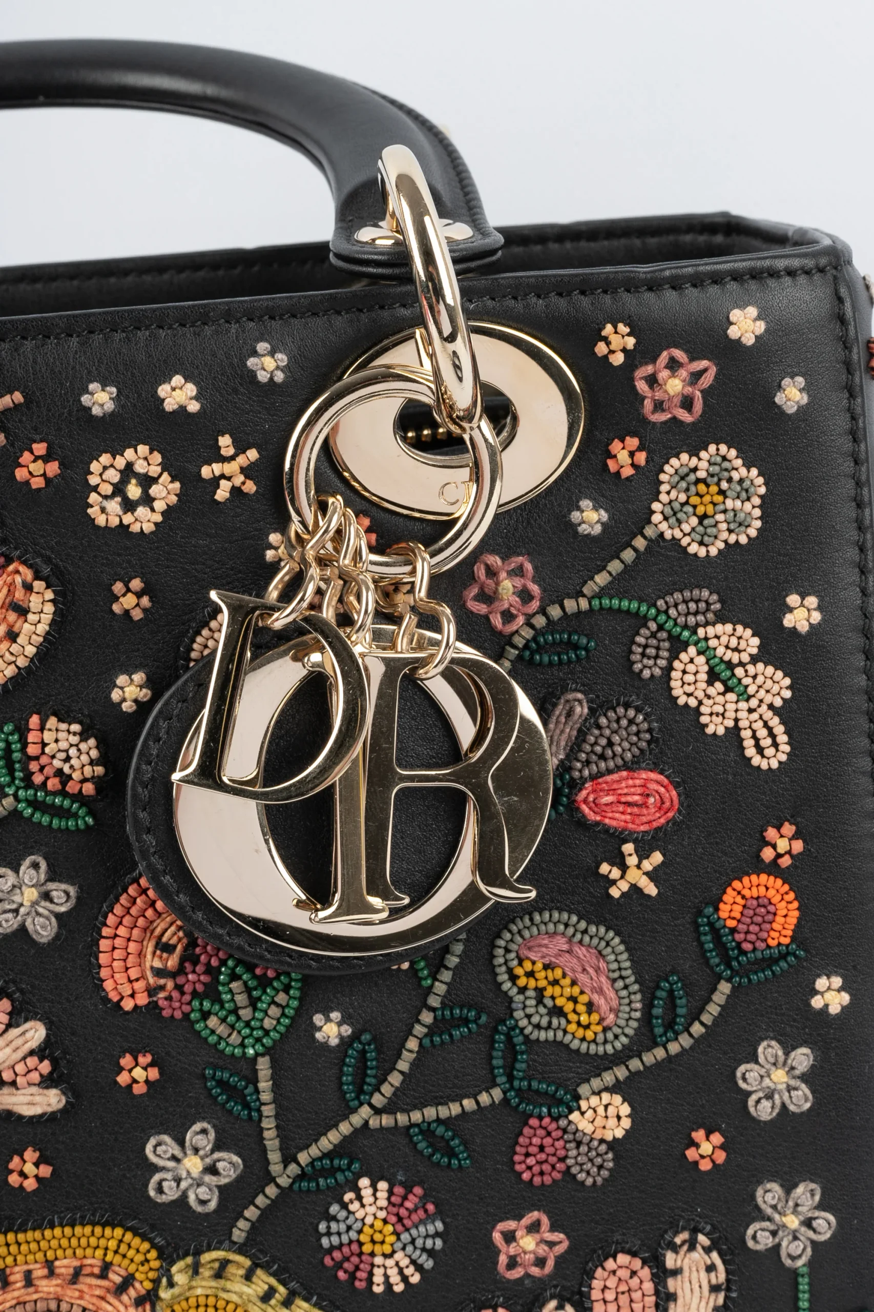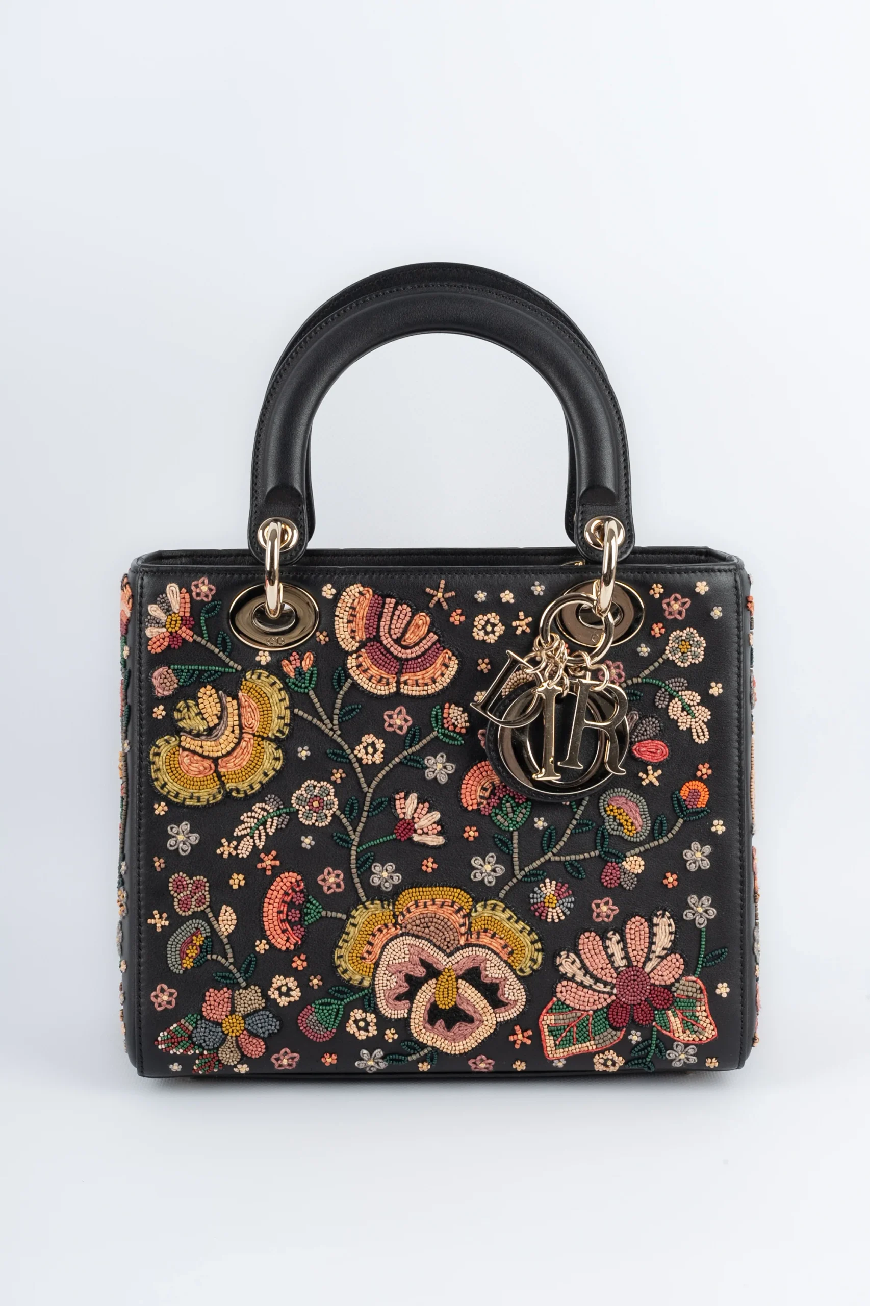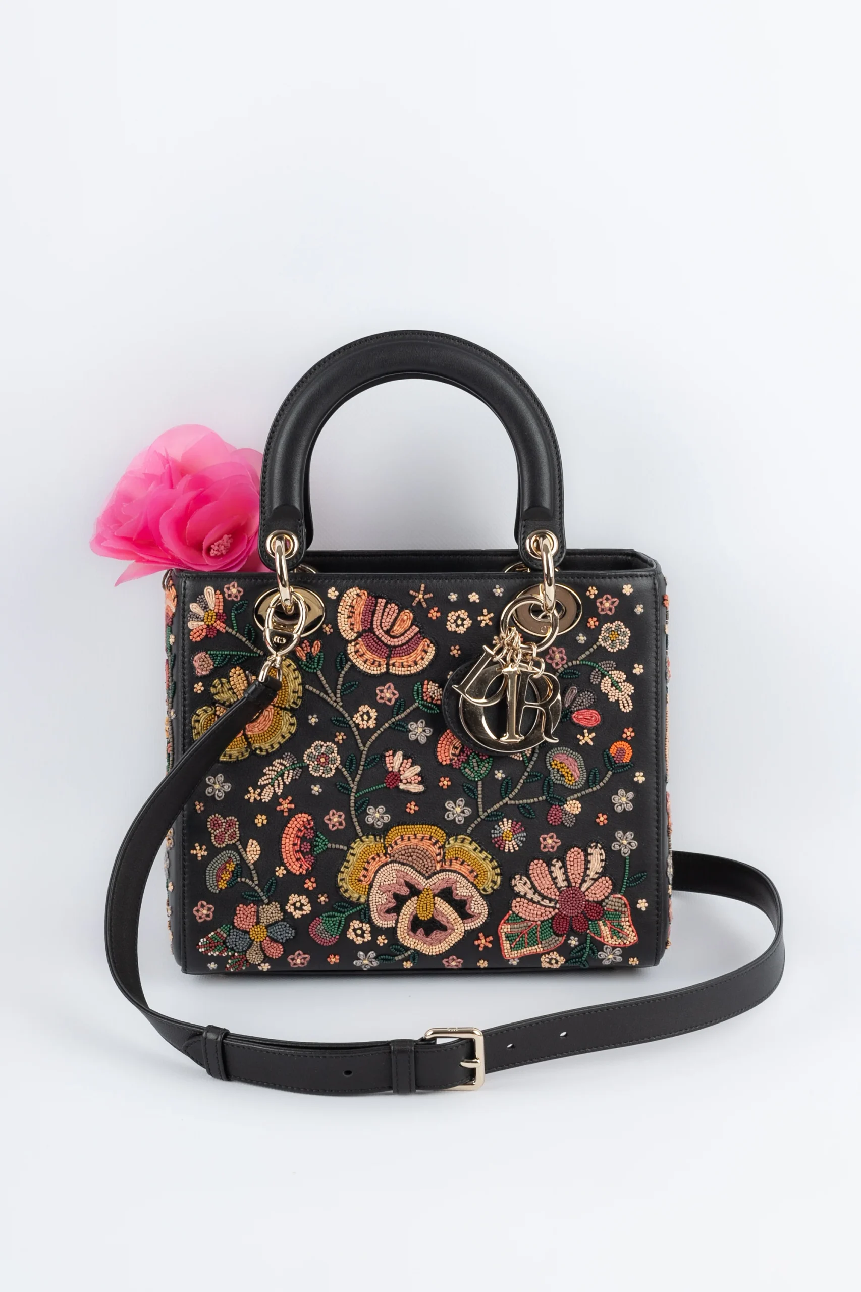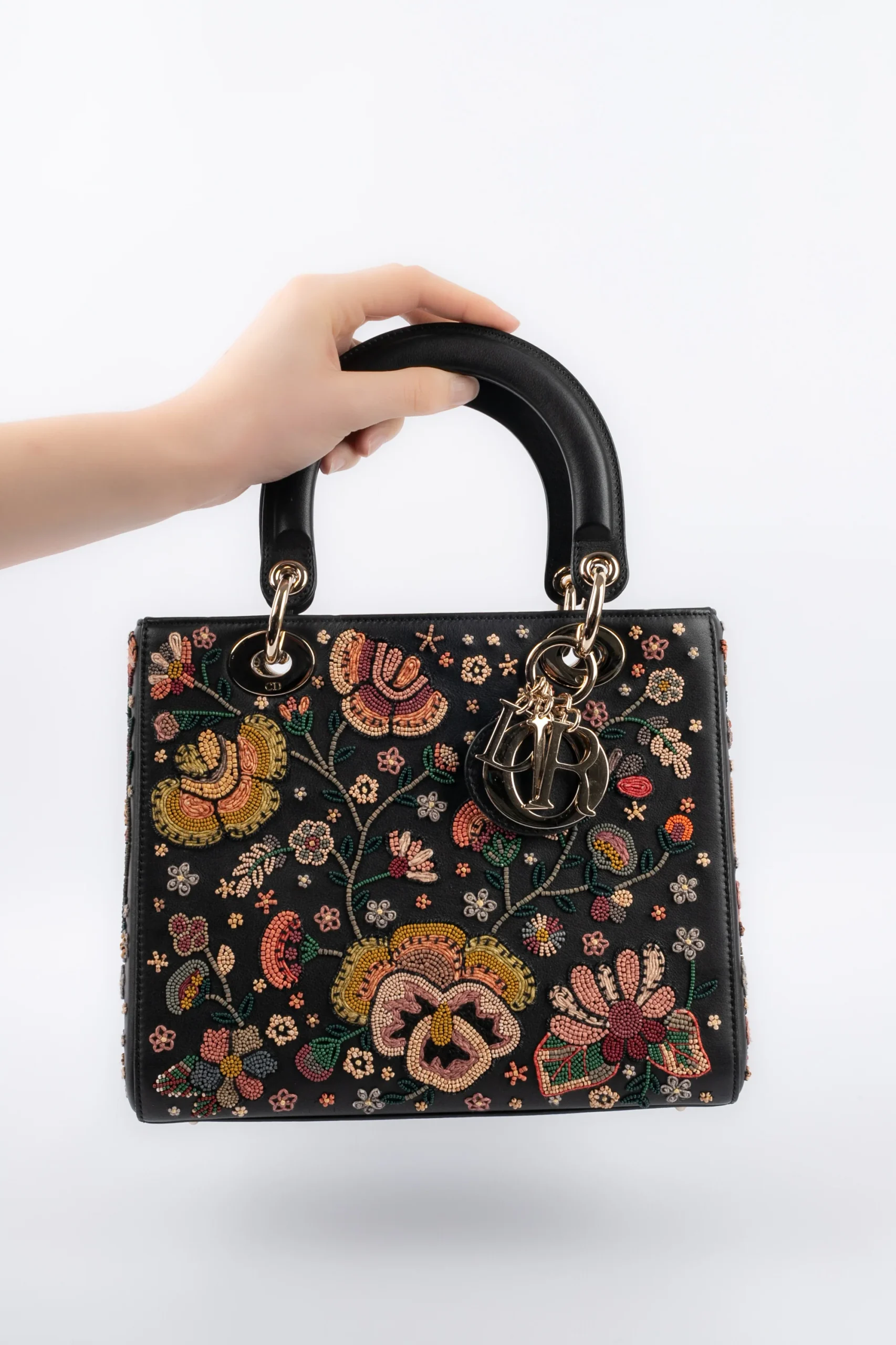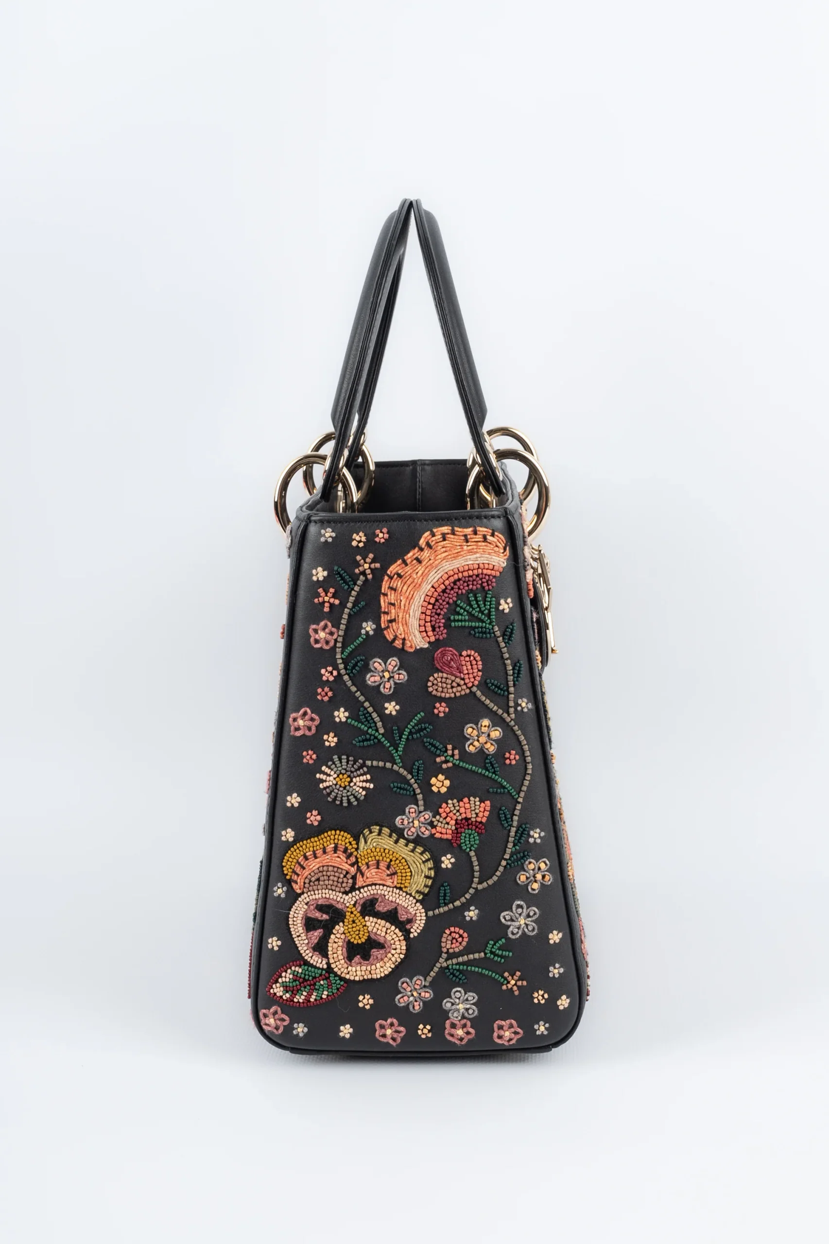 DIOR -(Made in Italy) Sac en cuir noir brodé d’un motif floral en perles multicolore. Attributs en métal doré. Modèle Lady Dior collection resort 2019.