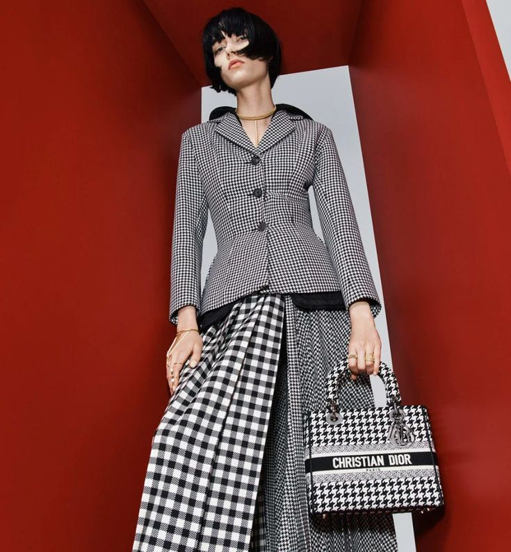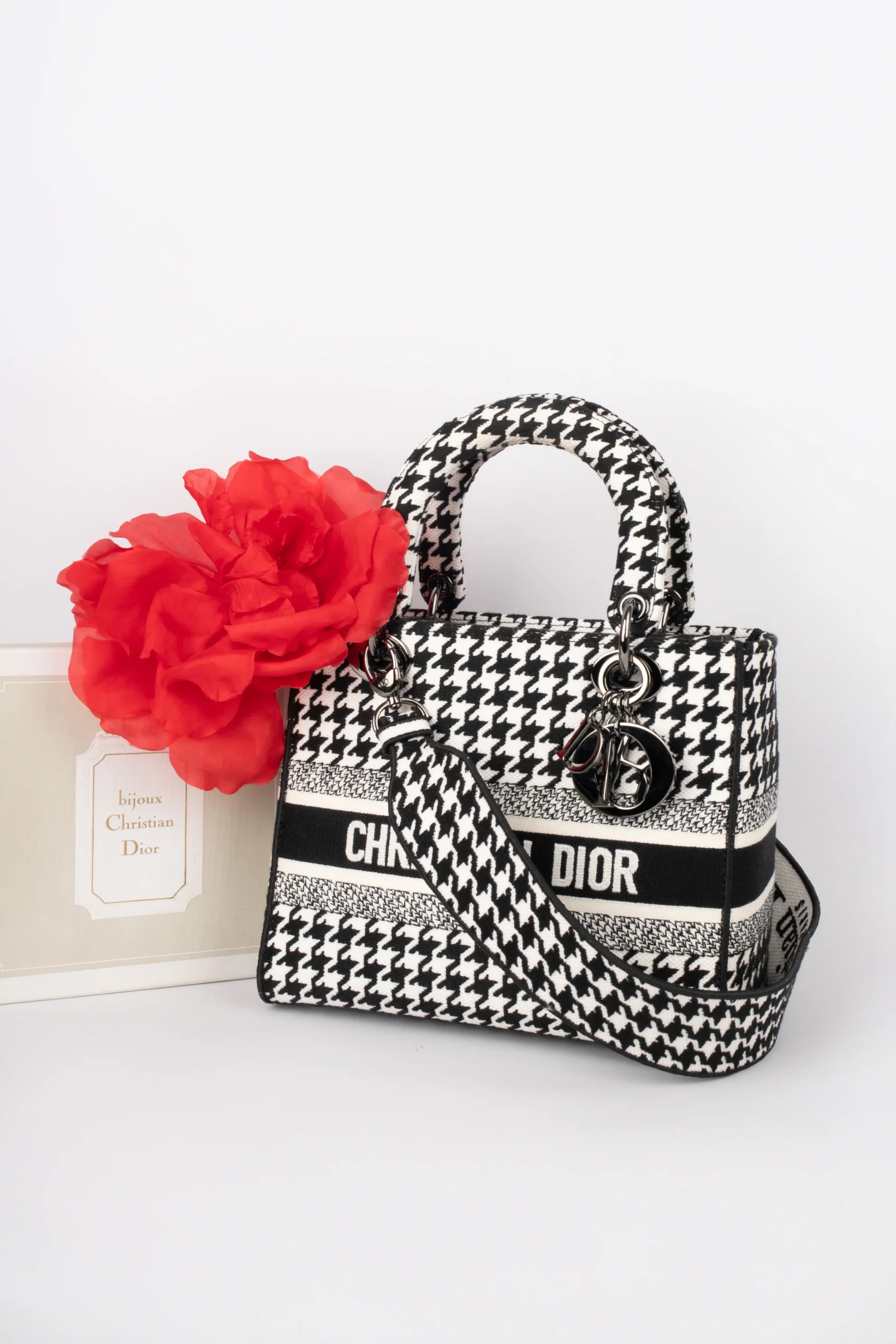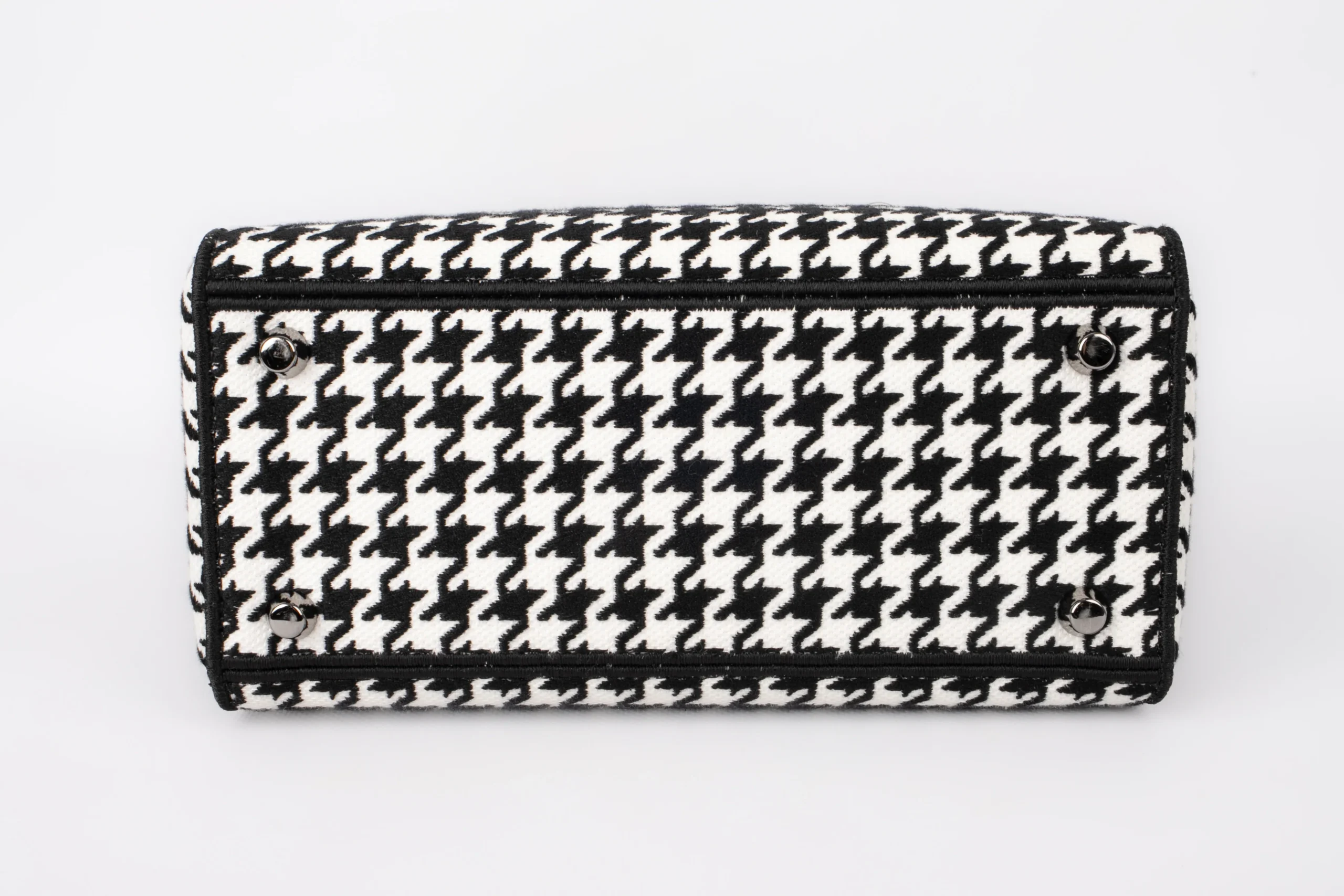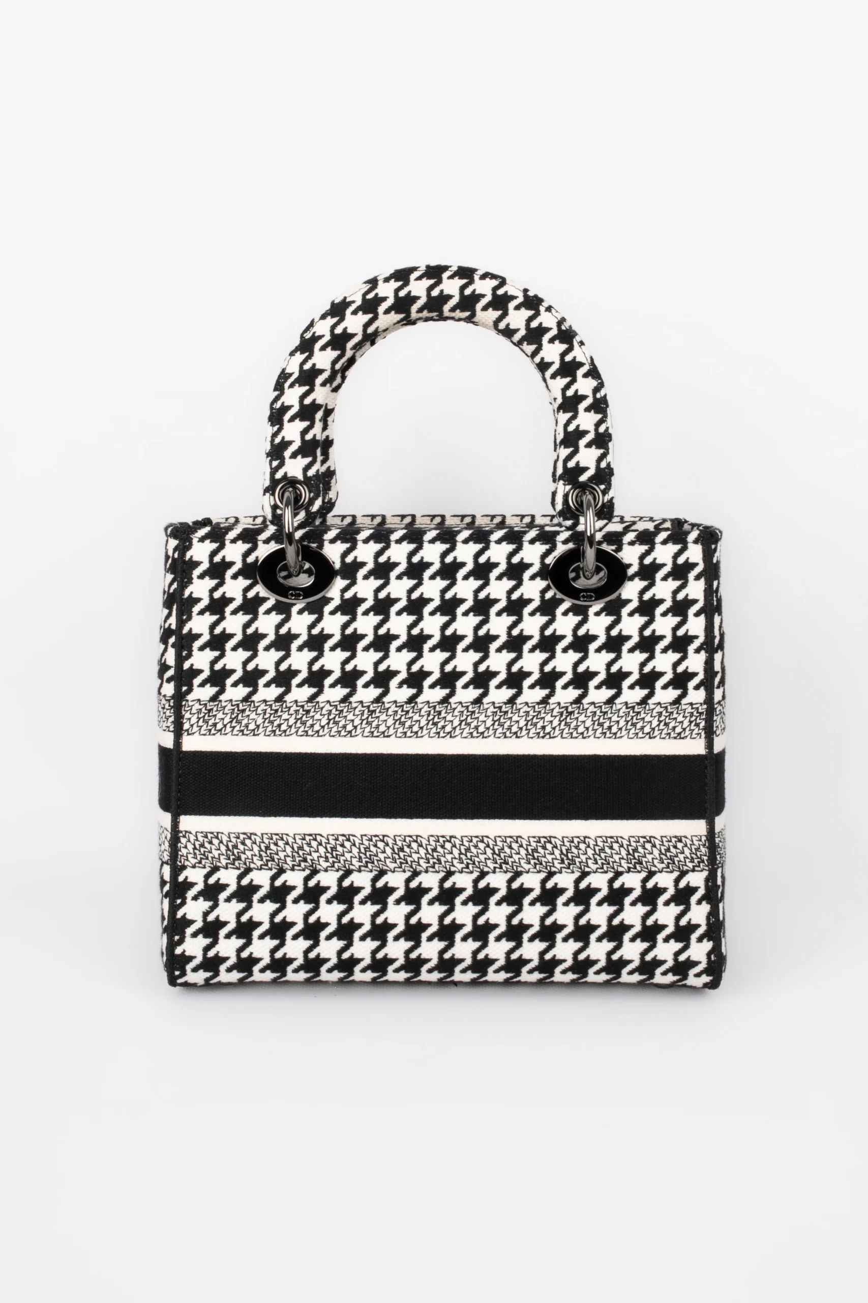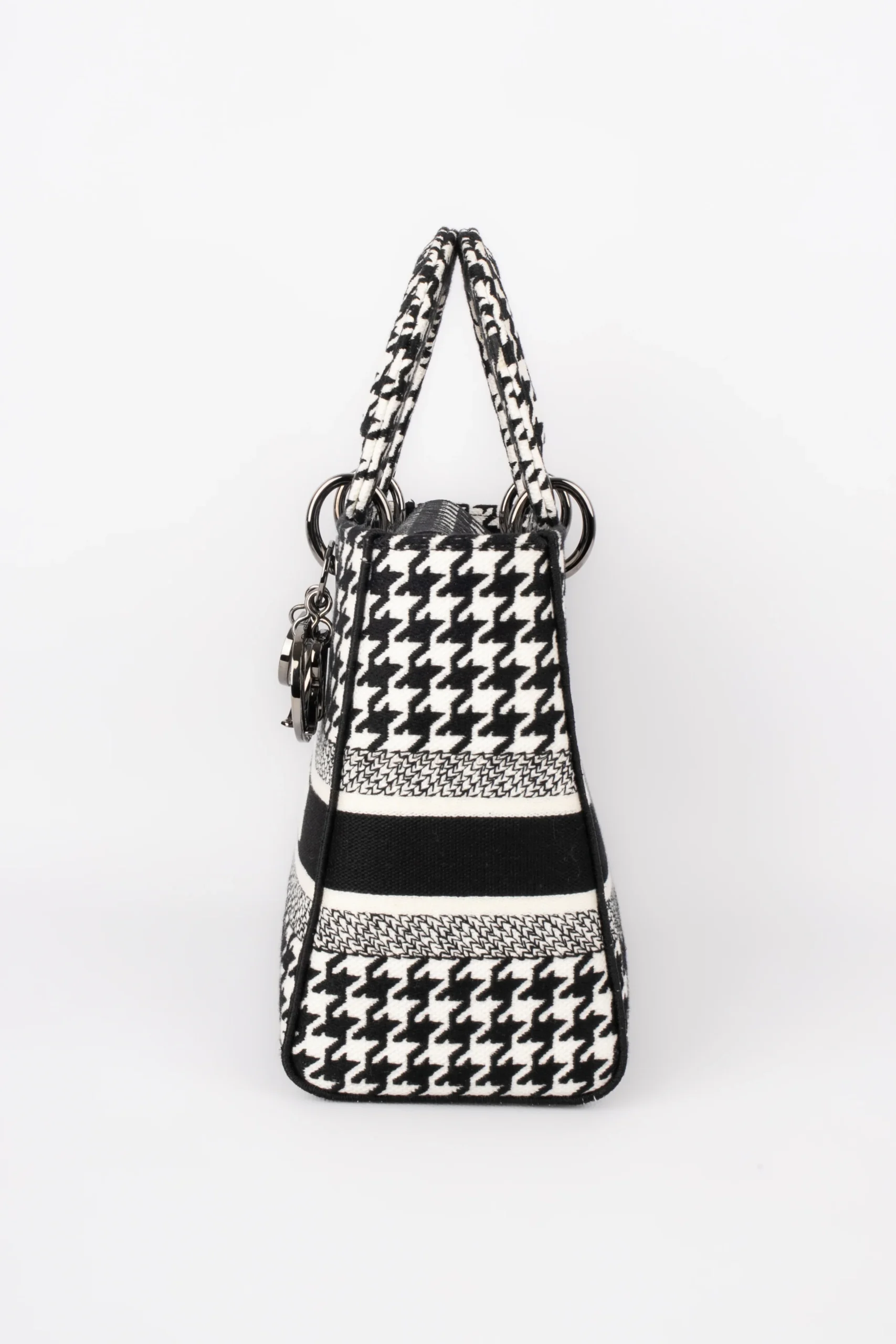 DIOR -Sac Lady Dior en toile pied de poule noire, blanche, double poignée dont une retenant des breloques abécédaires au nom de la Maison, anse bandoulière amovible. Numéro de série présent, collection 2022.
