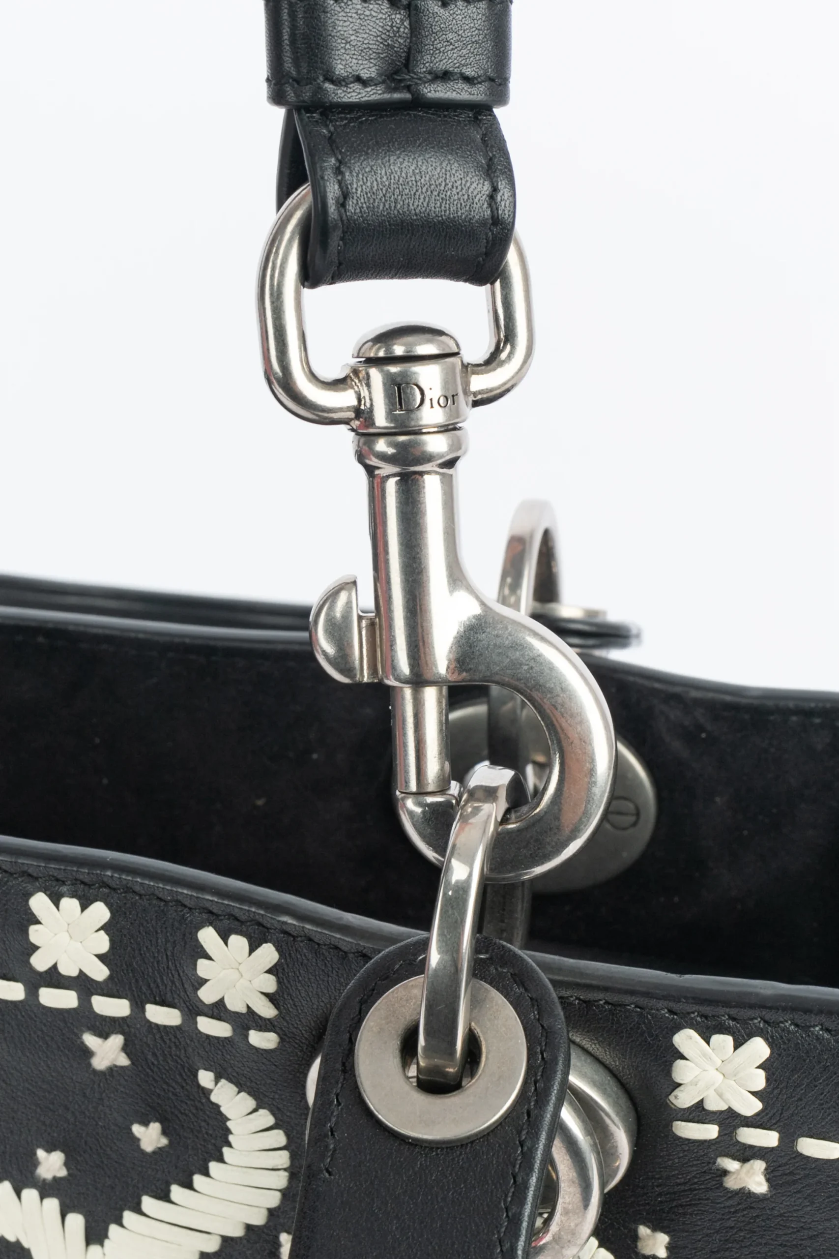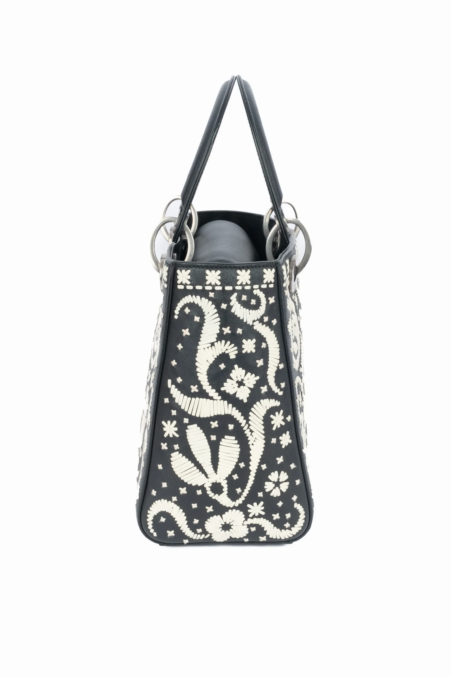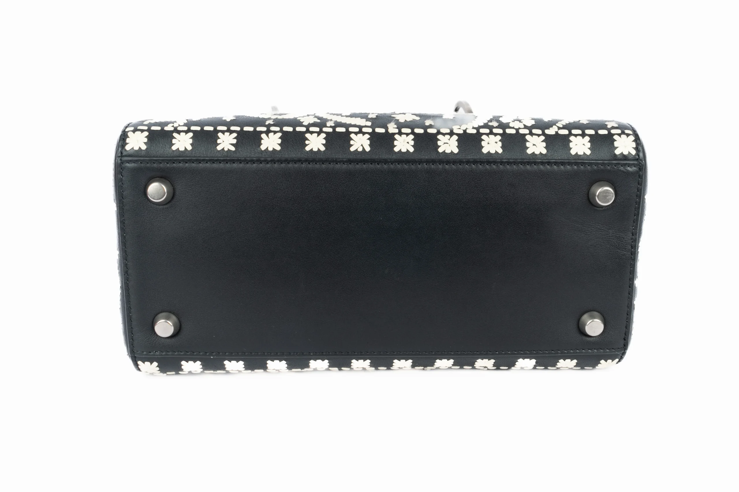 DIOR – (Made in Italy) Sac Lady Dior en cuir noir et blanc formant un motif floral, charms lettres au nom de la maison en métal argenté foncé. Anse bandoulière amovible. Collection 2018 sous la direction artistique de Maria Grazia Chiuri.