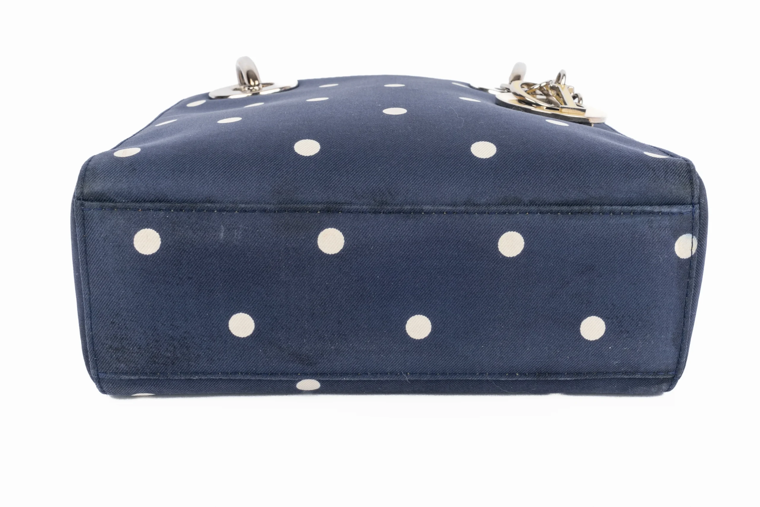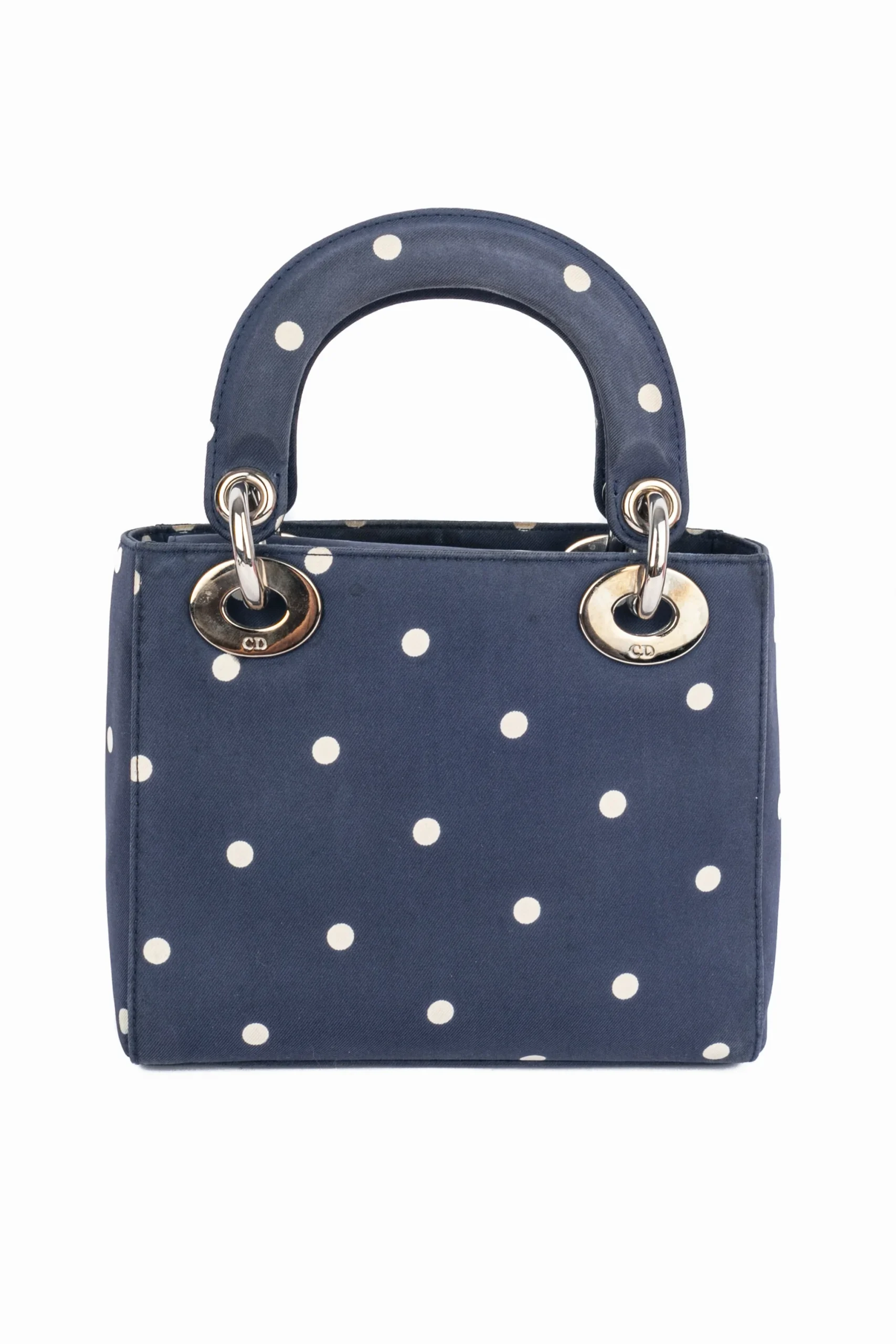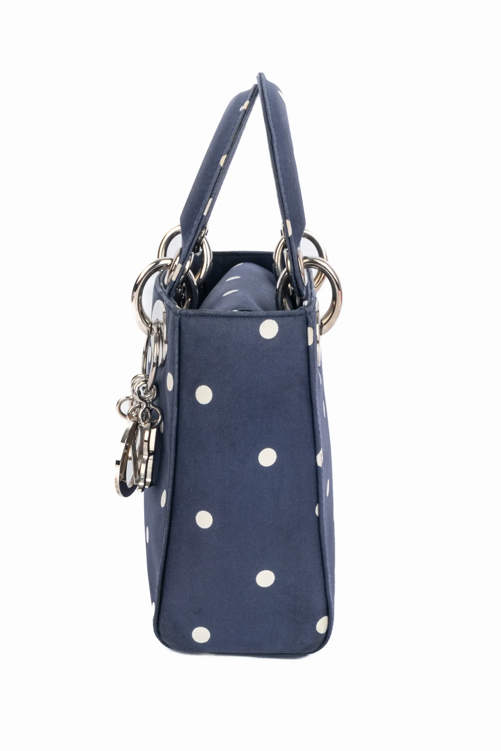DIOR -(Made in Italy) Sac Lady Dior mini en soie bleu marine imprimé de pois blancs. rabat, double poignée dont une retenant des breloques abécédaires au nom de la Maison. Collection 1997, sous la direction artistique de John Galliano.