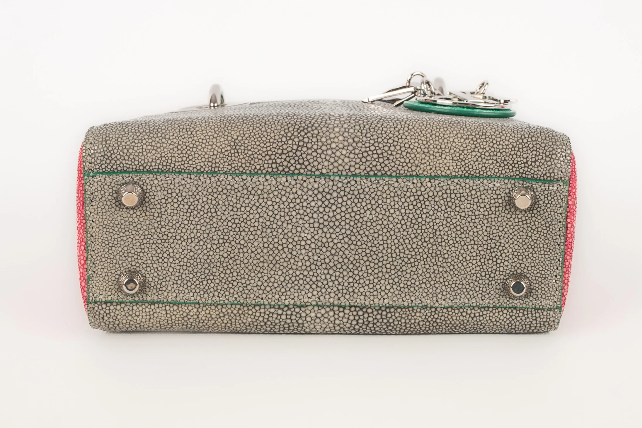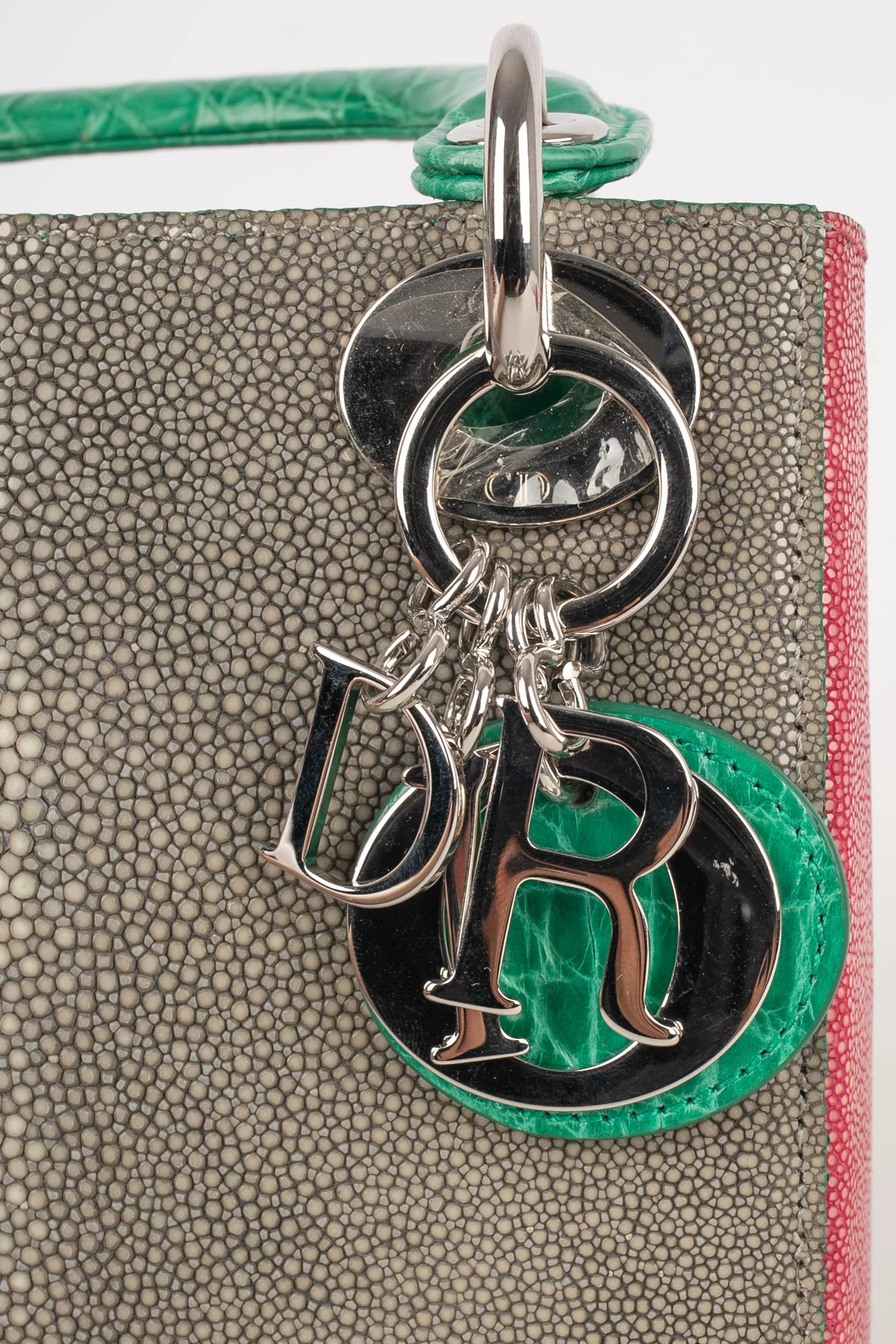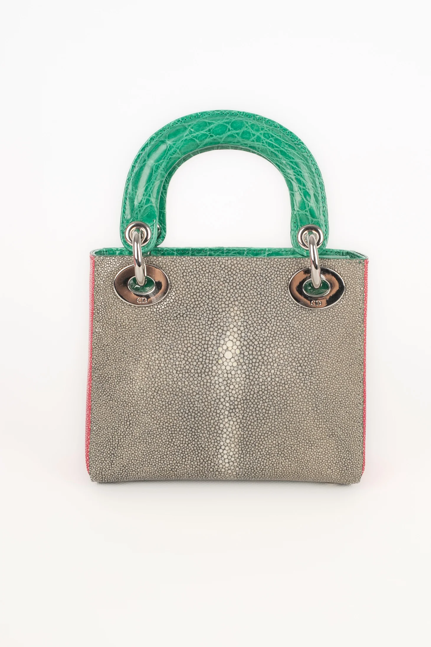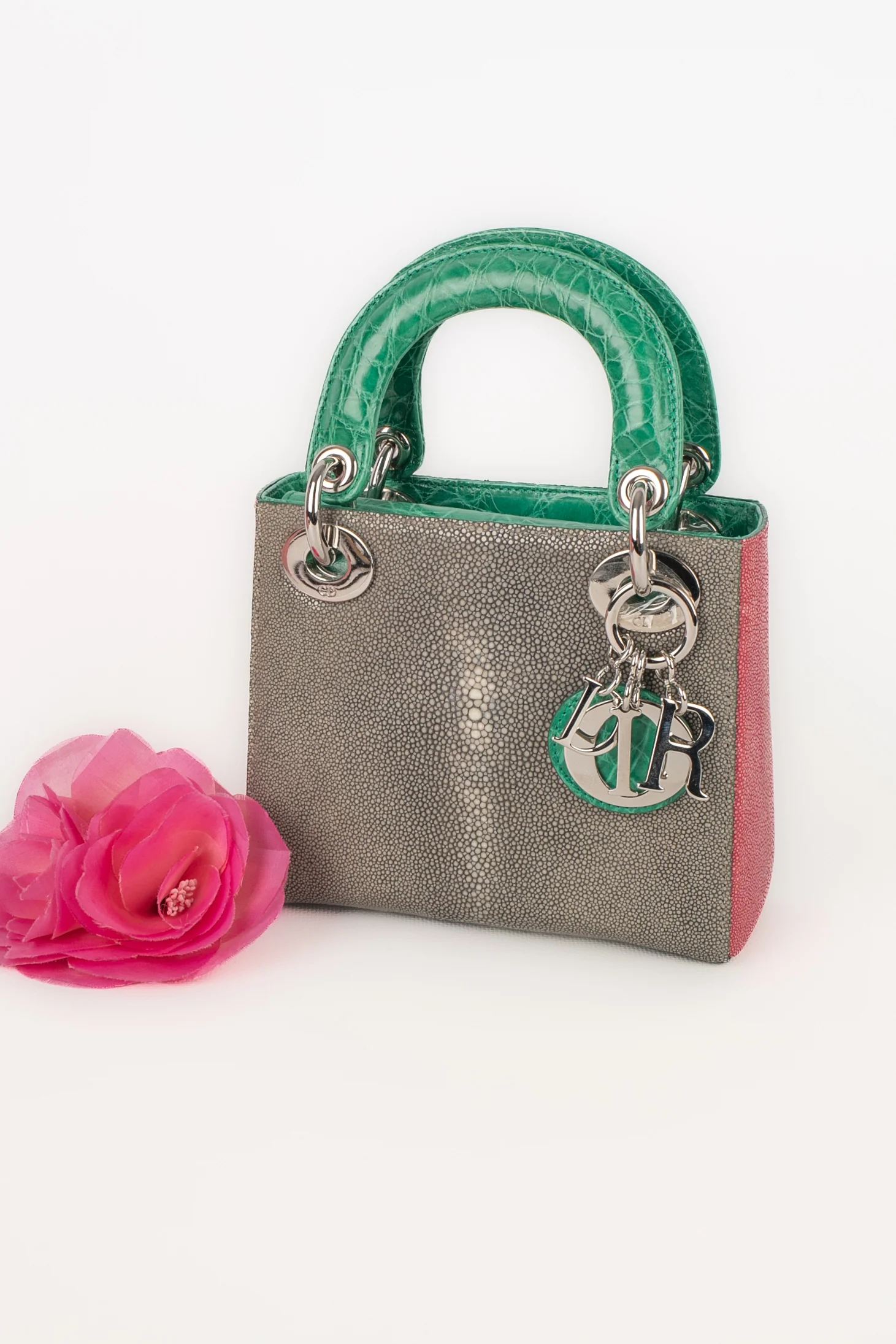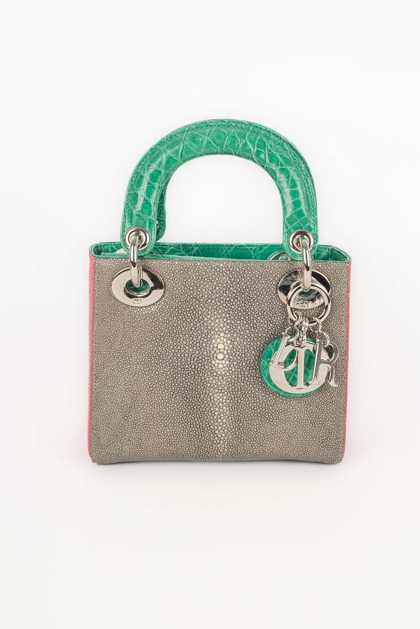 DIOR -(Made in Italy) Sac Lady Dior mini en cuir de galuchat rose et gris. Poignets et rabat en alligator vert émeraude, bandoulière amovible. Numéro de série présent. Collection 2013.