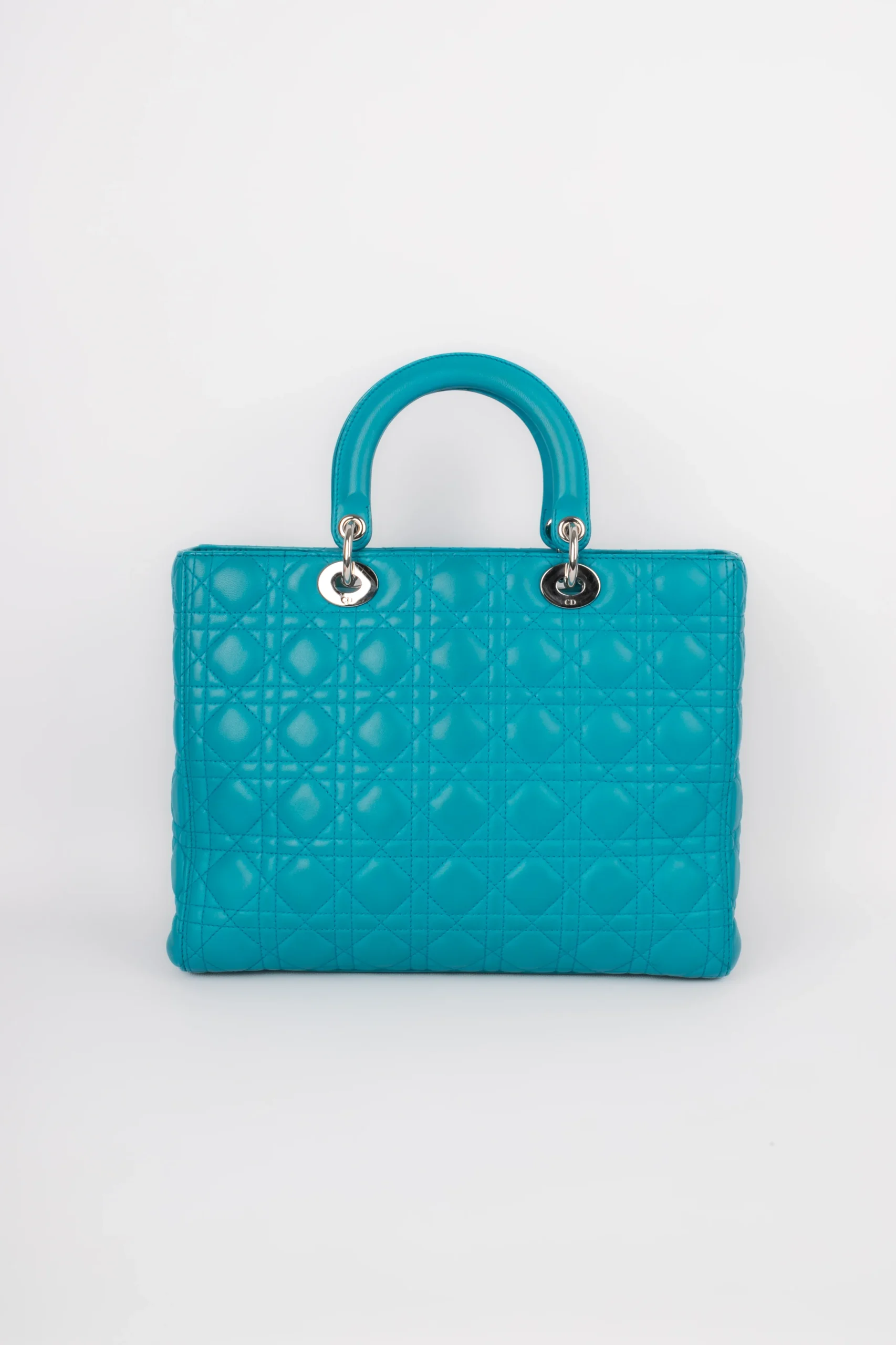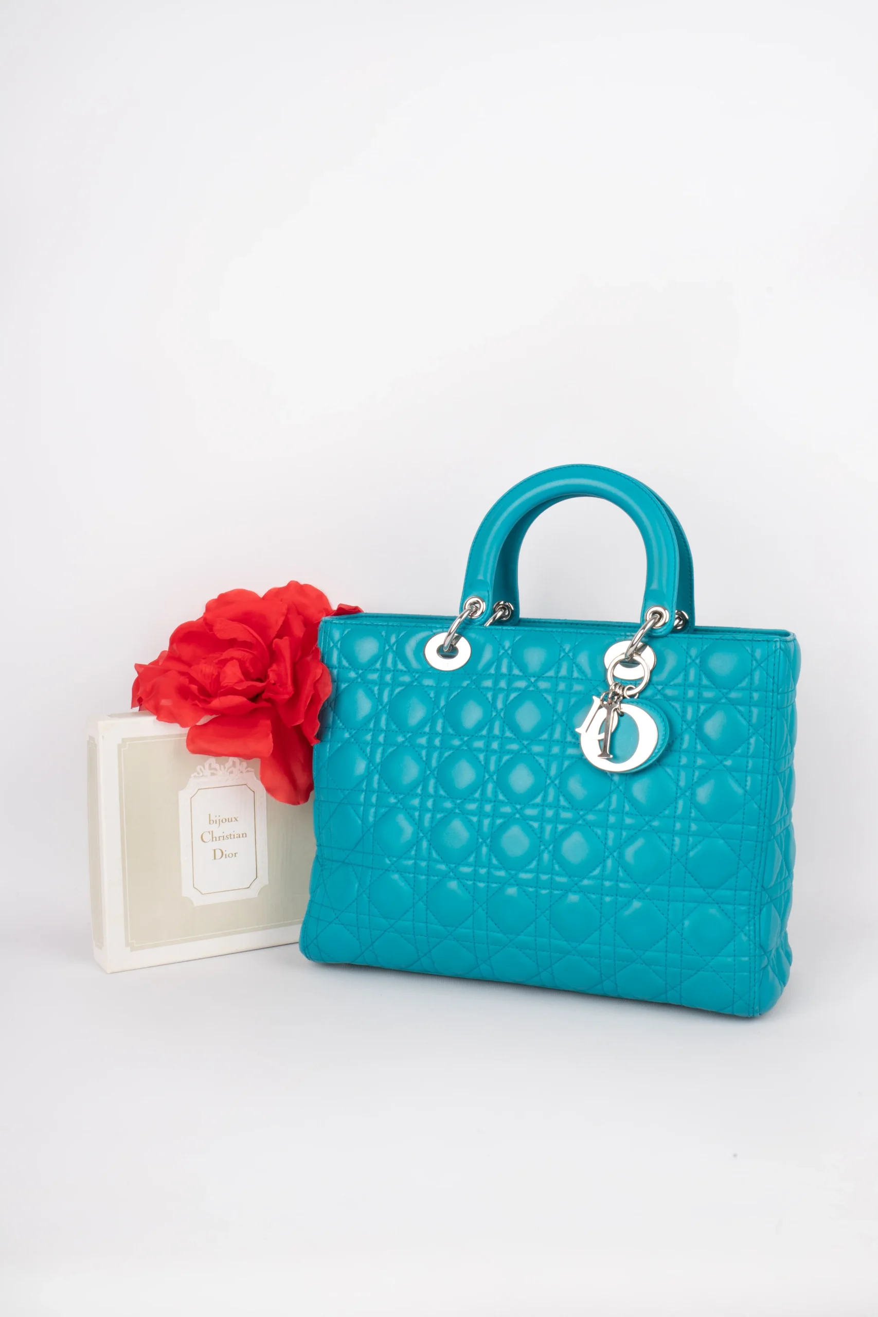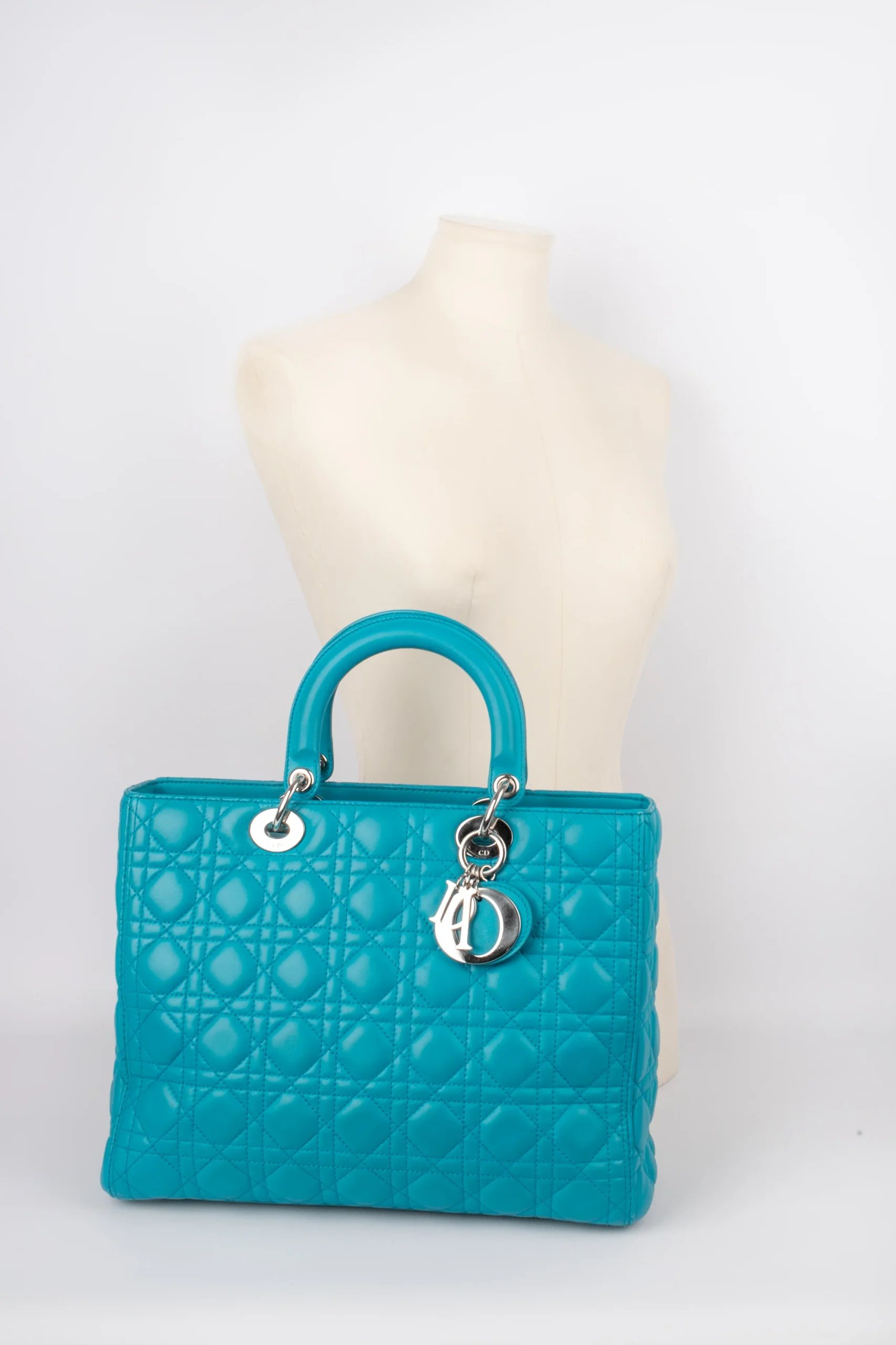 DIOR -(Made in Italy) Sac Lady Dior en cuir matelassé bleu turquoise, attributs en métal argenté. Numéro de série présent. Collection 2013. Condition : Très bon état Dimensions : Longueur : 31 cm – Hauteur : 26 cm – Profondeur : 9 cm – Anse : 31 cm