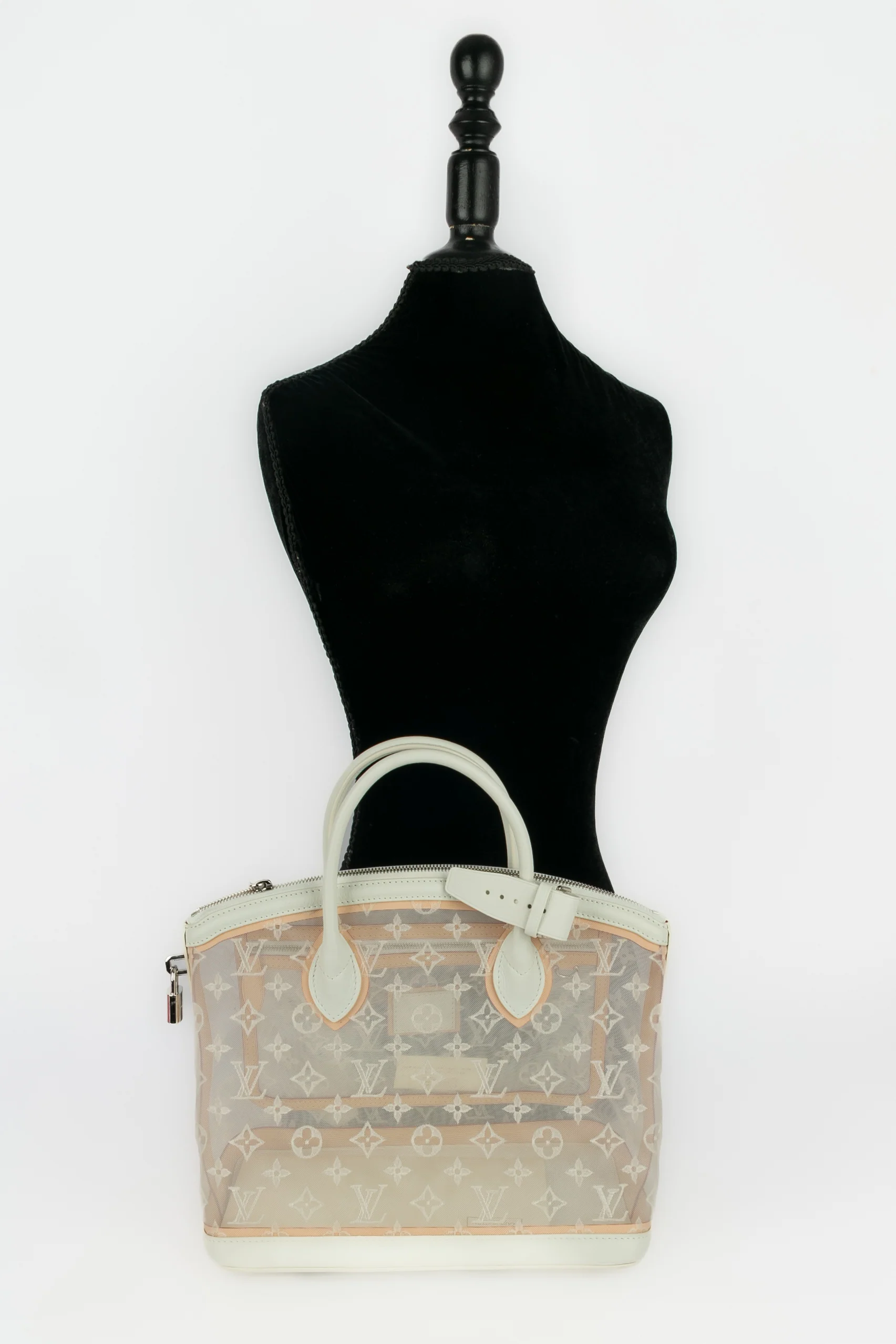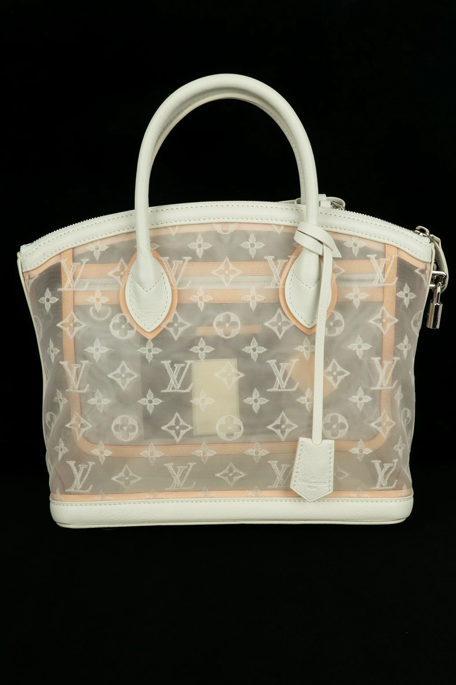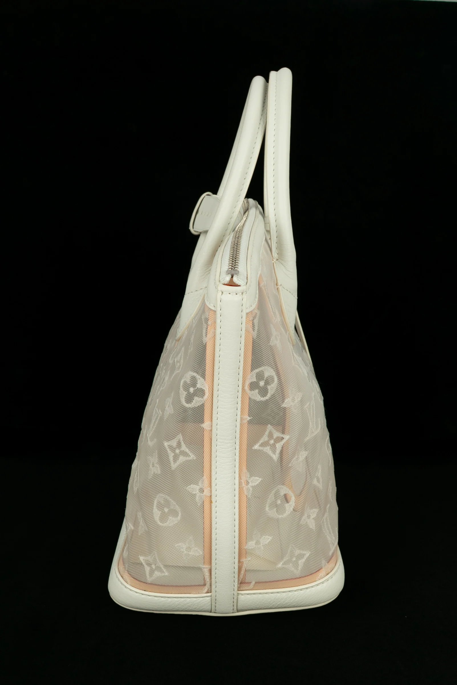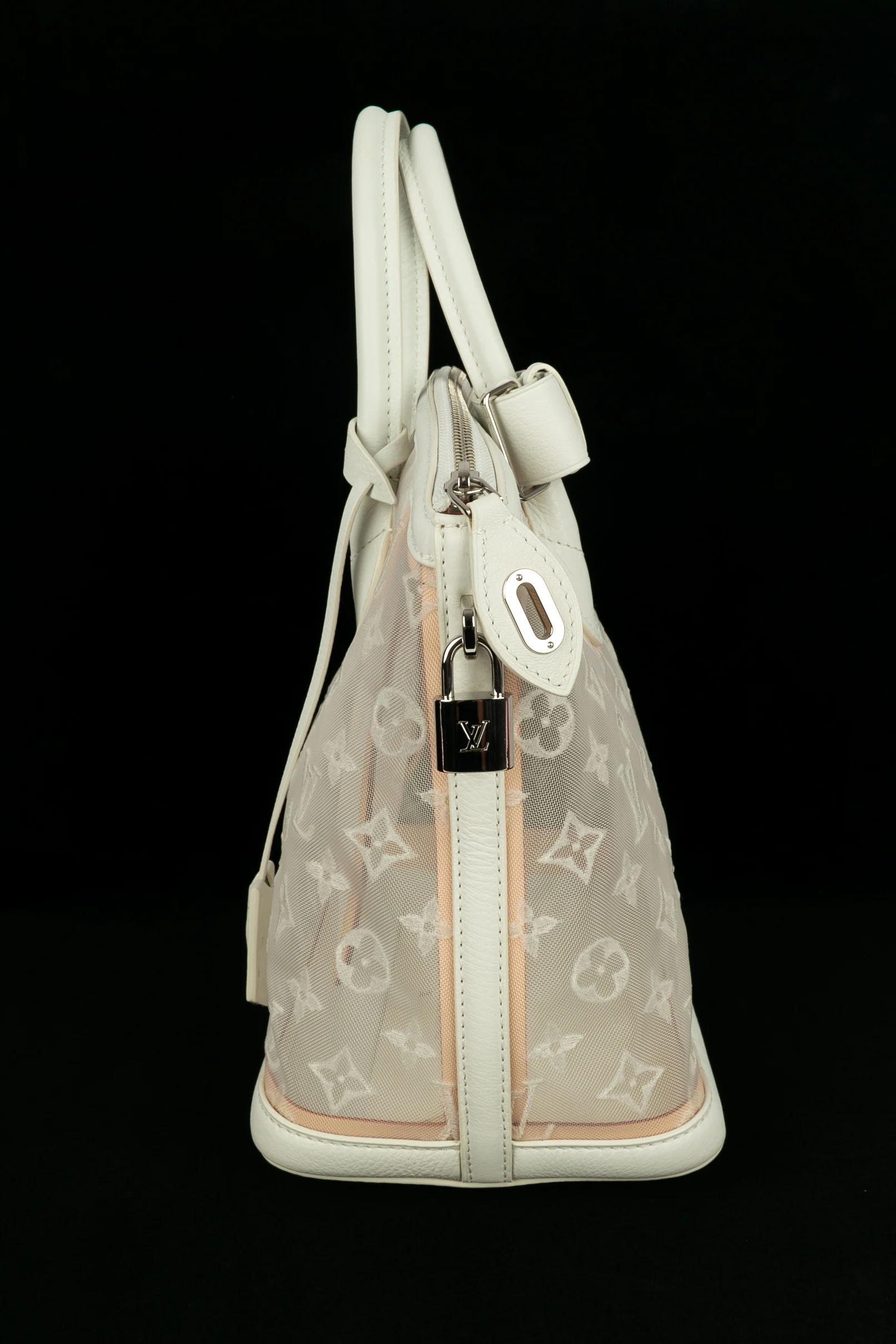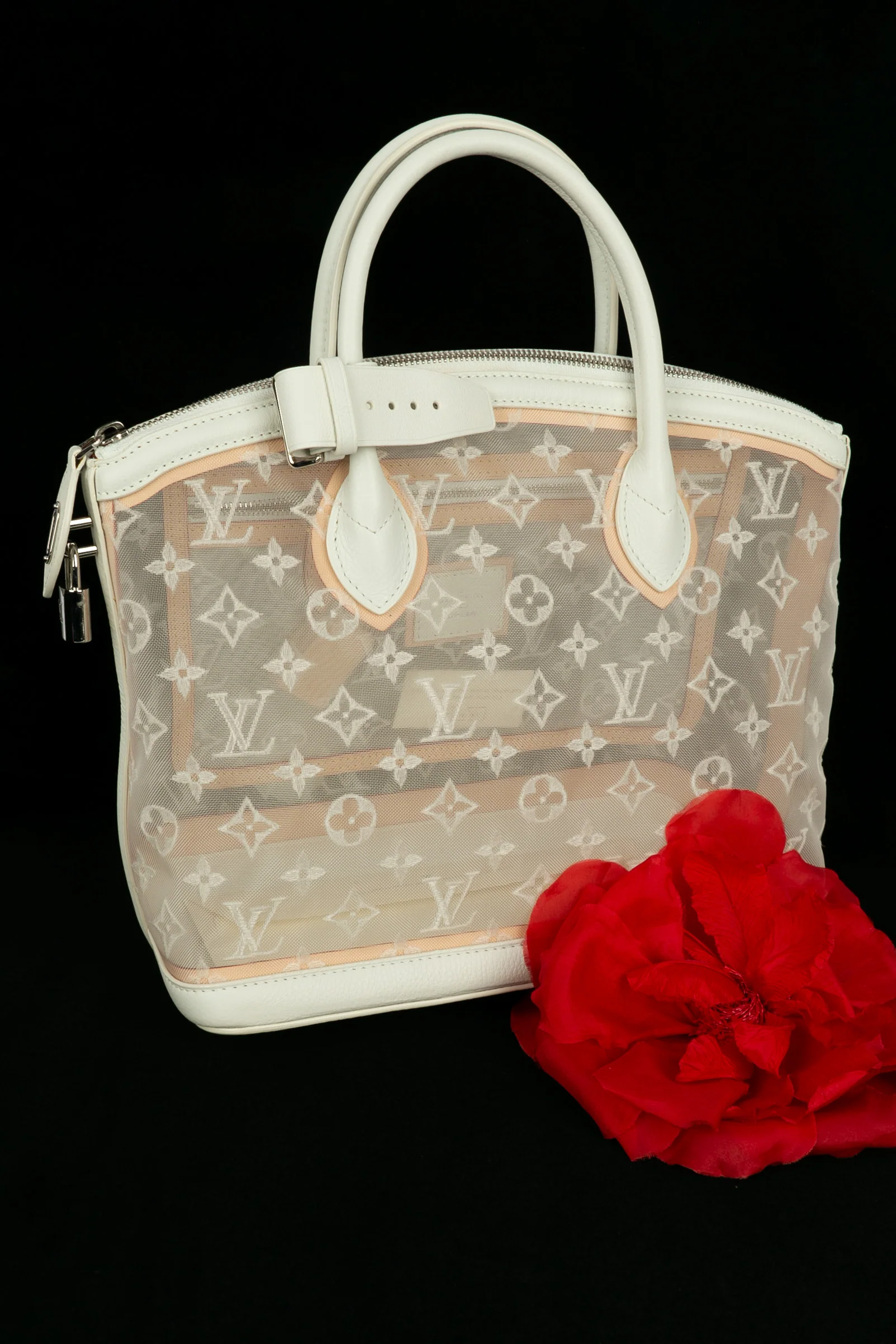 LOUIS VUITTON – (Made in Italy) Sac en toile tulle monogram et cuir blanc, métal argenté, cadenas et clés. Collection Printemps-Eté 2012 sous la direction de Marc Jacobs.