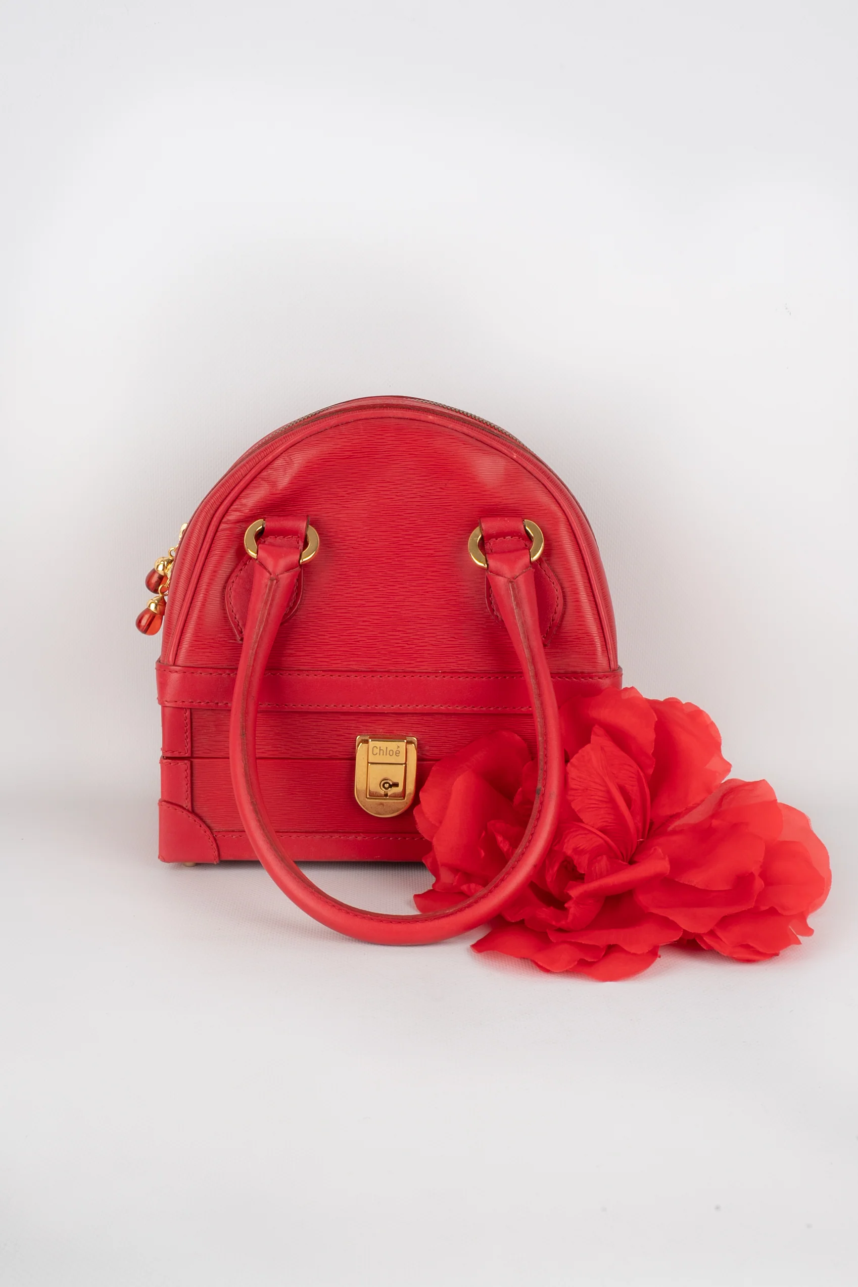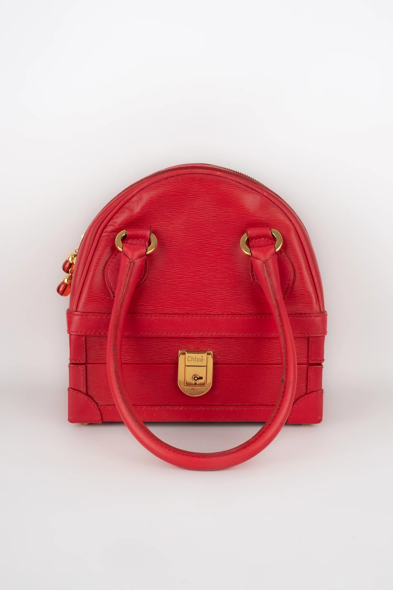 CHLOà -Sac mallette en veau pressé rouge, double poignée, fermeture éclair, curseur à gouttes en pâte de verre ambrée, bas du sac à caisson.