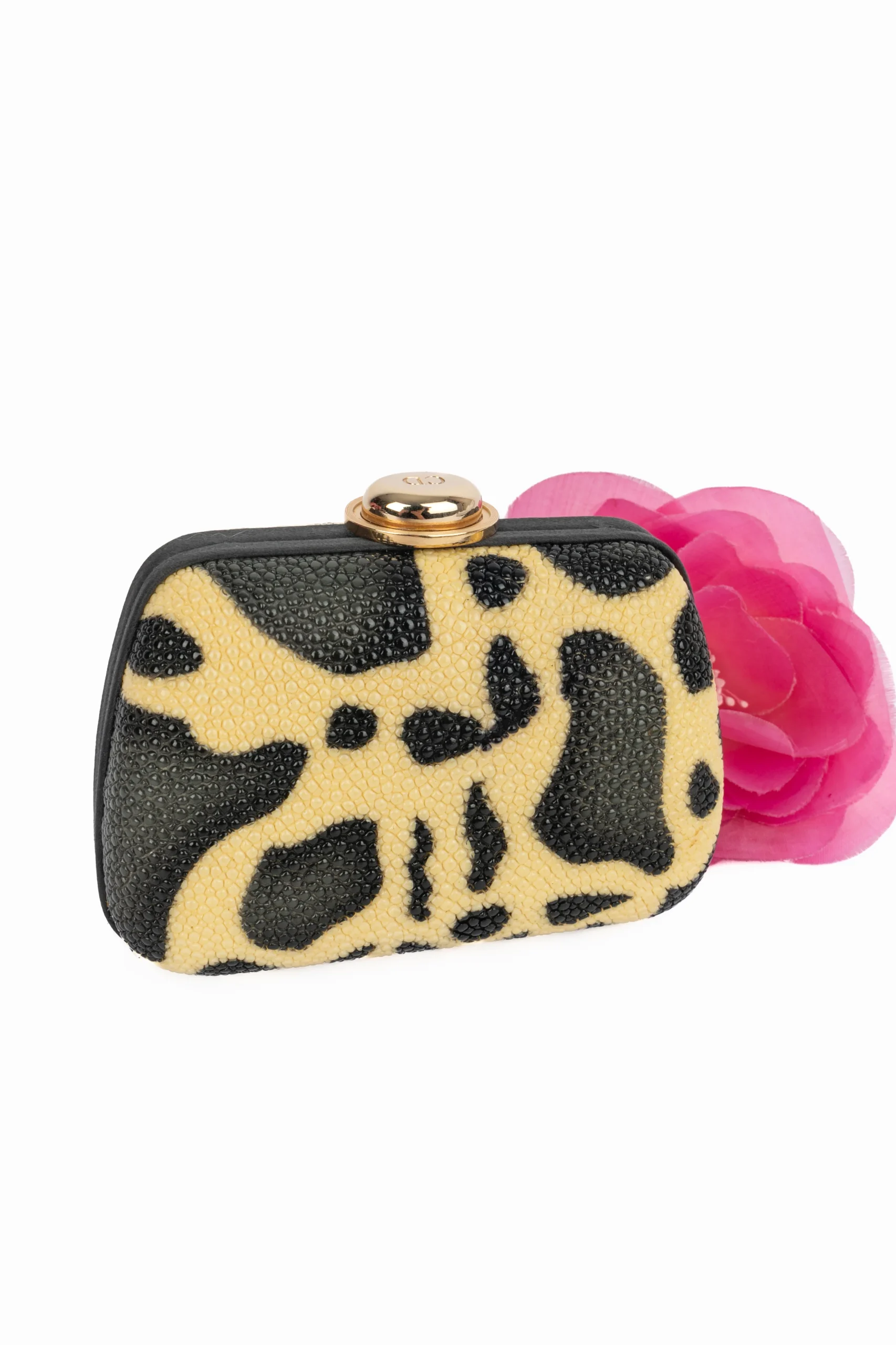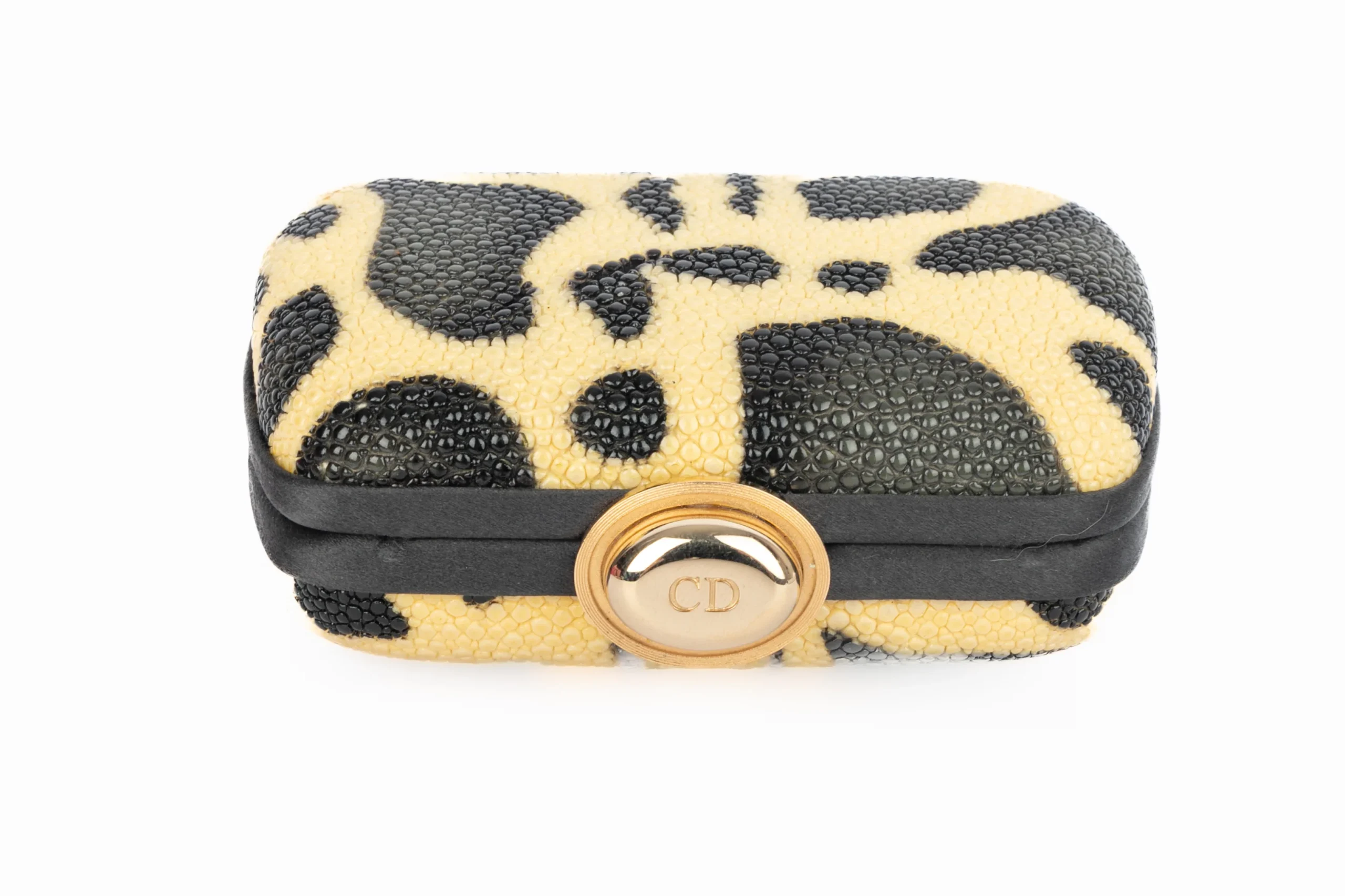 DIOR – (Made in Italy) Minaudière en galuchat beige et noir. Intérieur en satin, fermoir clip en métal doré aux initiales de la Maison. Anse chaine en métal doré. Collection circa 1995, sous la direction artistique de Gianfranco Ferré.