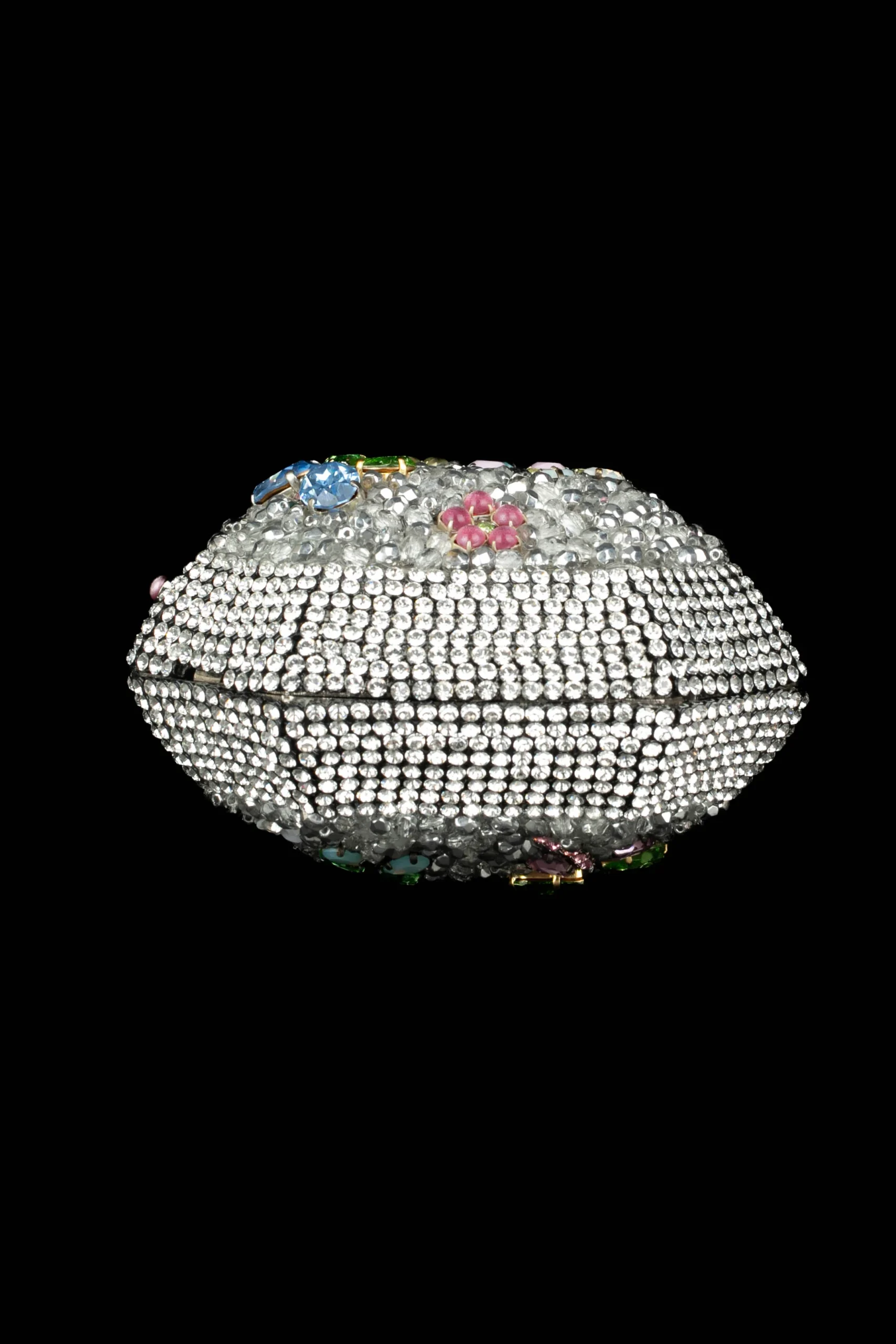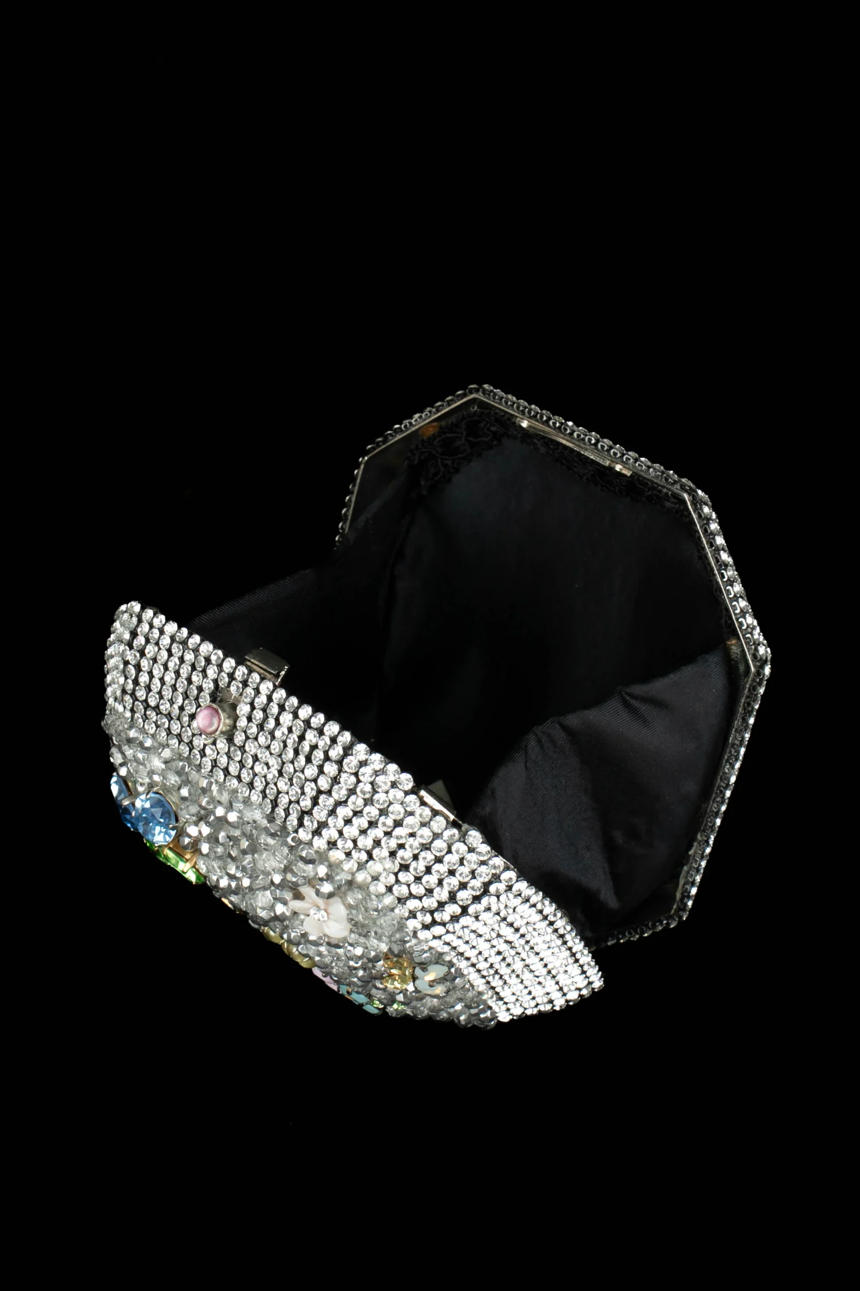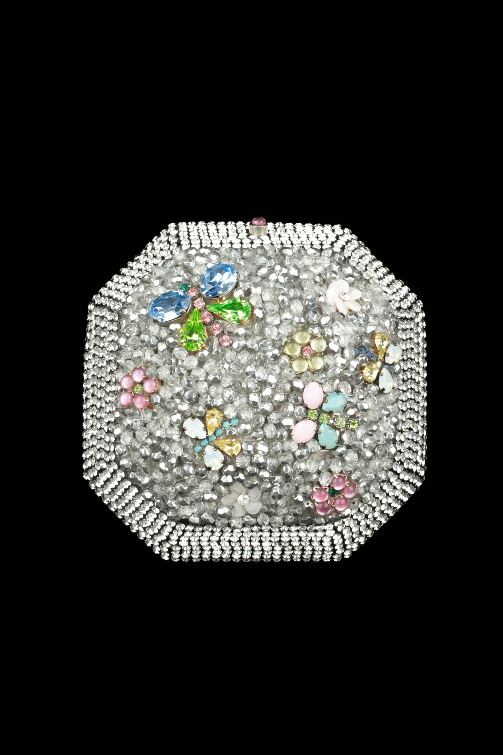 FRANÇOISE MONTAGUE – Minaudière pavée de strass et perles facettés argentés décorés de papillons en strass multicolores. Anse chaîne en métal argenté.