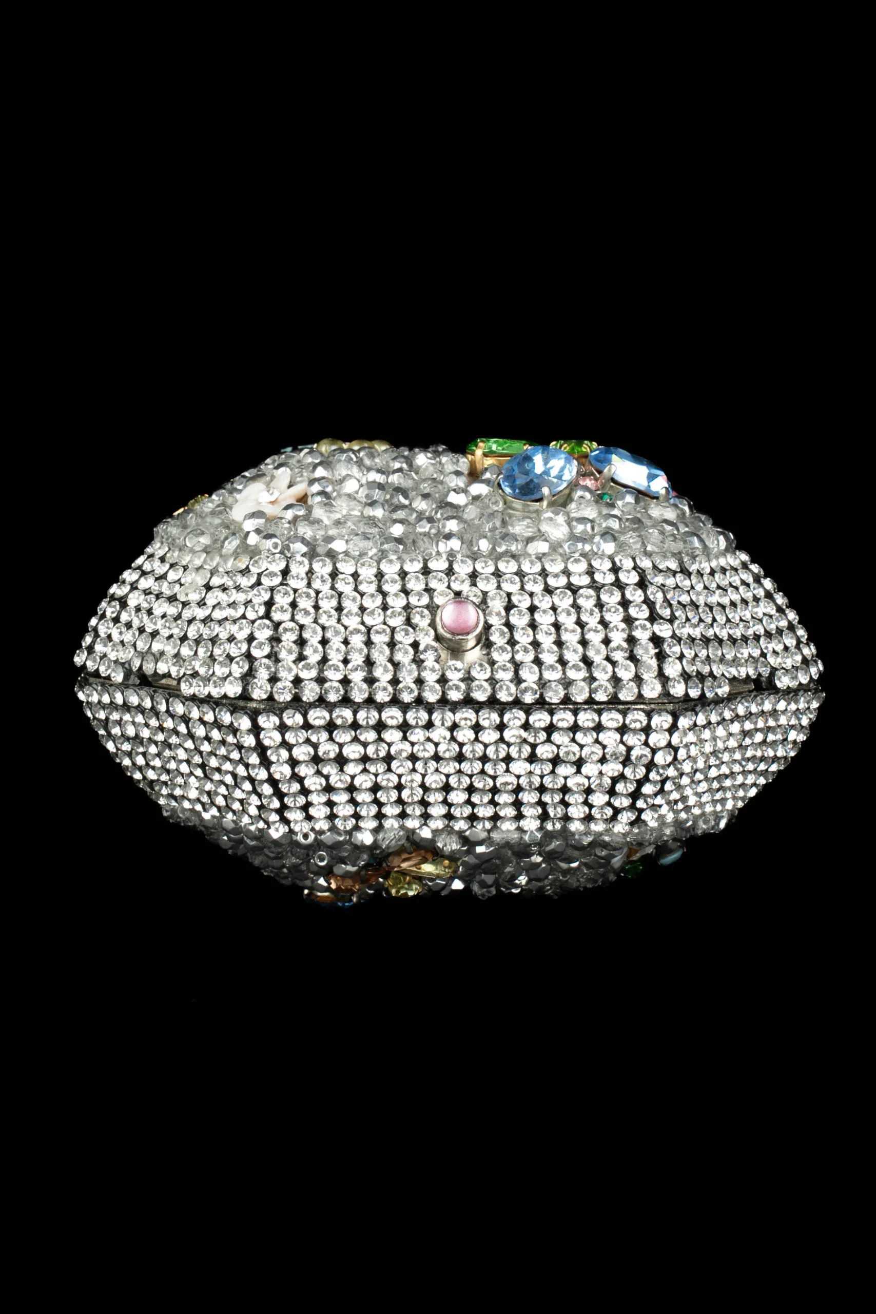 FRANÇOISE MONTAGUE – Minaudière pavée de strass et perles facettés argentés décorés de papillons en strass multicolores. Anse chaîne en métal argenté. Condition : Très bon état Dimensions : Longueur : 14 cm – Hauteur : 14 cm – Profondeur : 2 cm – Anse : 104 cm