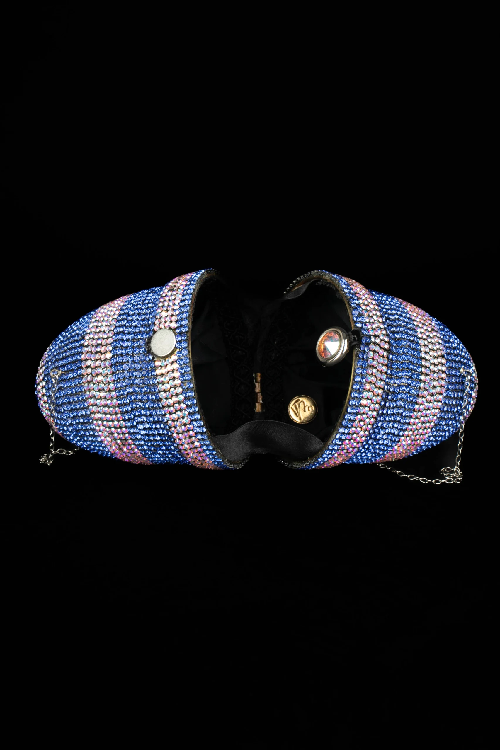 FRANÇOISE MONTAGUE – Minaudière ovale entièrement décorée de strass bleus et argentés. Anse chaîne en métal argenté.