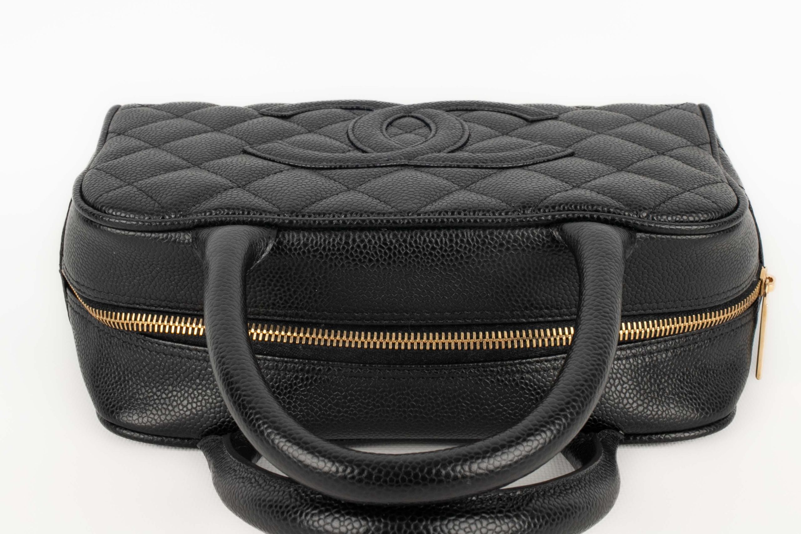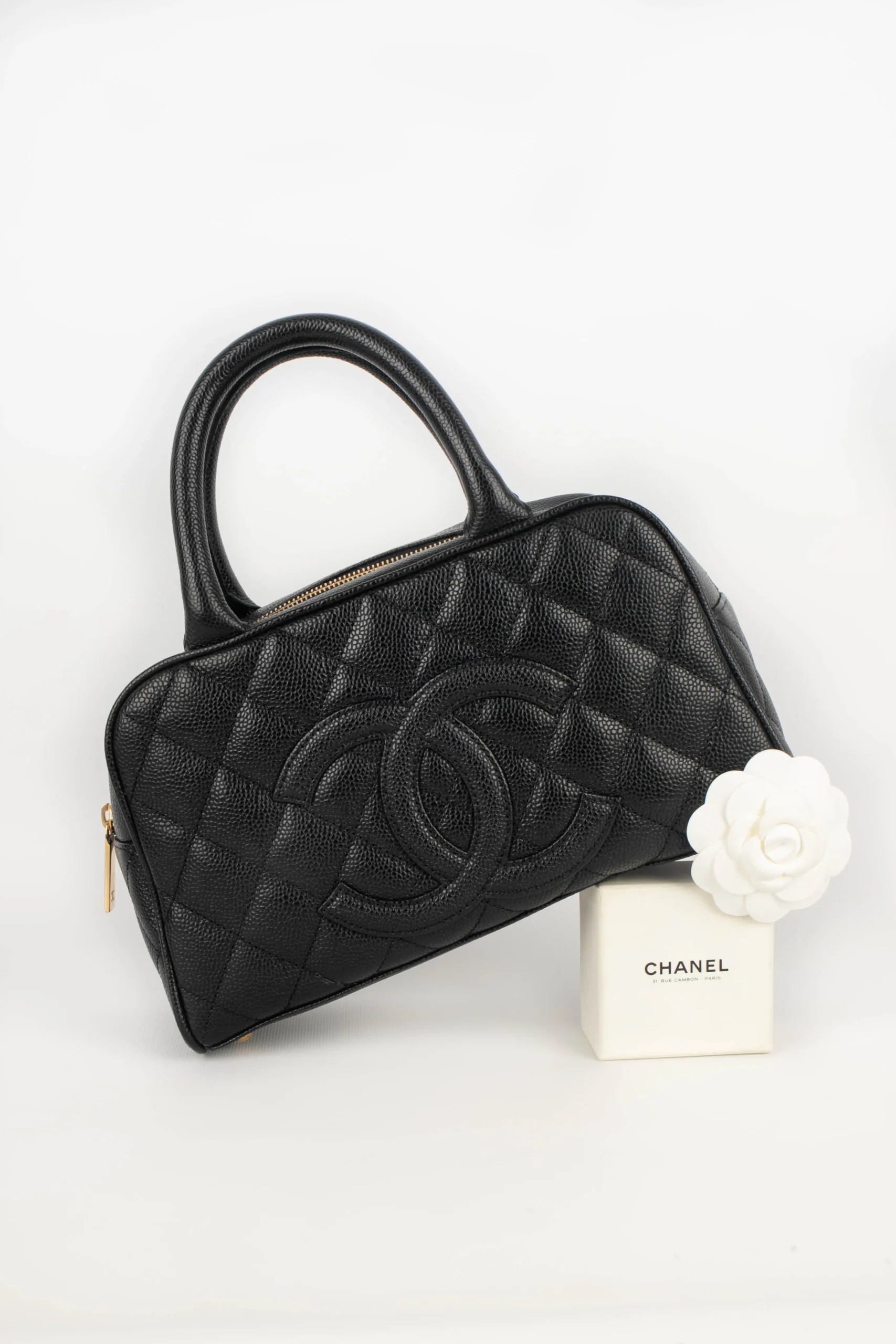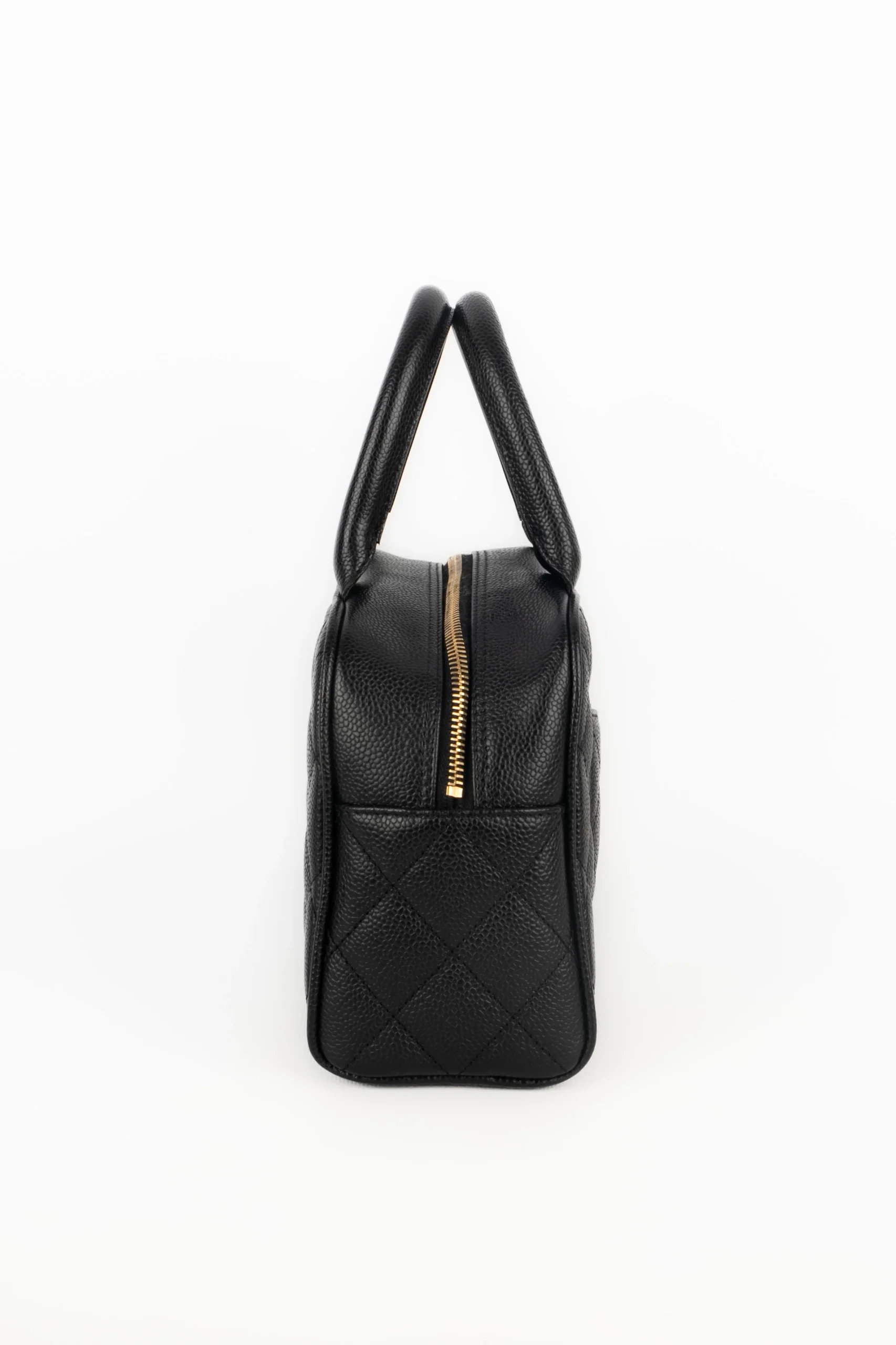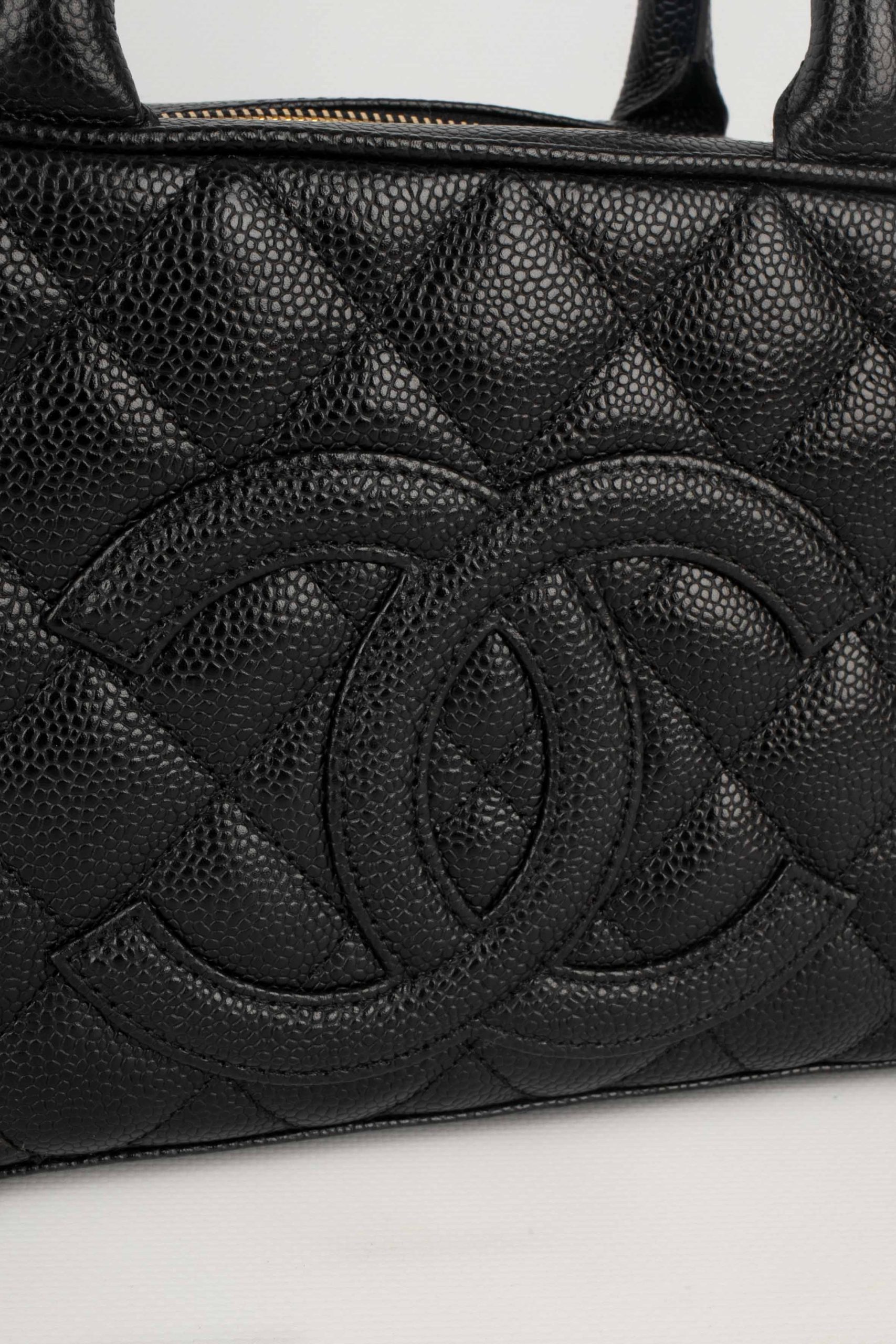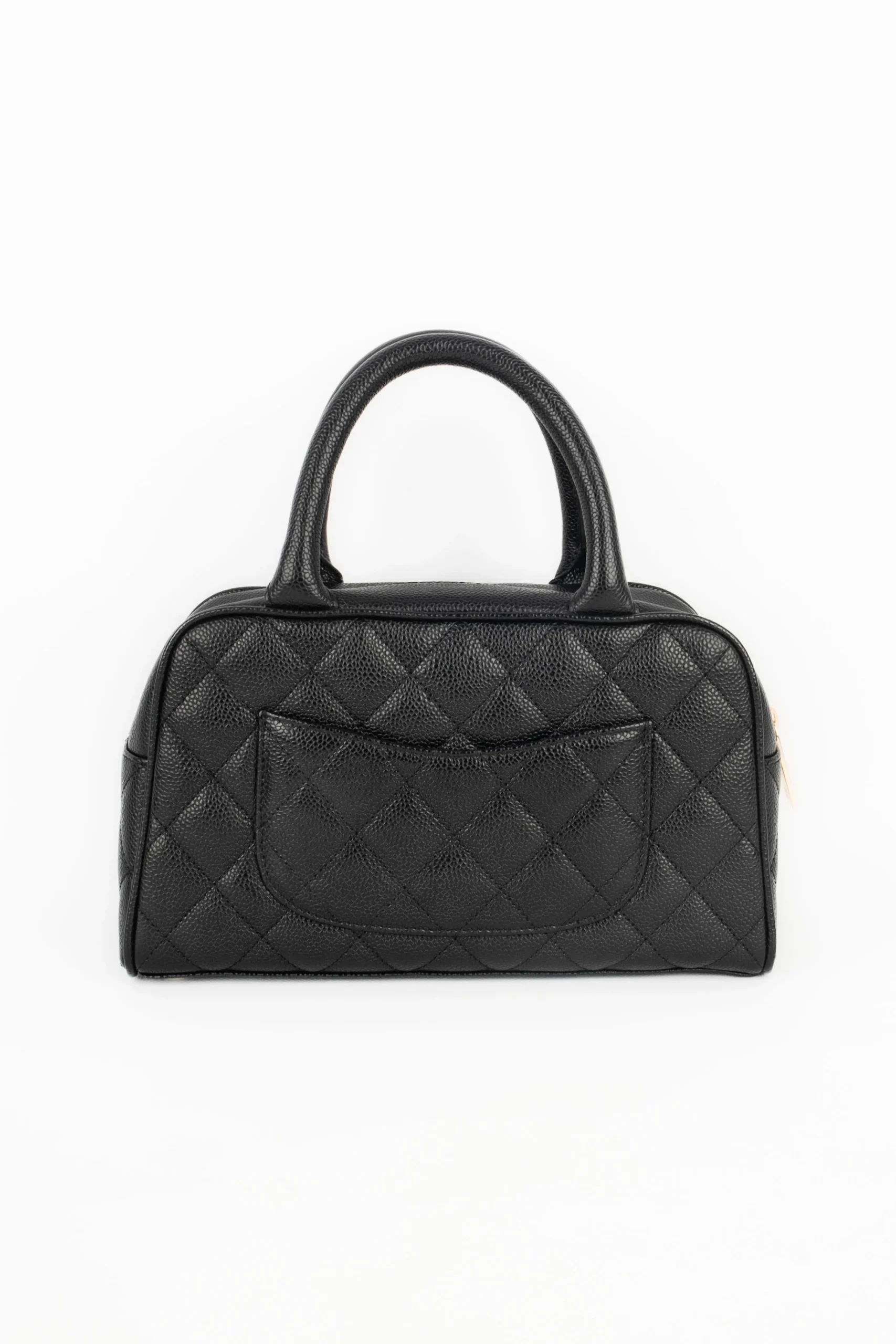 CHANEL -(Made in France) Sac bowling en veau caviar matelassé noir. Attributs en métal doré. Collection 2005/2006. Condition : Très bon état Dimensions : Longueur : 26 cm – Hauteur : 15 cm – Profondeur : 8 cm – Anses : 30 cm