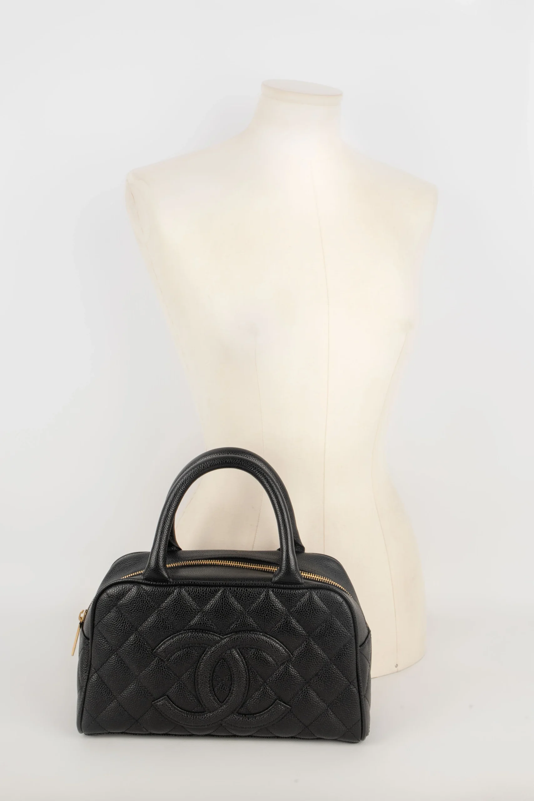 CHANEL -(Made in France) Sac bowling en veau caviar matelassé noir. Attributs en métal doré. Collection 2005/2006.