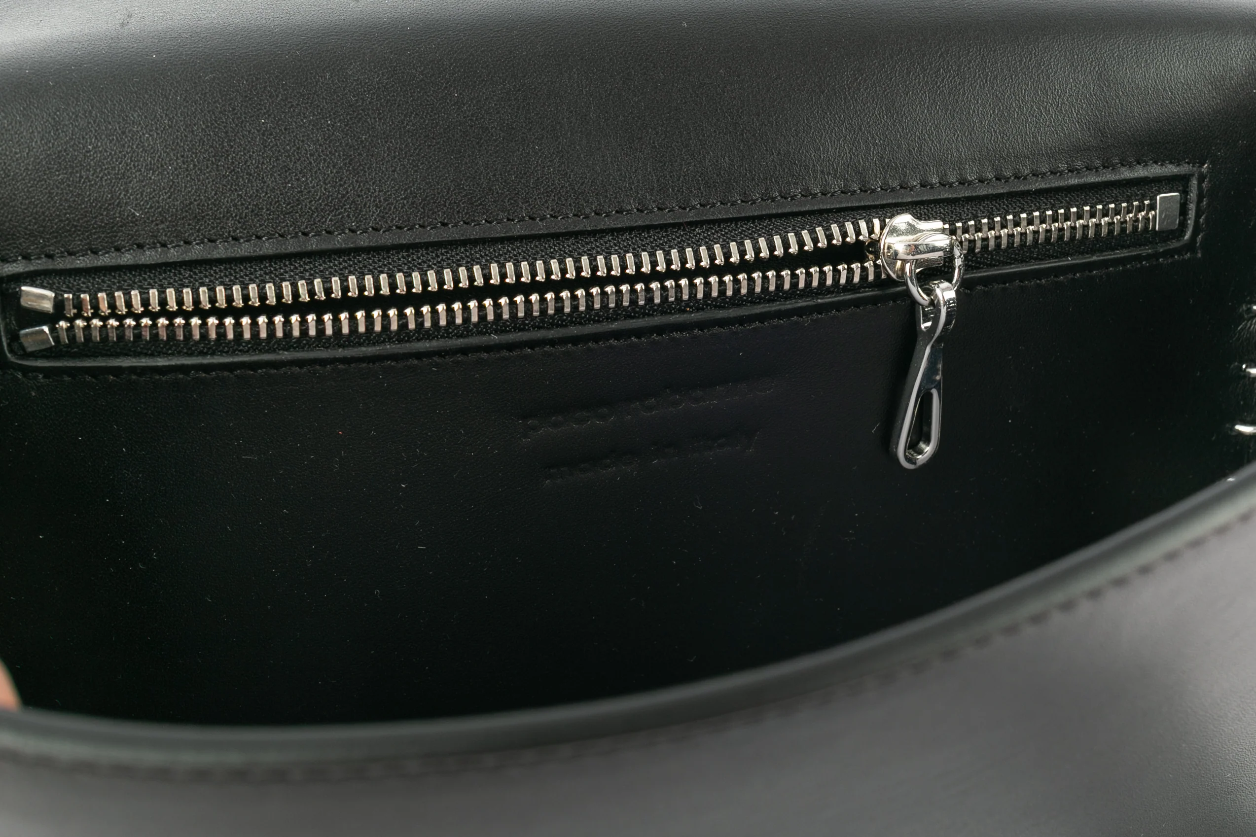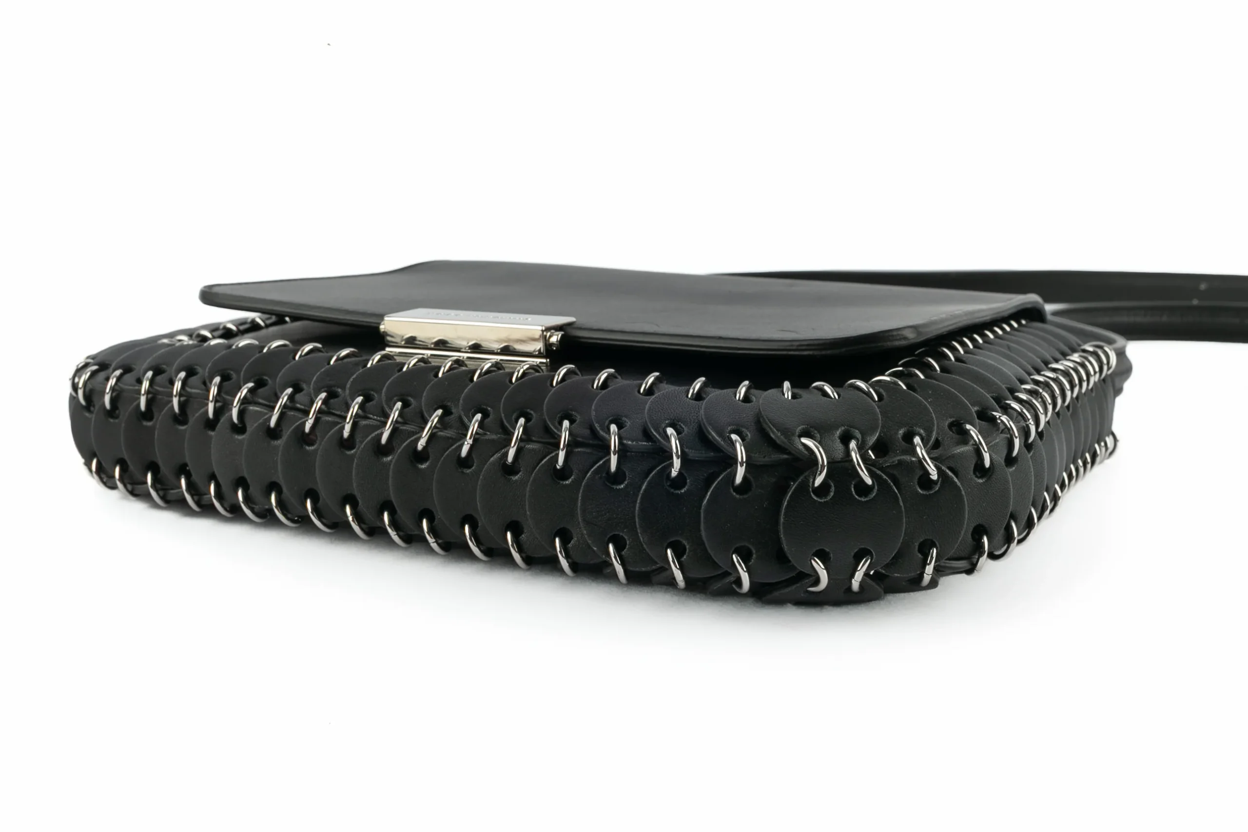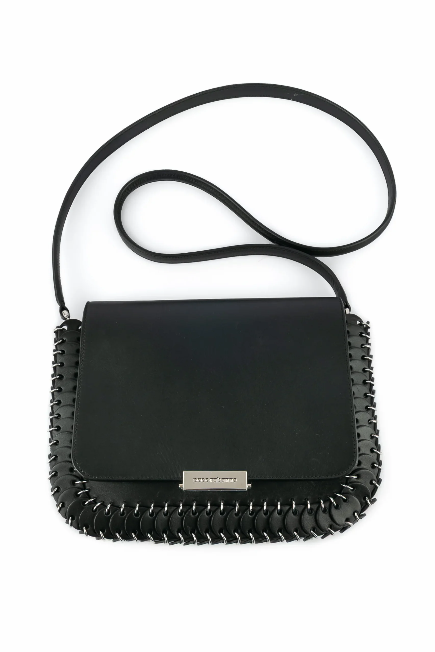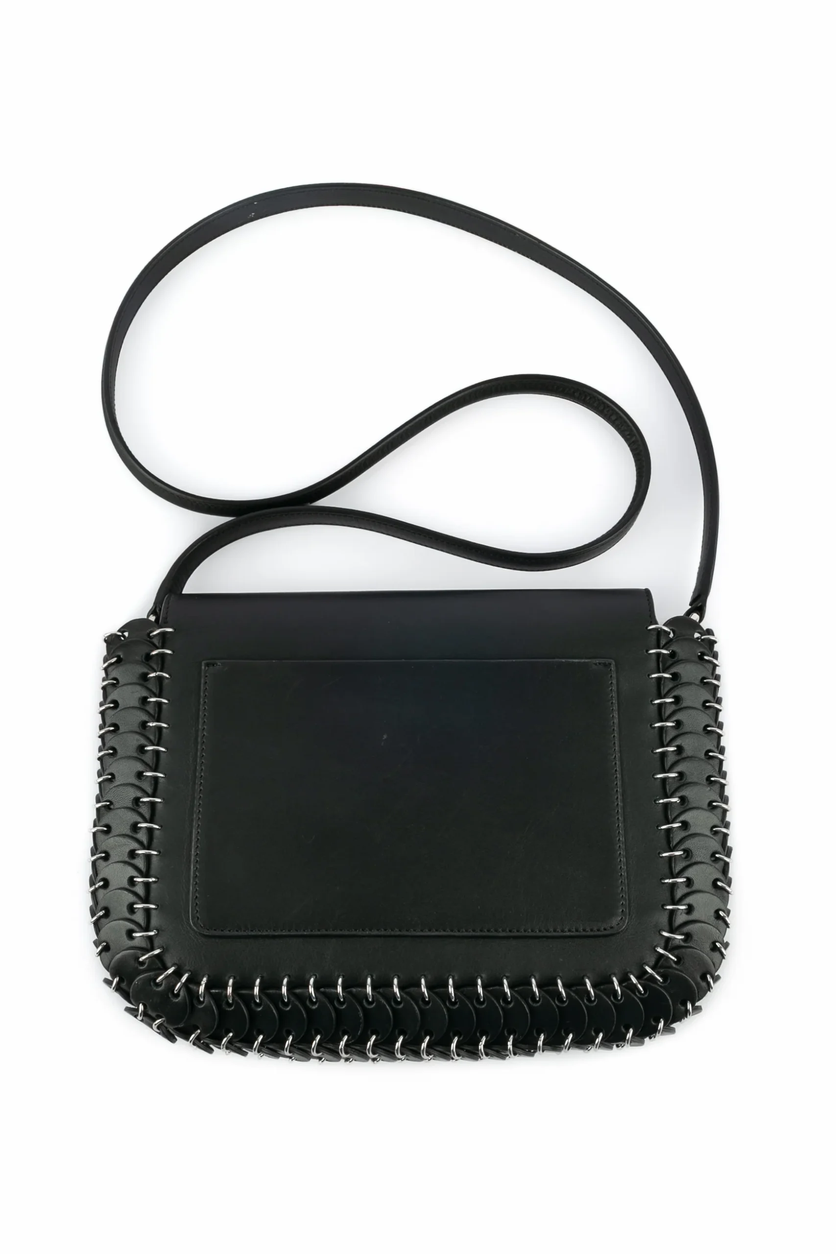 PACO RABANNE -(Made in Italy) Sac à rabat en cuir noir, pastille de cuir, anneaux en métal argenté et anse bandoulière amovible en cuir noir.