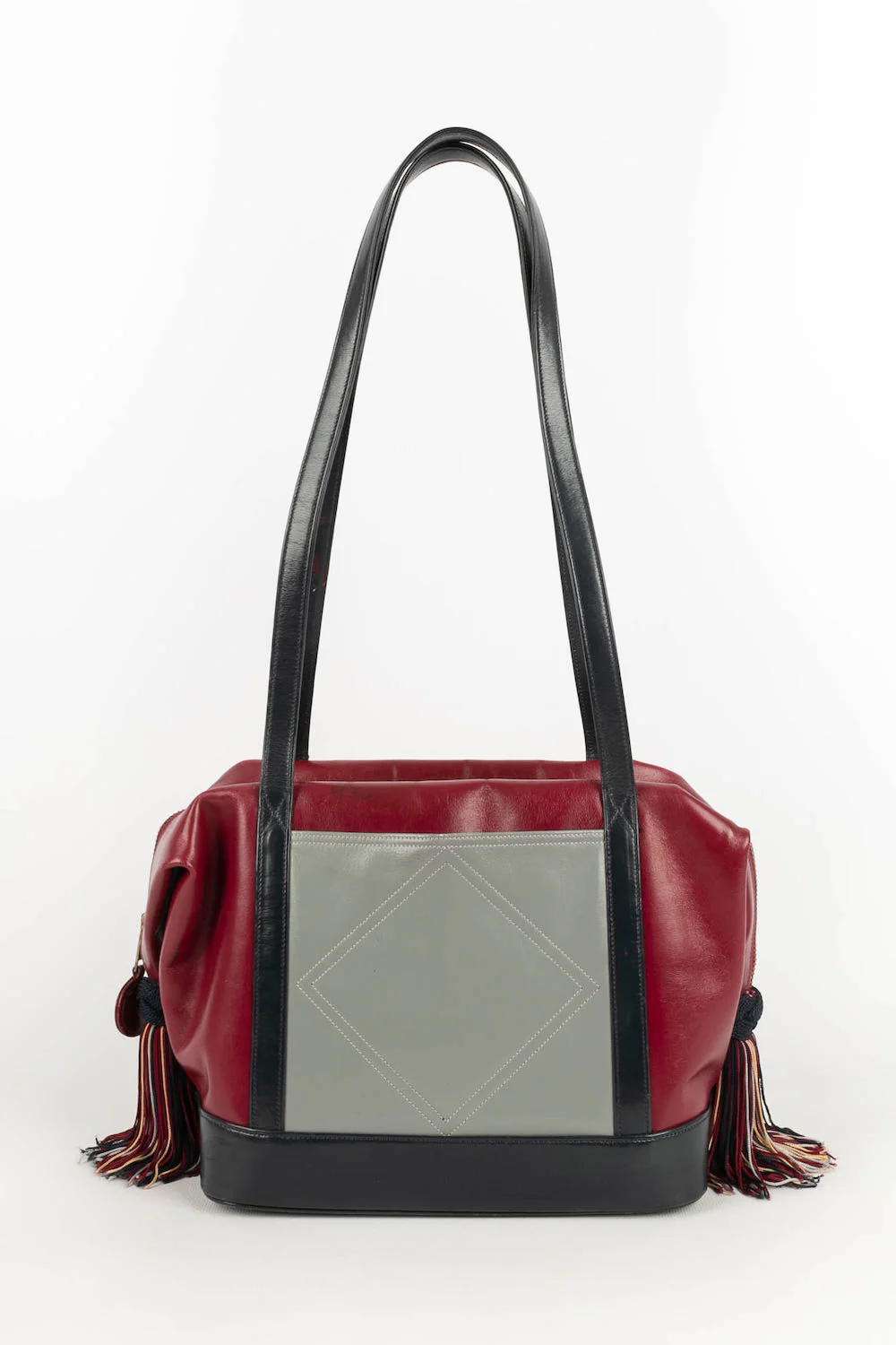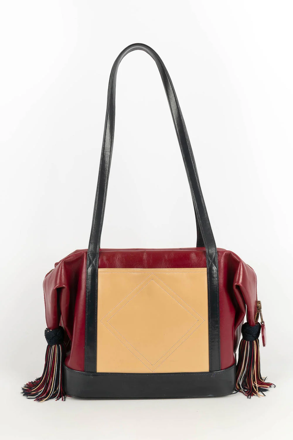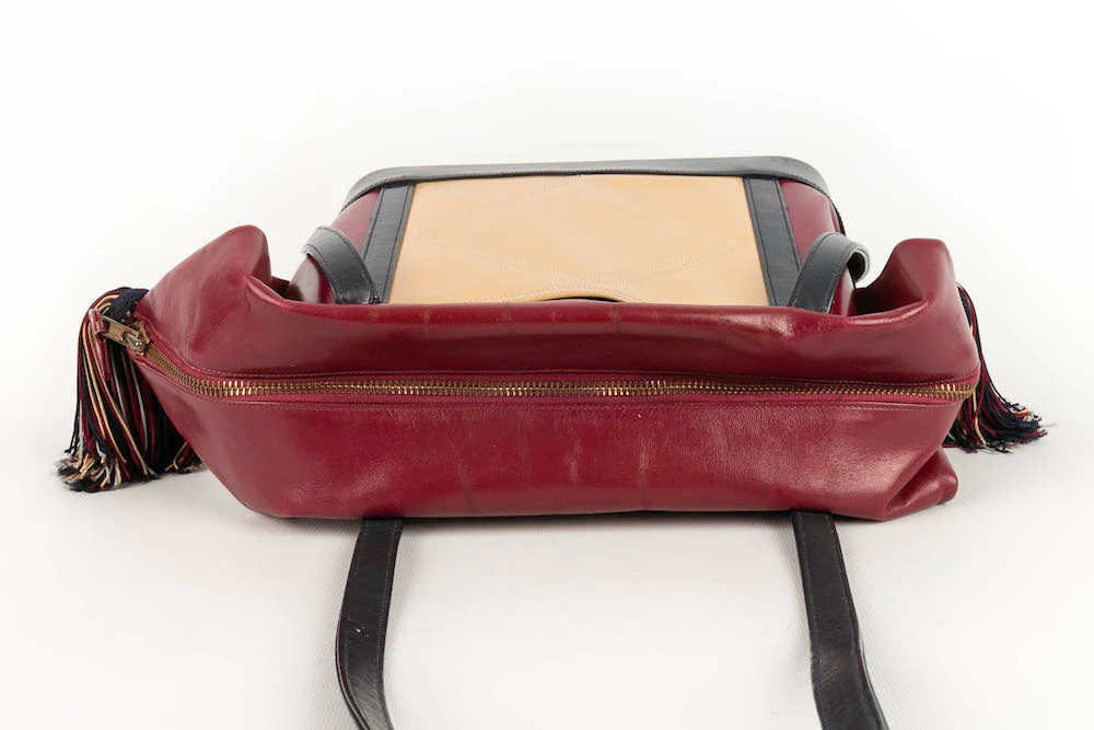 RENAUD PELLEGRINO -(Made in France) Sac en cuir multicolore et attributs en métal doré. Condition : Très bon état Dimensions : Hauteur : 20,5 cm – Longueur : 24 cm – Profondeur : 13 cm – Anse : 70 cm