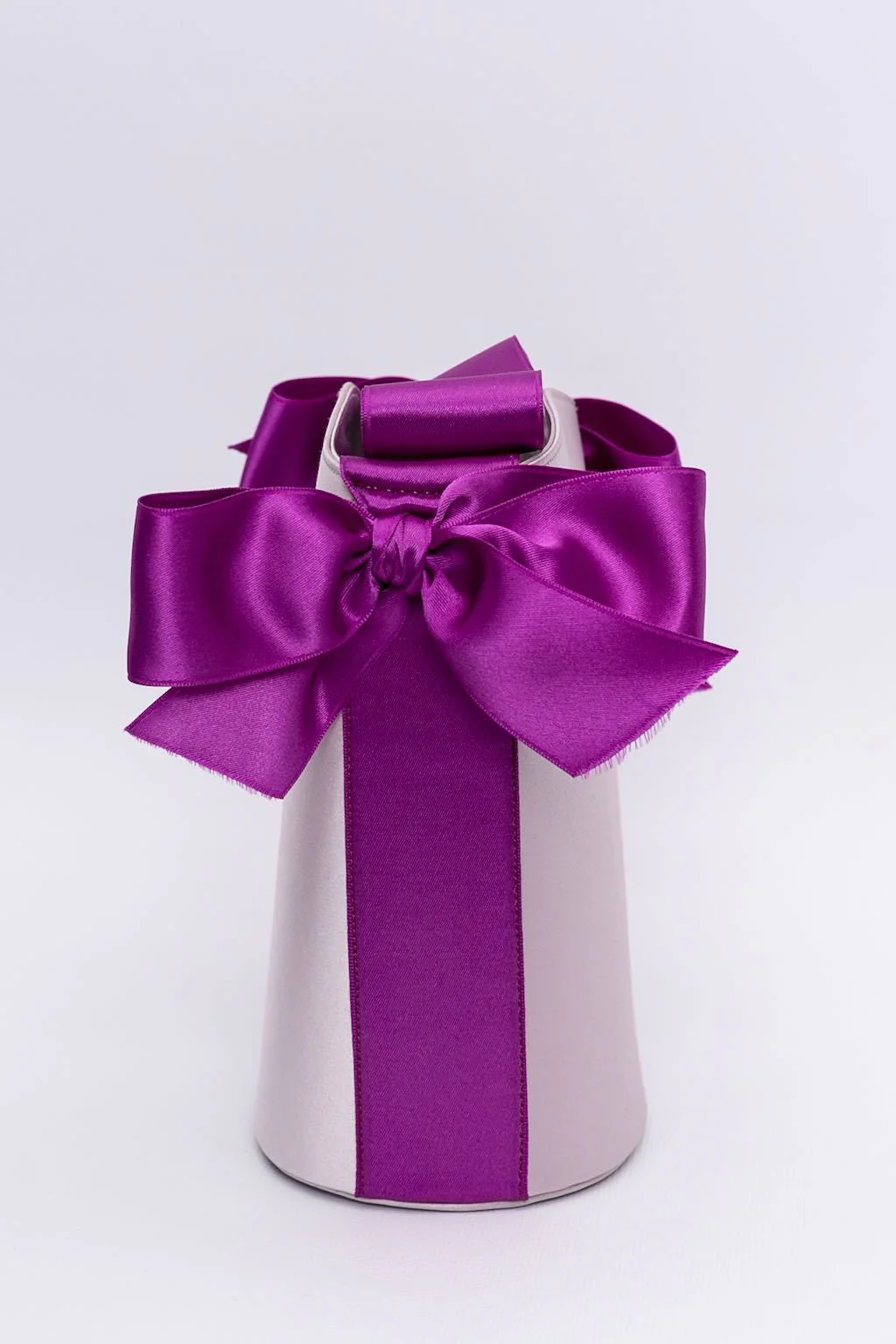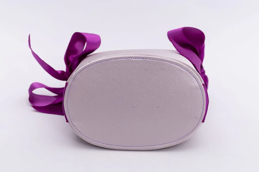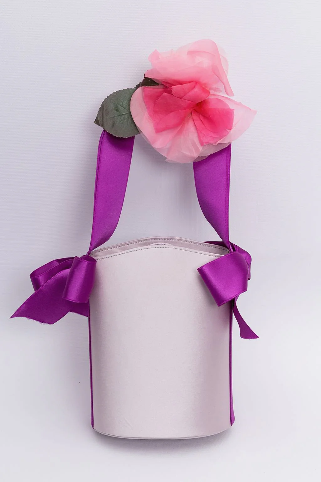 RENAUD PELLEGRINO (Made in France) Sac à main en soie gris perle et ruban violet composé d’une poche plaquée intérieure.