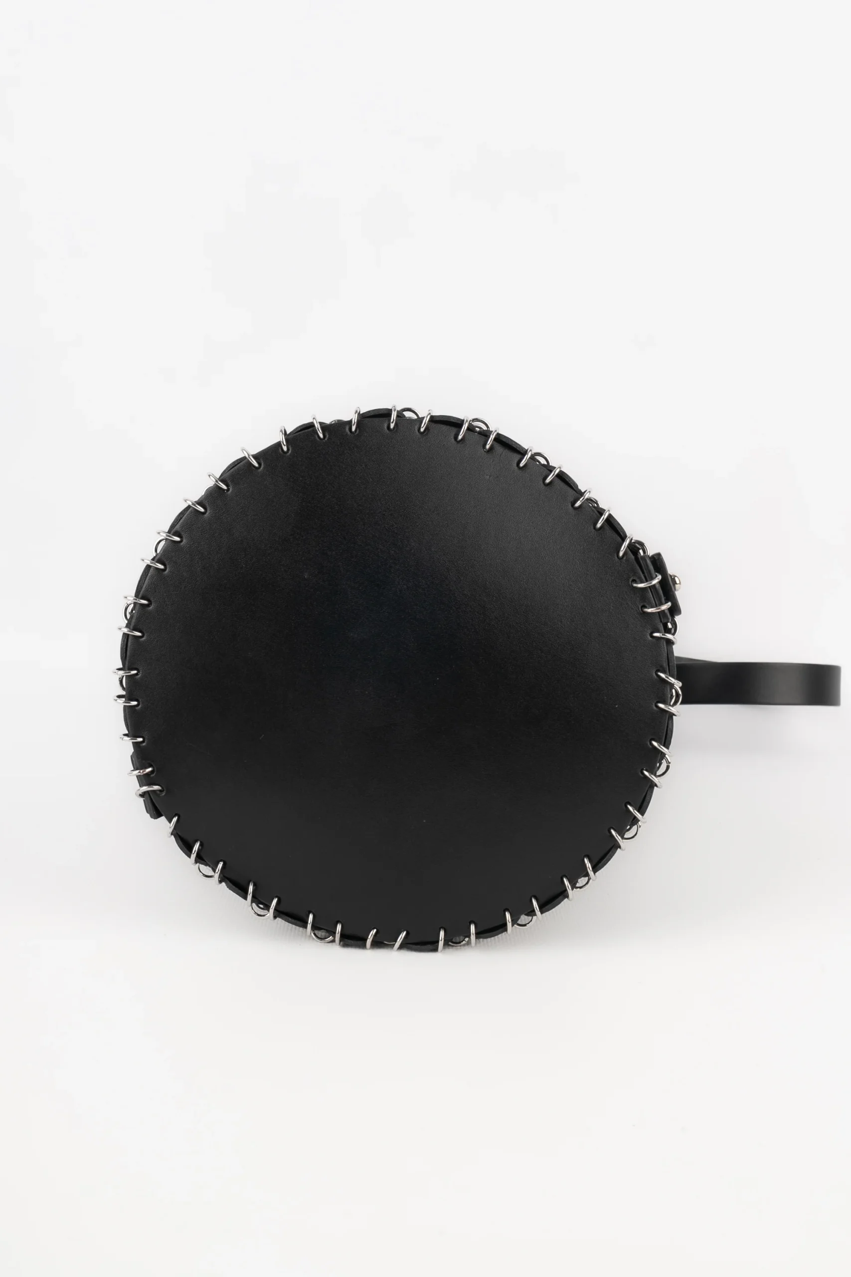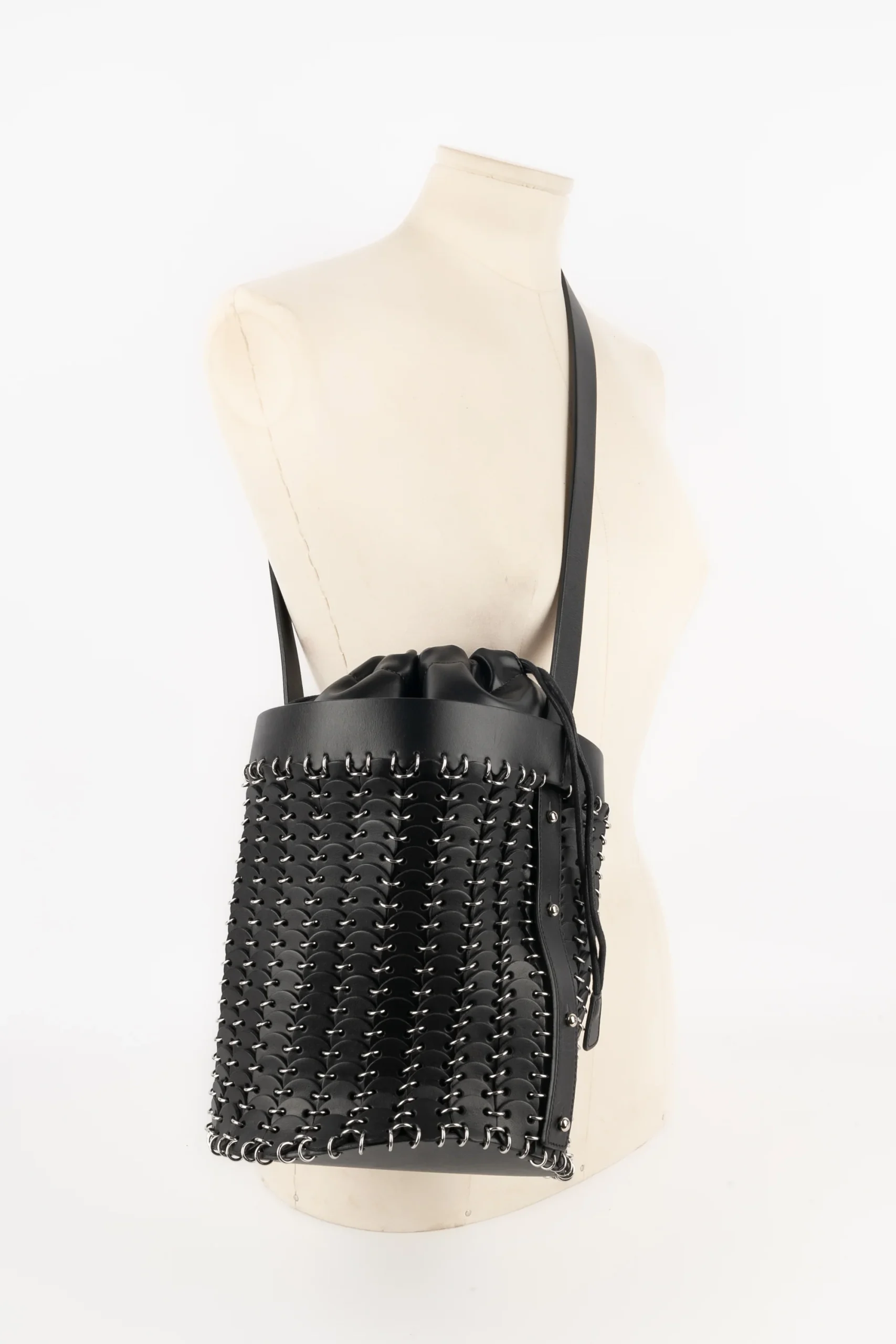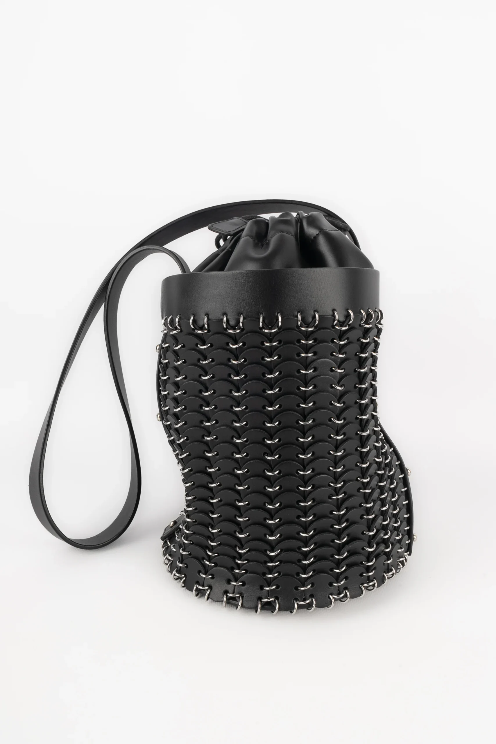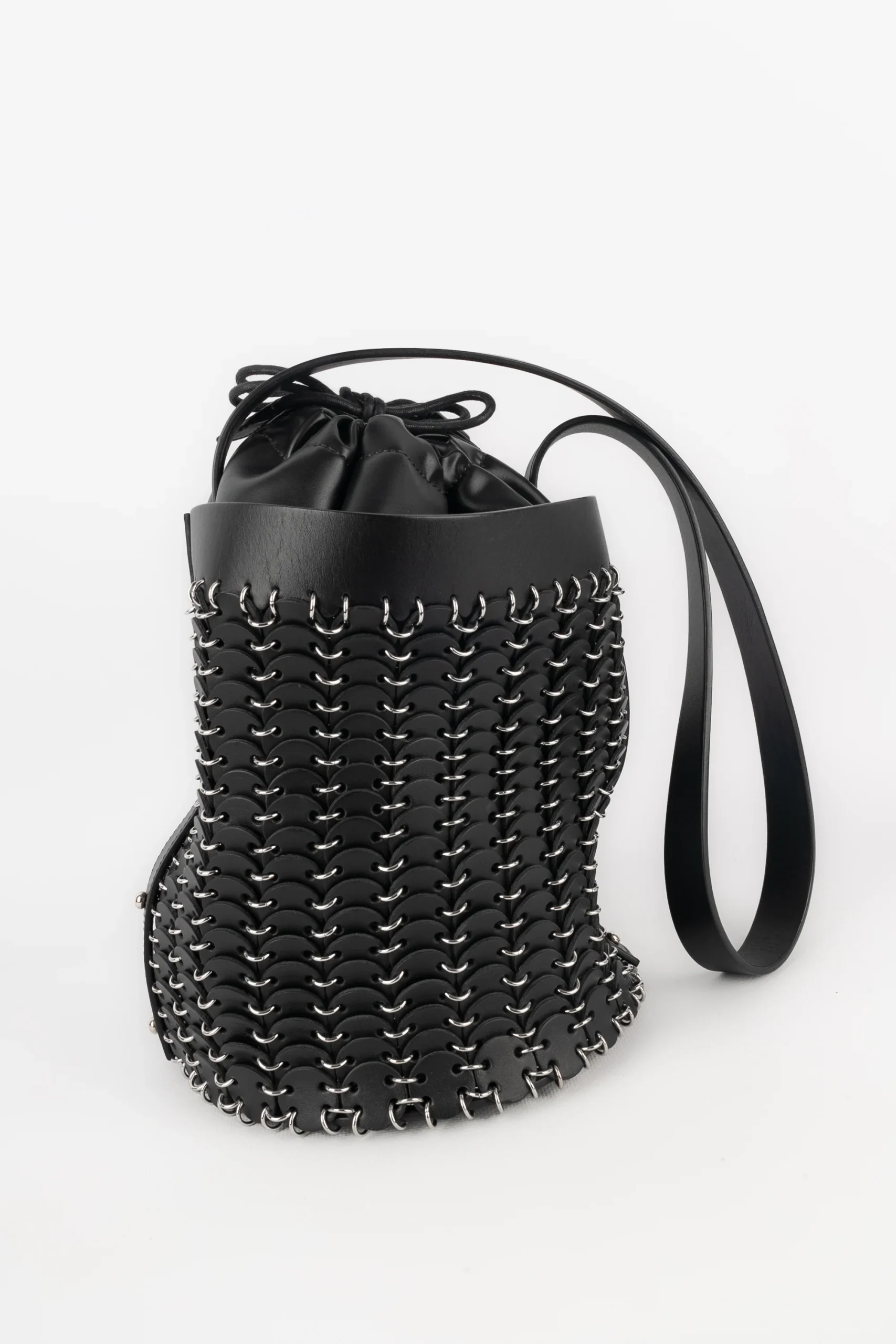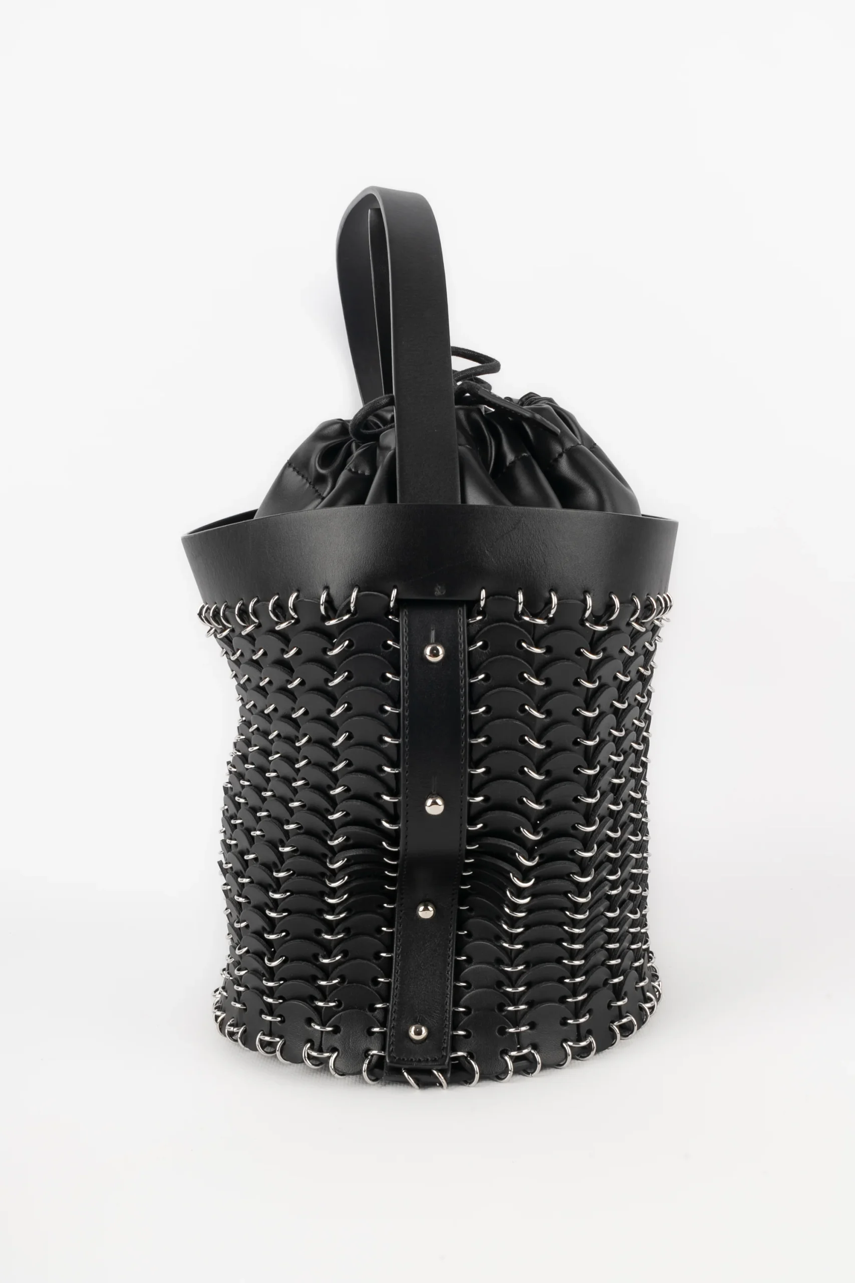 PACO RABANNE -Sac de forme seau en cuir noir et métal argenté. Collection Resort 2017.
