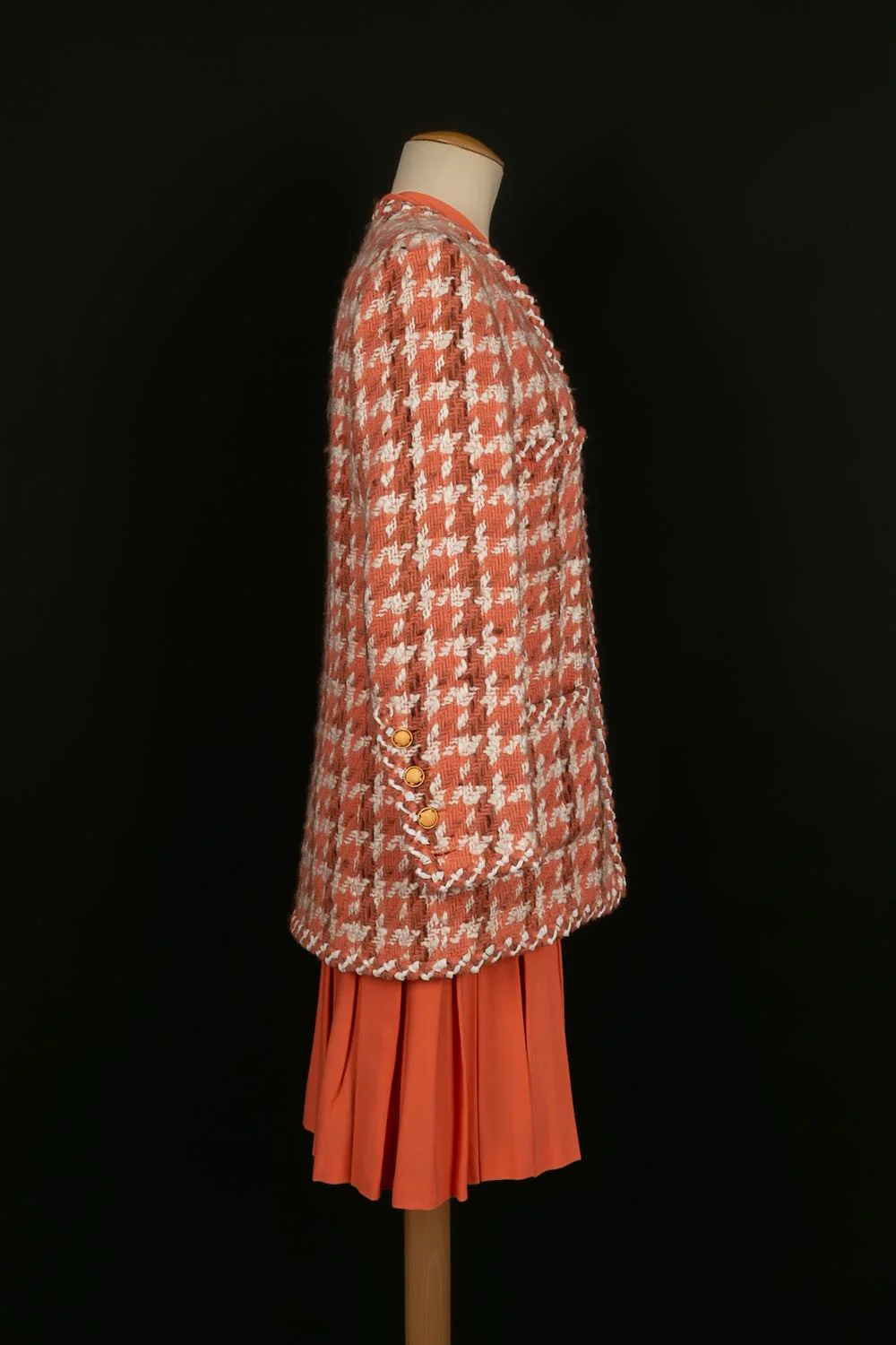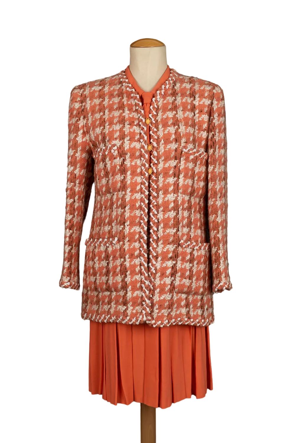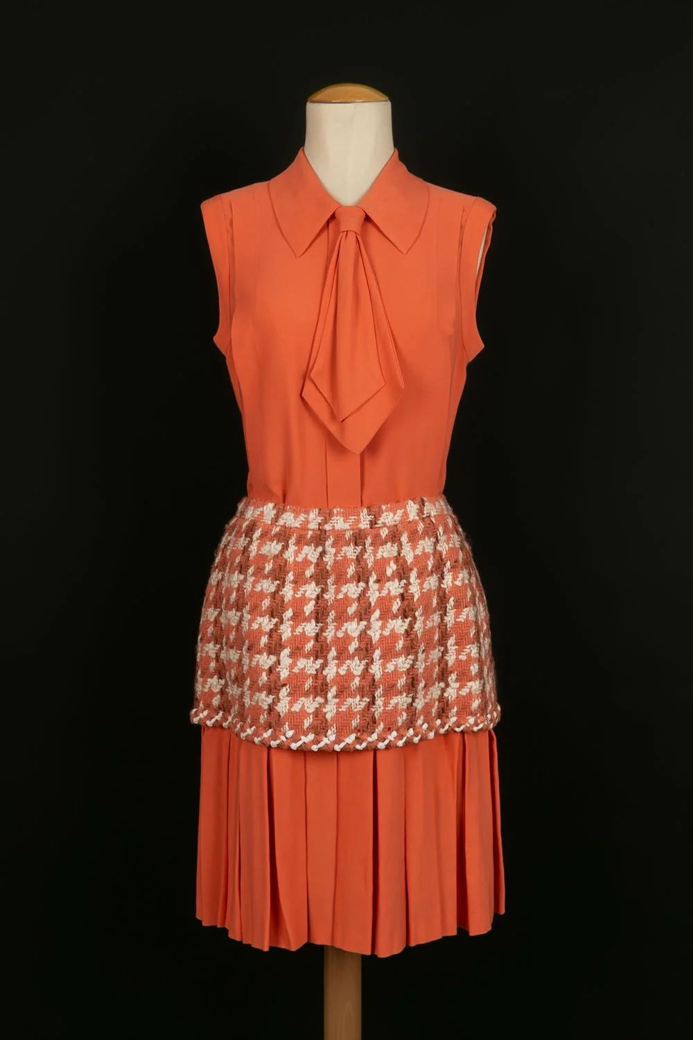 CHANEL -(Made in France) Ensemble trois pièces Haute Couture composé d’une veste et d’une jupette en tweed de laine et d’un top et d’une jupe plissée en soie orange et tweed. Aucune étiquette de taille, il convient à un 40FR.