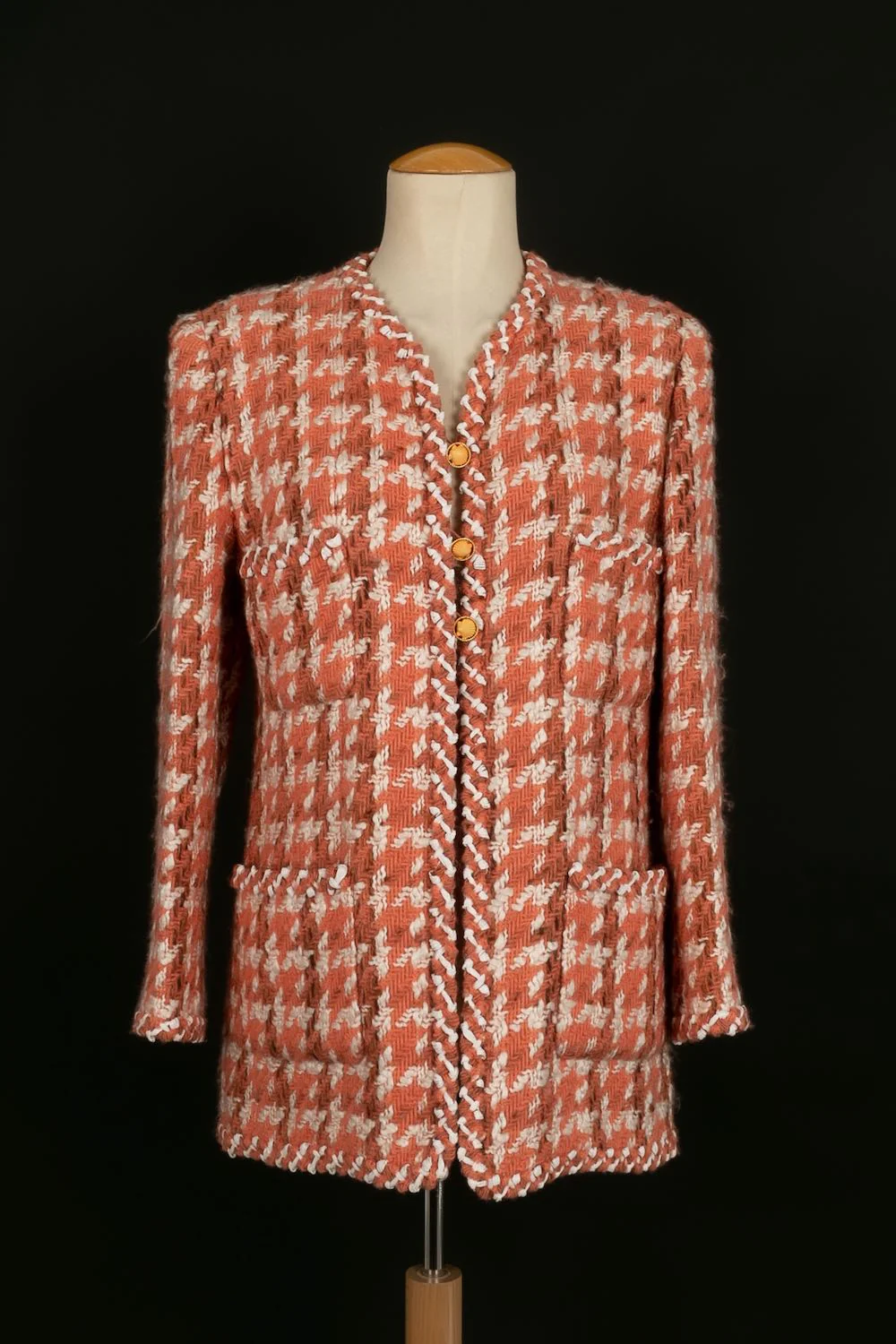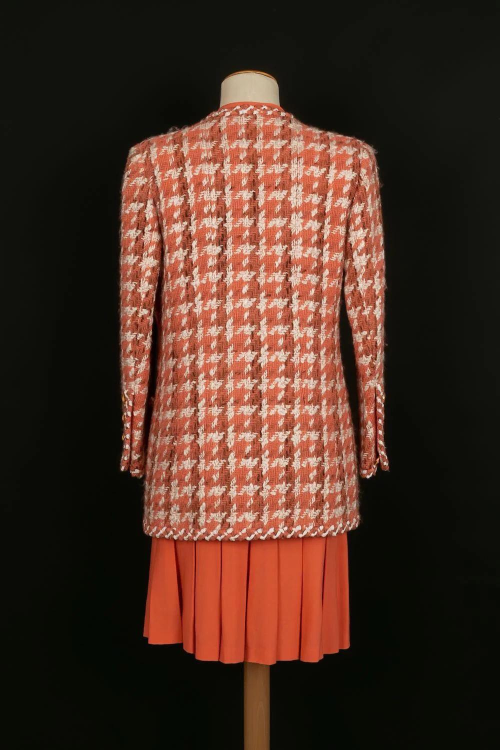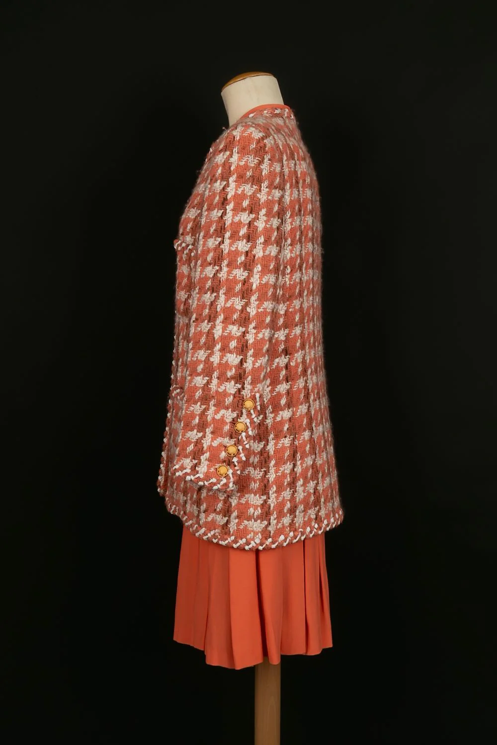 CHANEL -(Made in France) Ensemble trois pièces Haute Couture composé d’une veste et d’une jupette en tweed de laine et d’un top et d’une jupe plissée en soie orange et tweed. Aucune étiquette de taille, il convient à un 40FR.