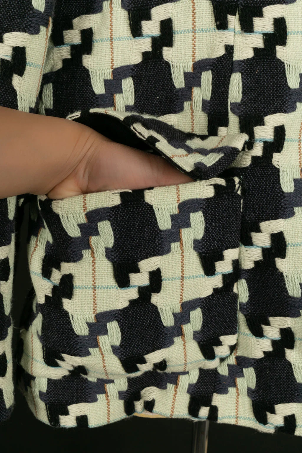 Veste : Largeur d’épaules : 48 cm – Poitrine : 52cm – Taille : 48 cm – Longueur manches : 60 cm – Longueur : 72 cm // Jupe : Taille : 46 cm – Hanches : 52 cm – Longueur : 60 cm