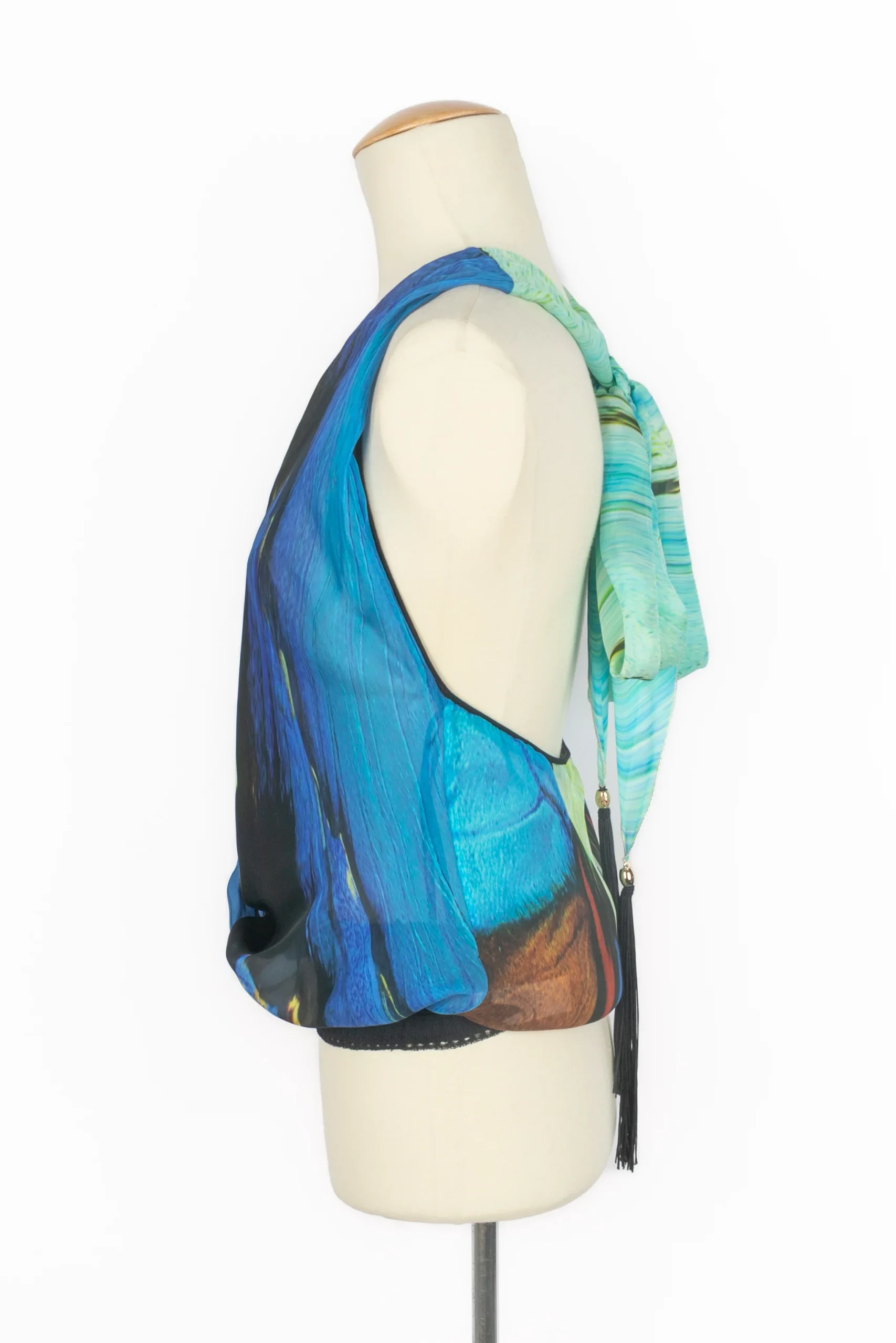 ROBERTO CAVALLI -(Made in Italy) Top dos nu en en soie à motif dans les tons de bleu et de vert. Taille indiquée 42IT, il correspond à un 38FR. Condition : Très bon état Dimensions : Poitrine : 35 cm – Longueur : 45 cm