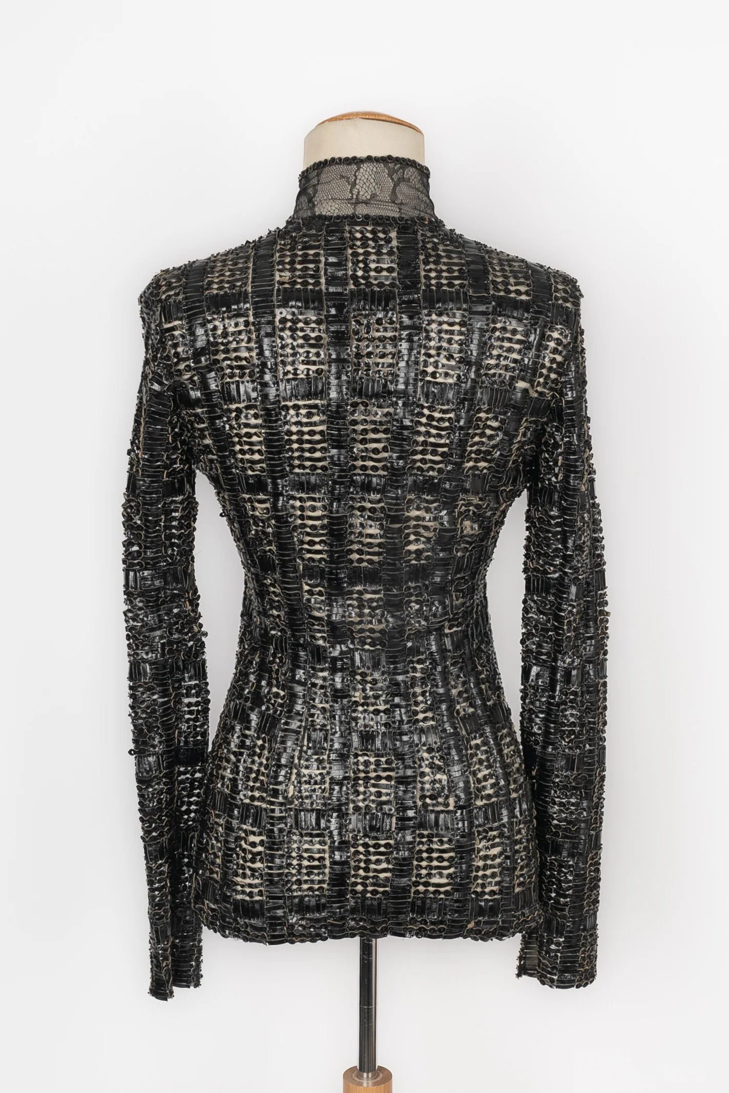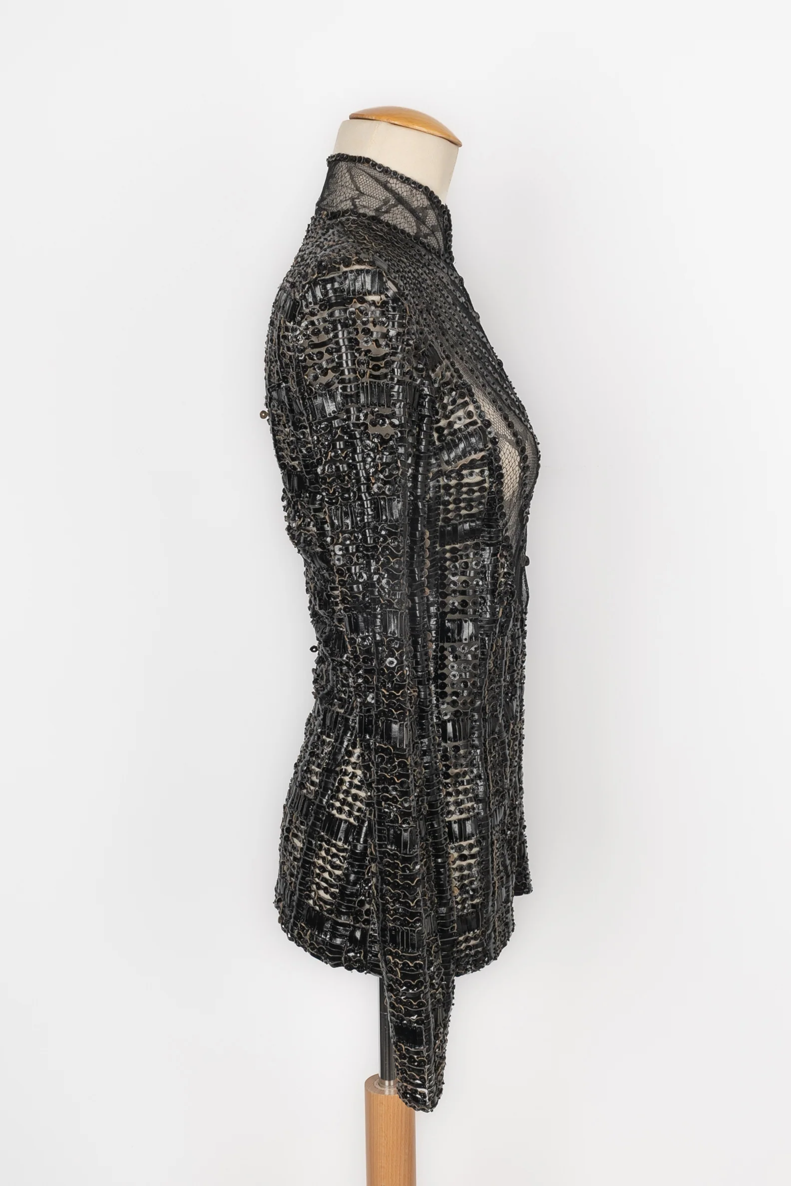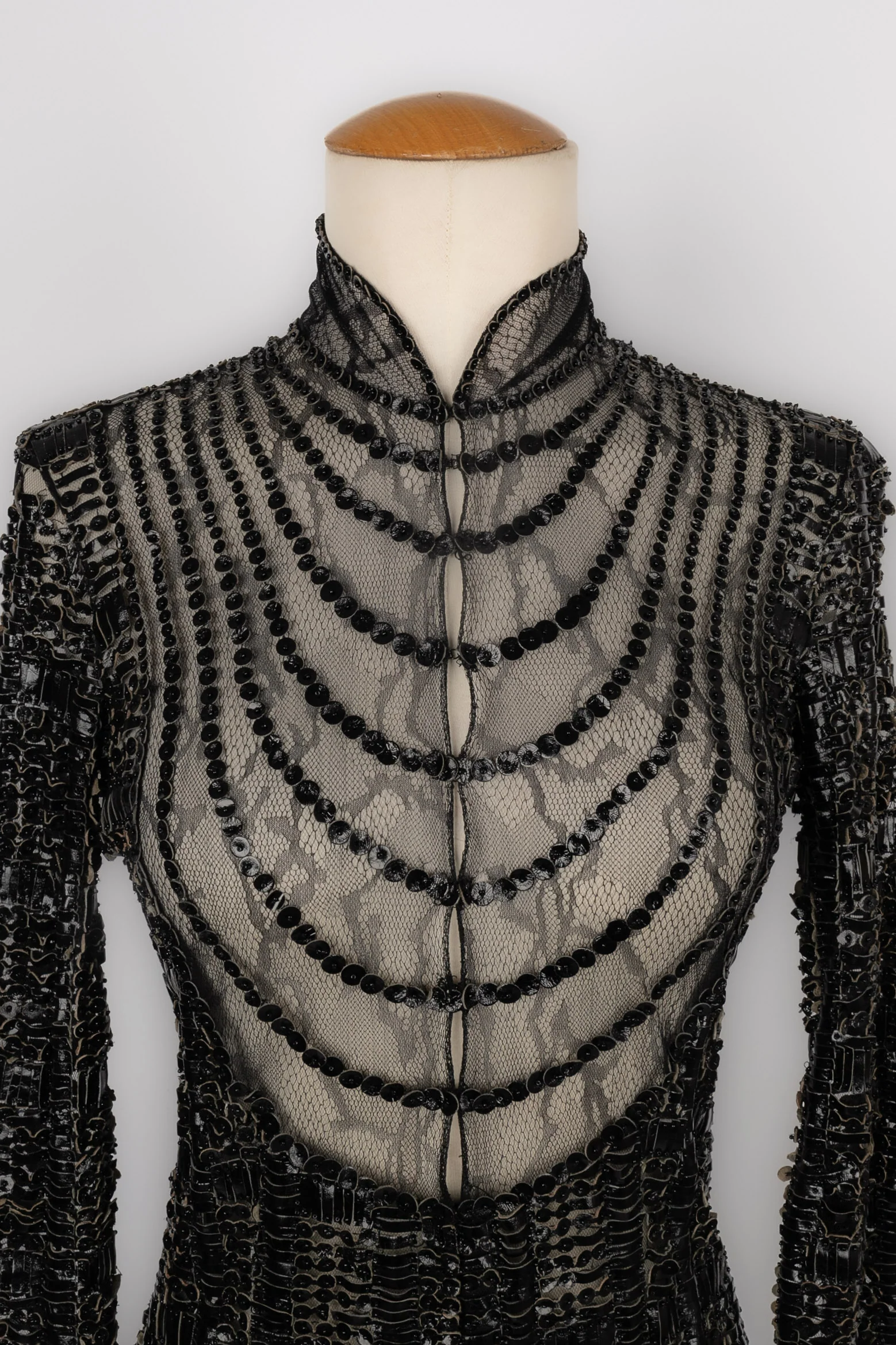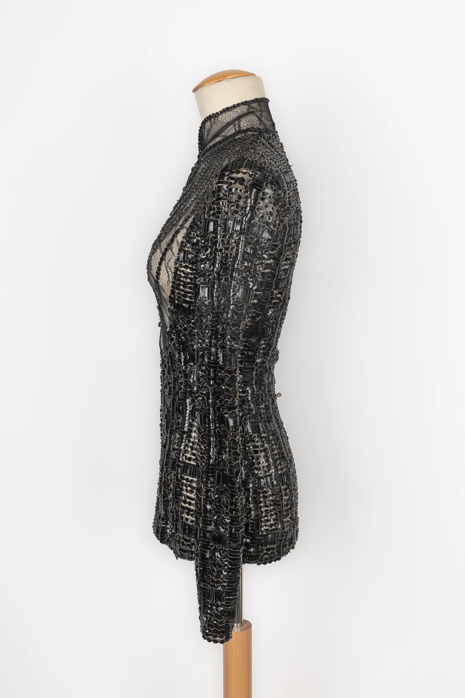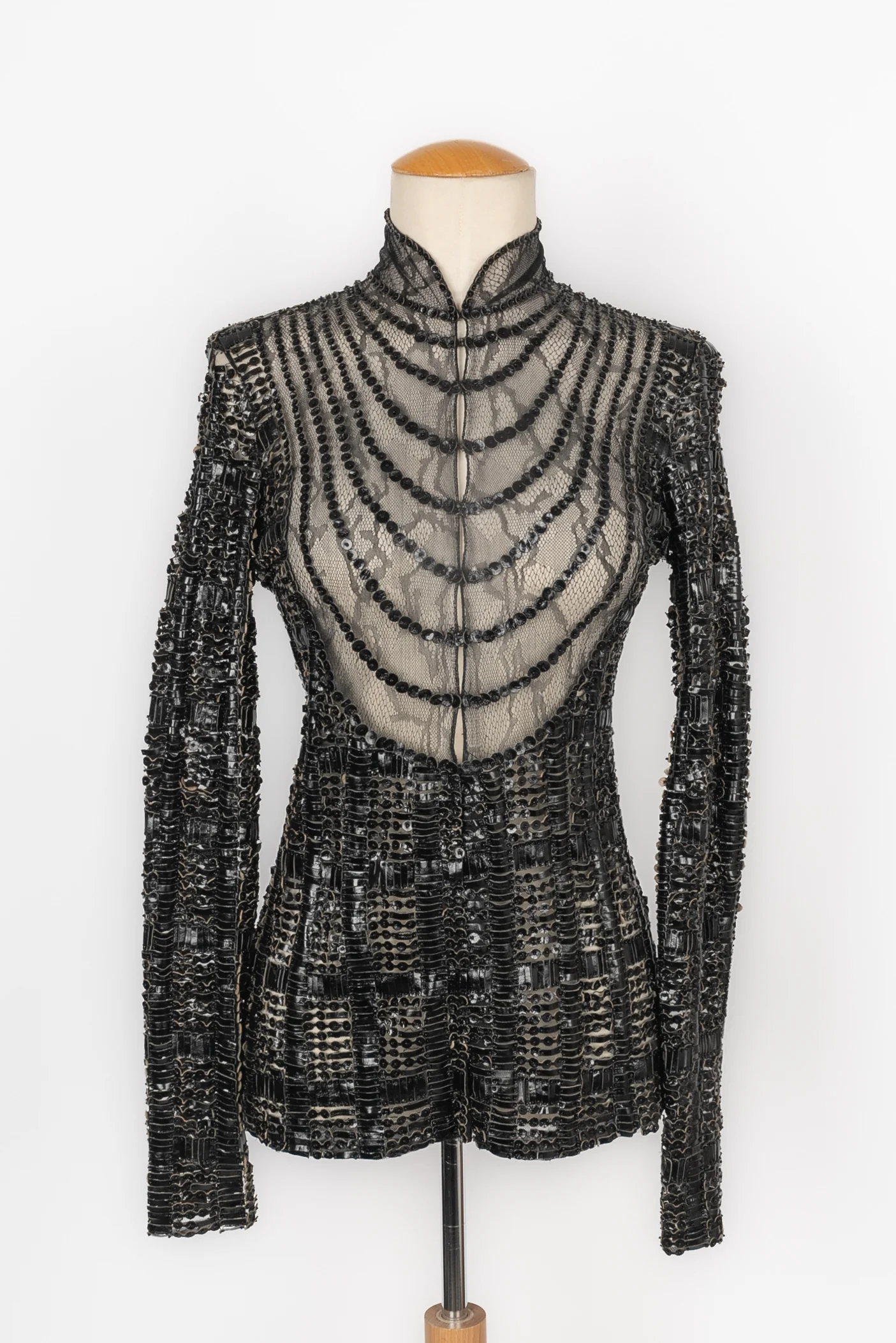 TORRENTE -Top à manches longues en dentelle noire entièrement brodé de motif en cuir noir et perles noires. Pas de taille indiquée, il convient à un 34FR/36FR. Collection Haute Couture Automne-Hiver 2002-2003. Etiquette de marques absente.