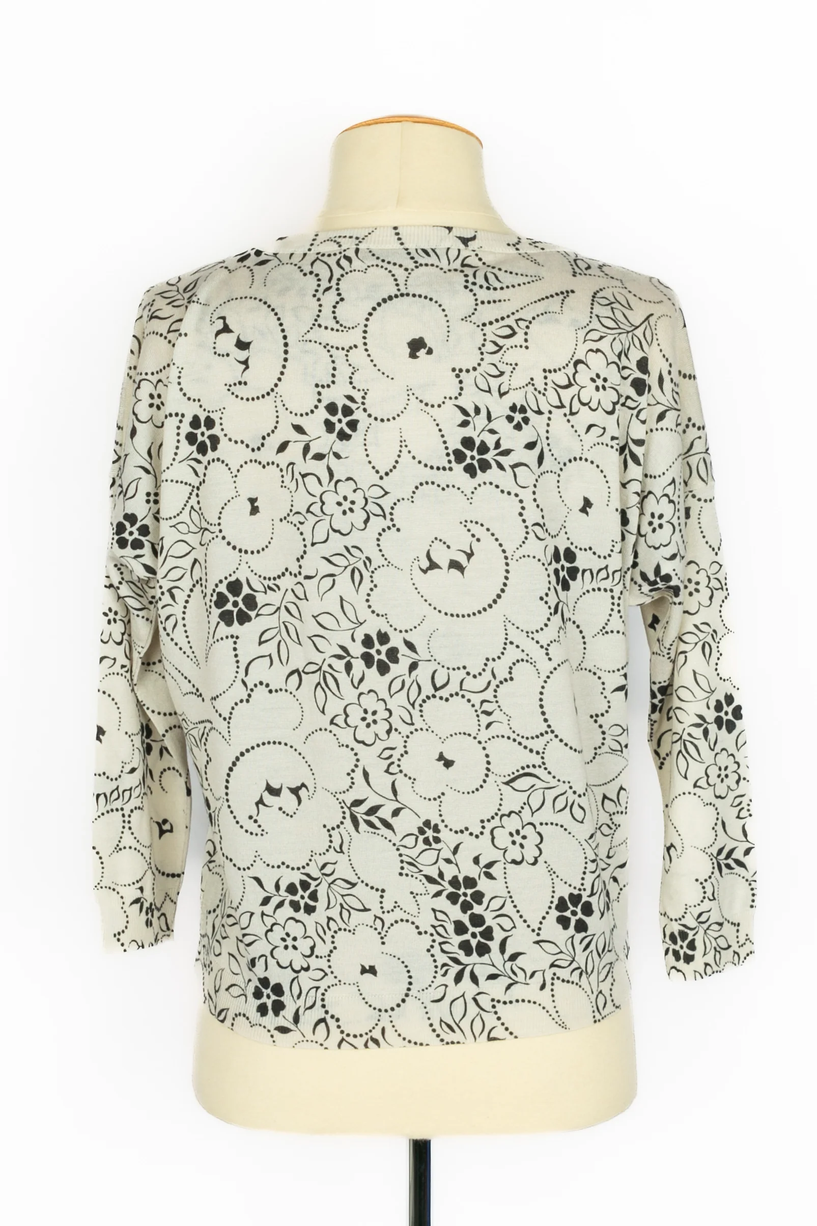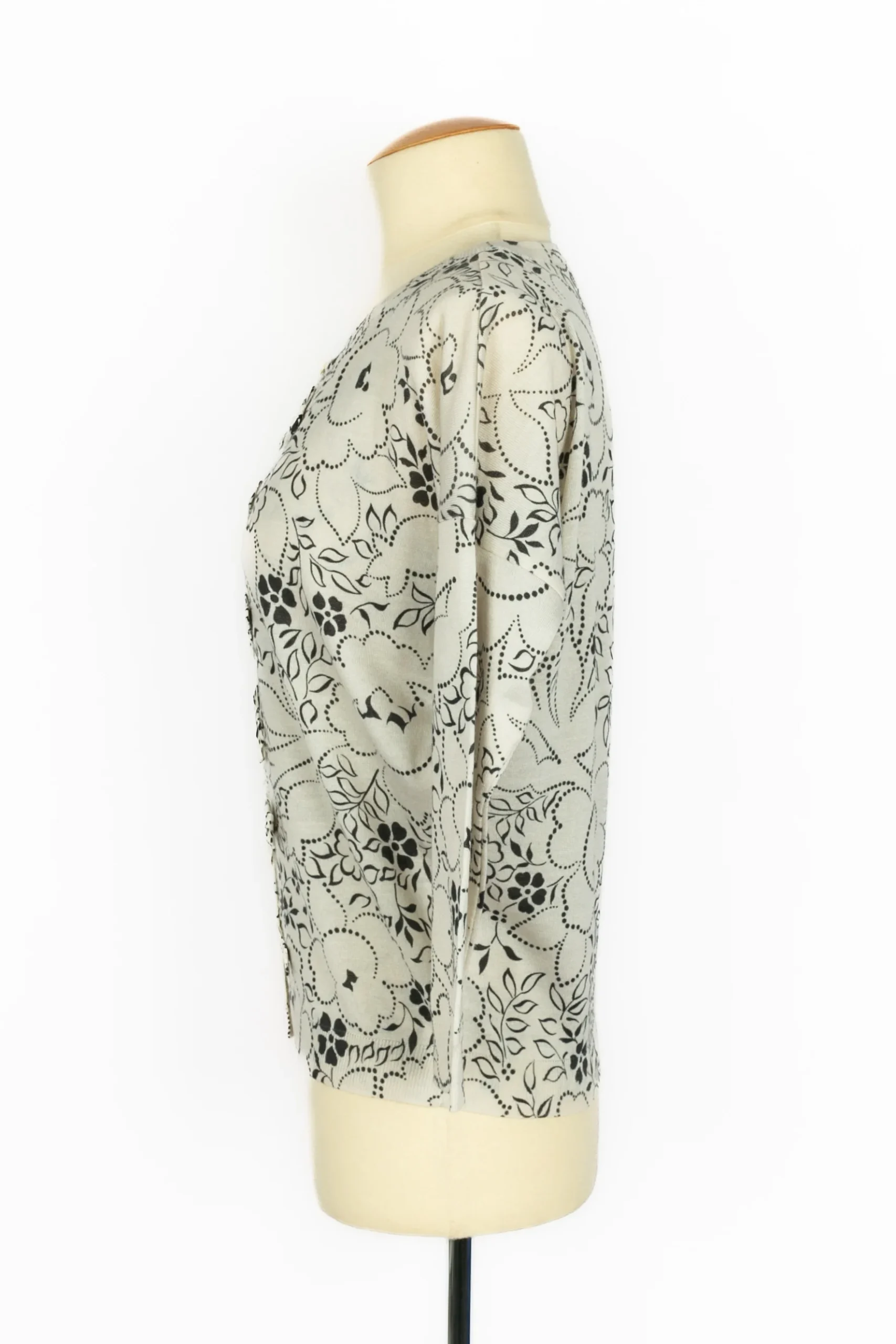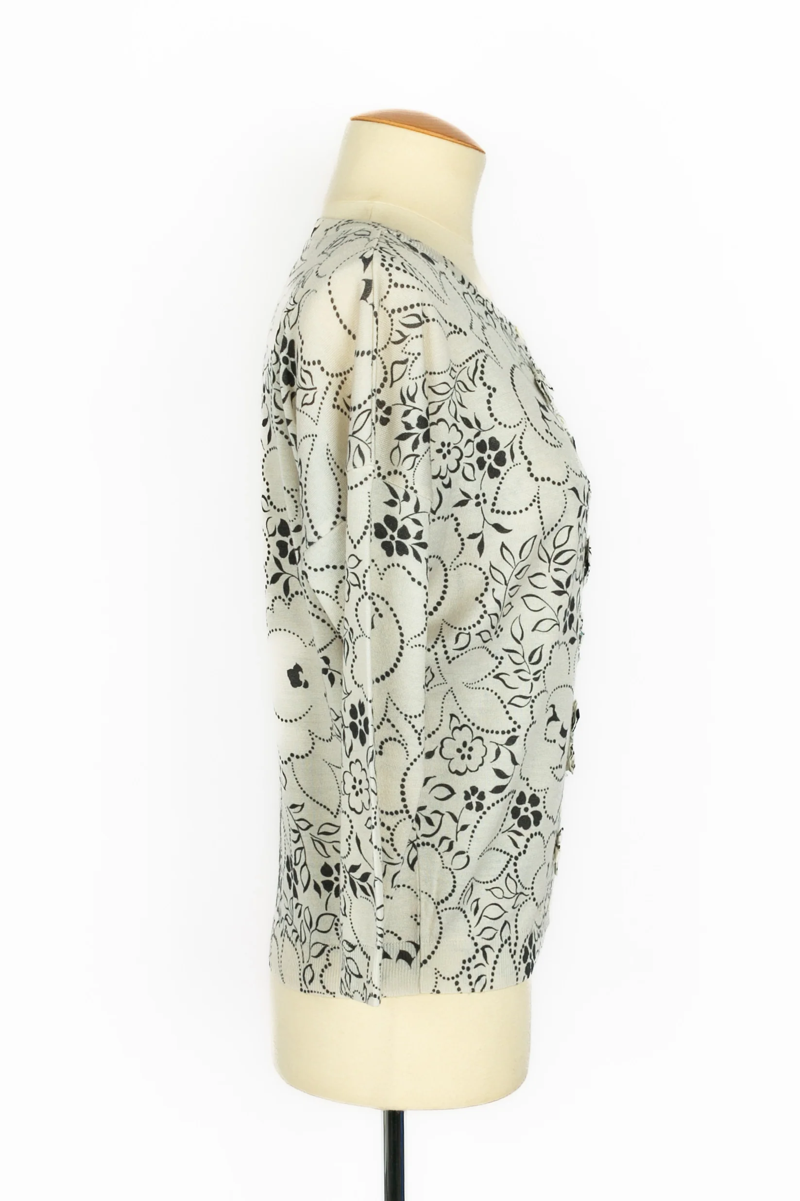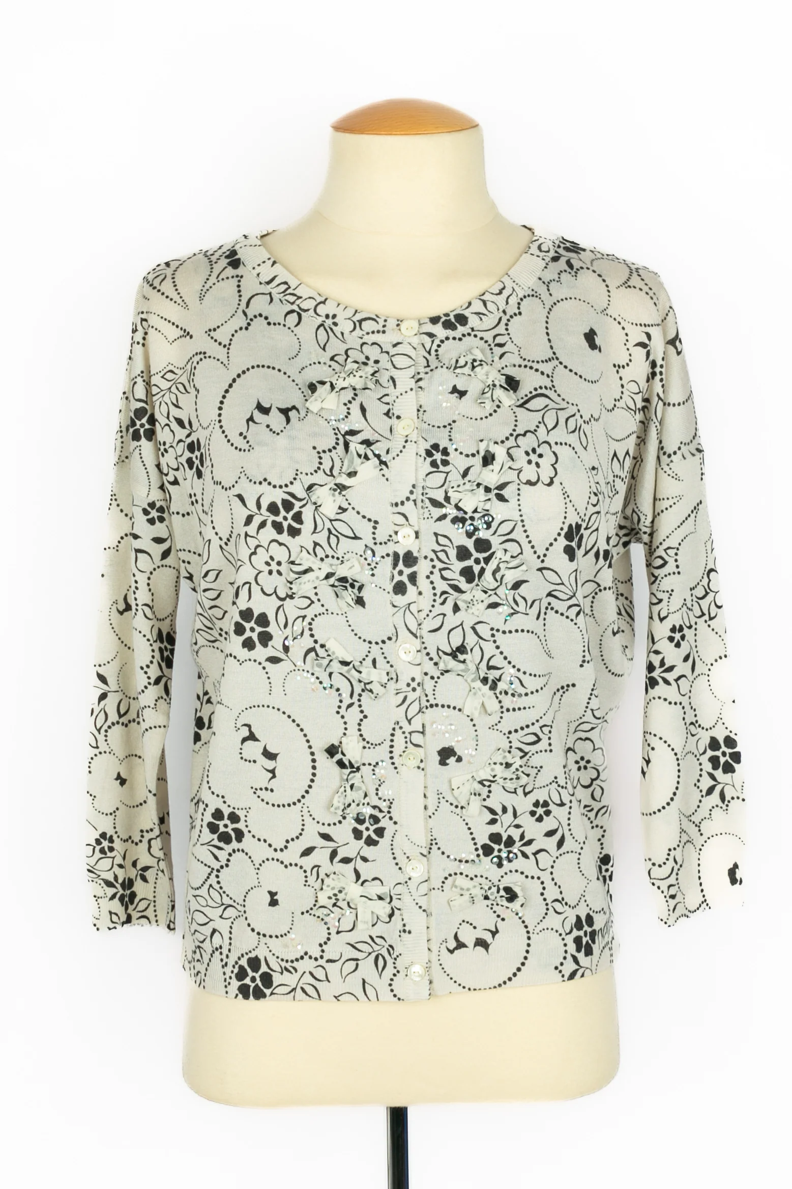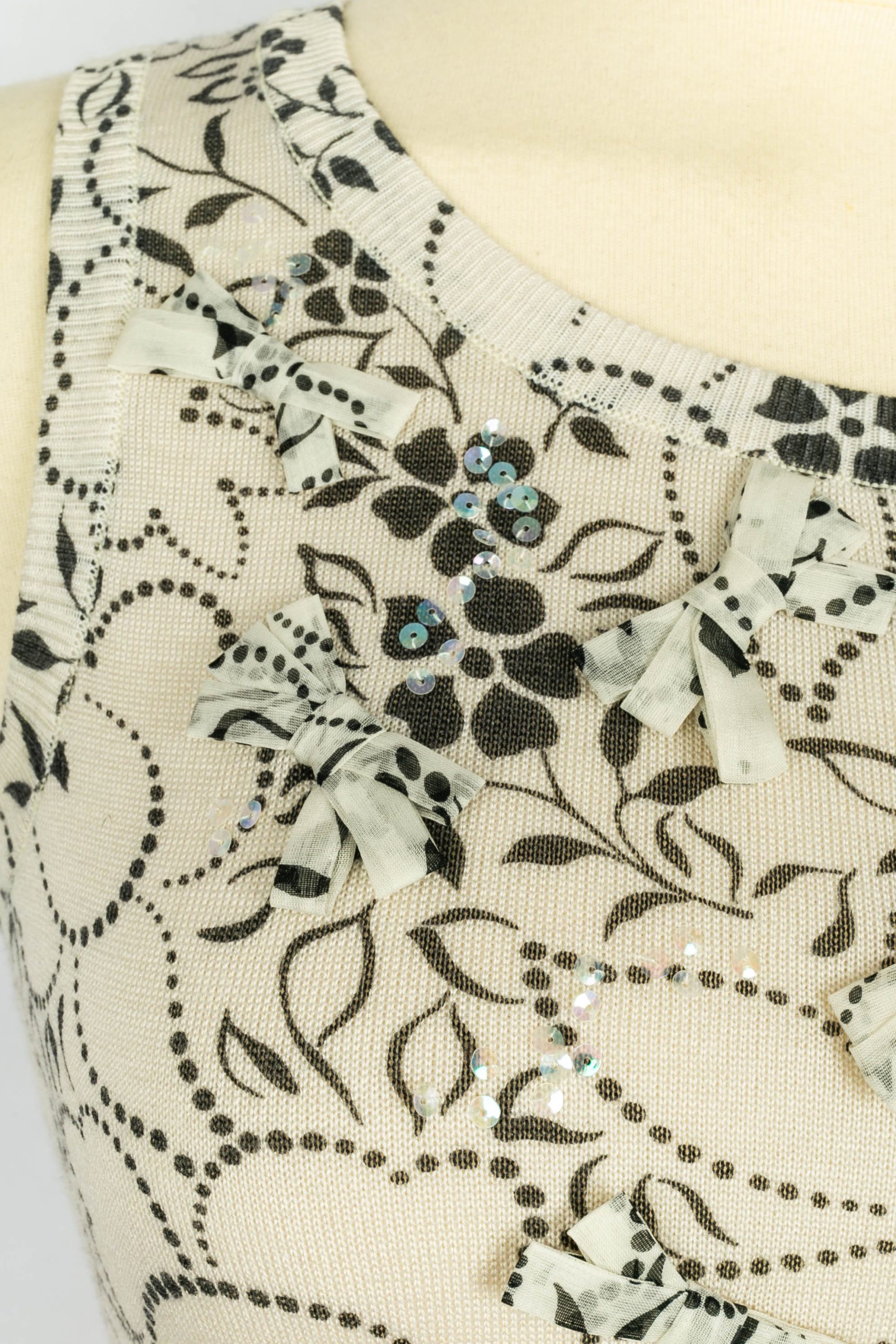 DIOR – (Made in Italy) Twin set en laine et soie blanc et noir cousu de paillettes et de noeuds. Taille 34FR.