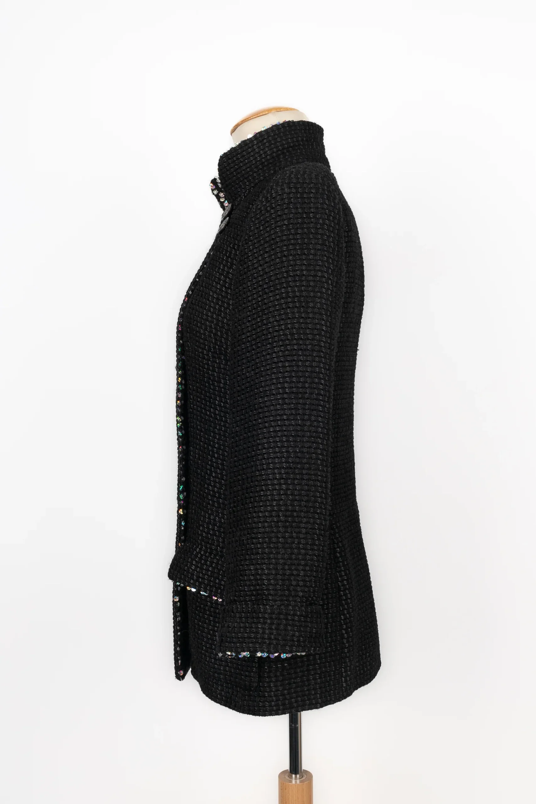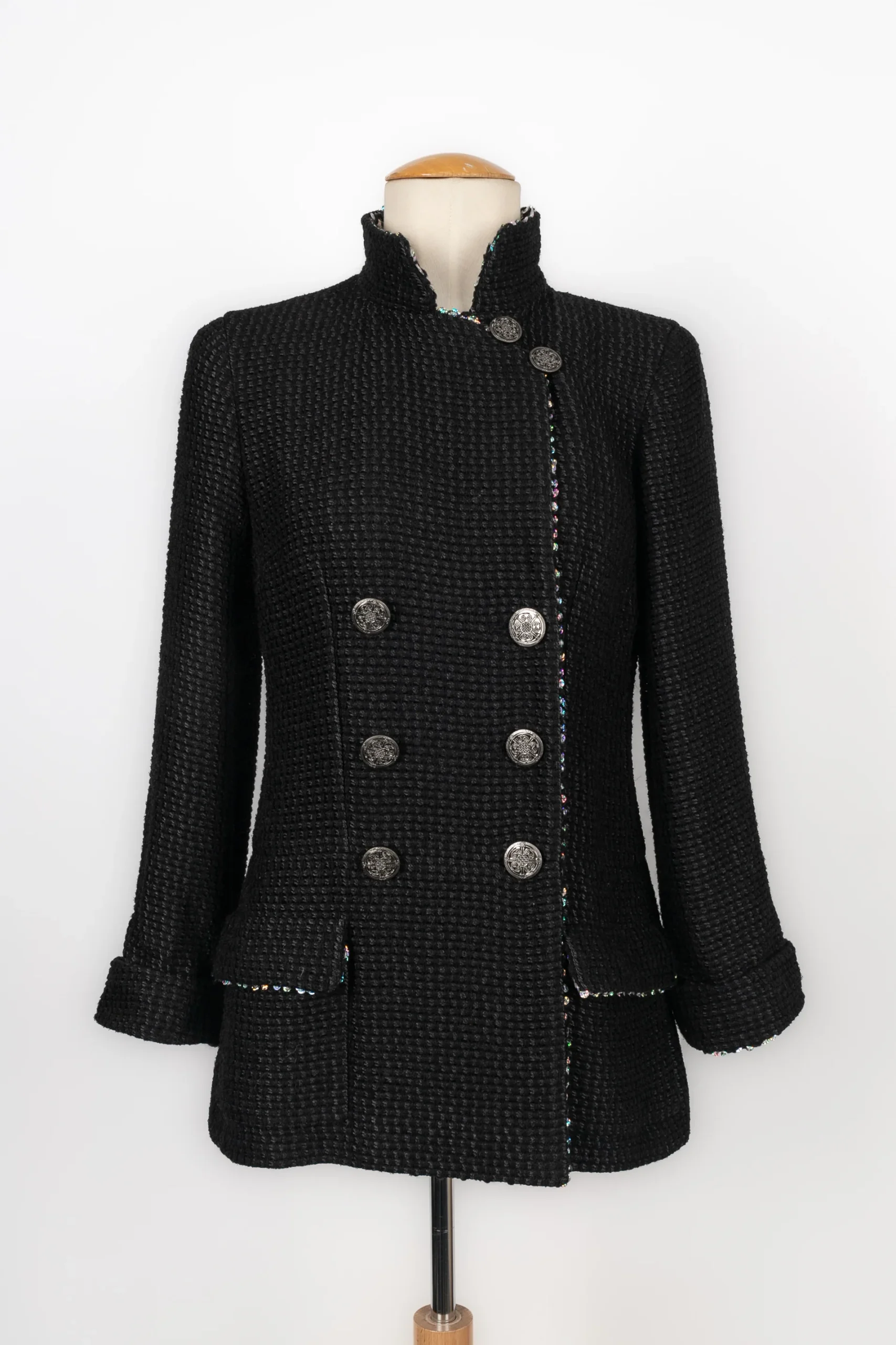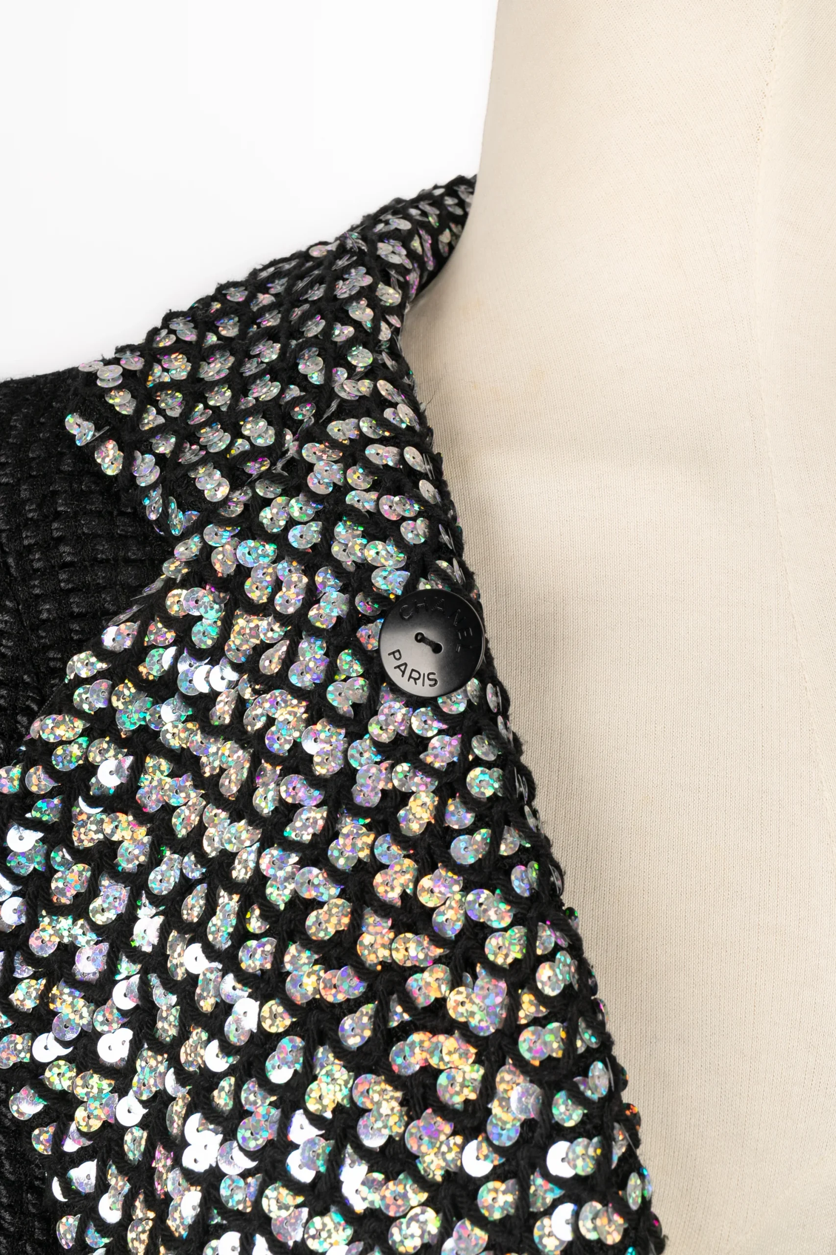 CHANEL -(Made in France) Veste en tweed noir, col en sequins brillants argentés. Taille indiquée 36FR.